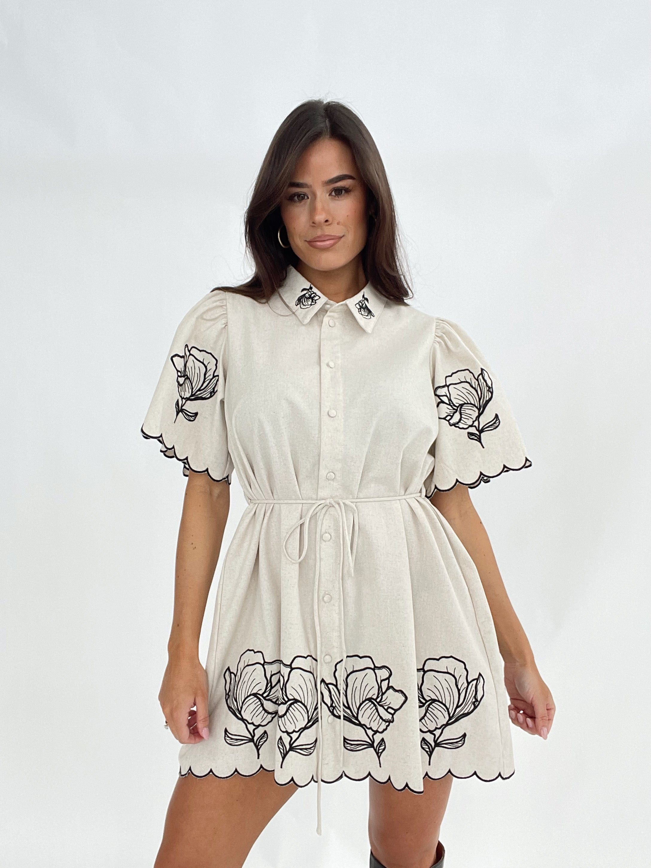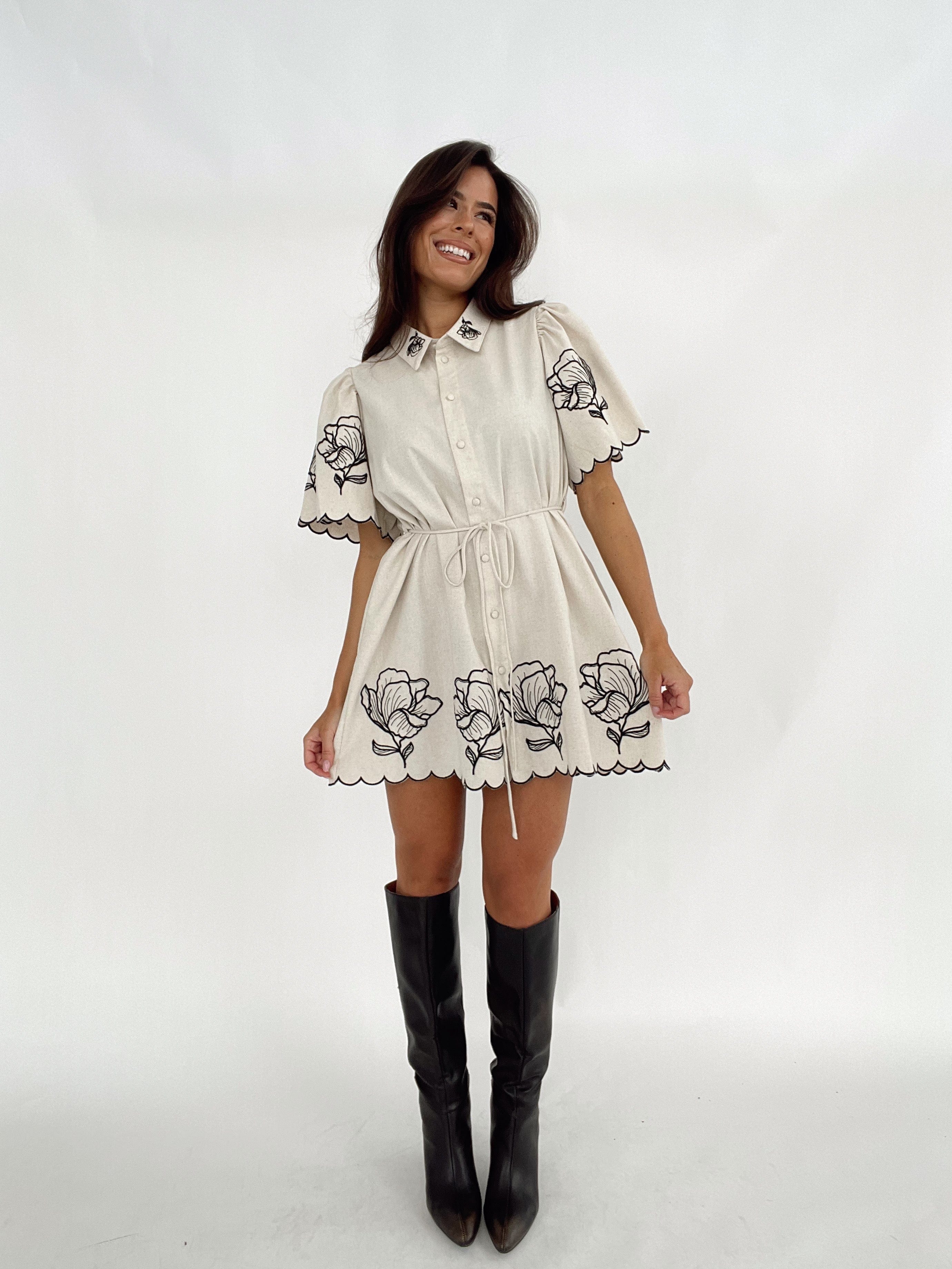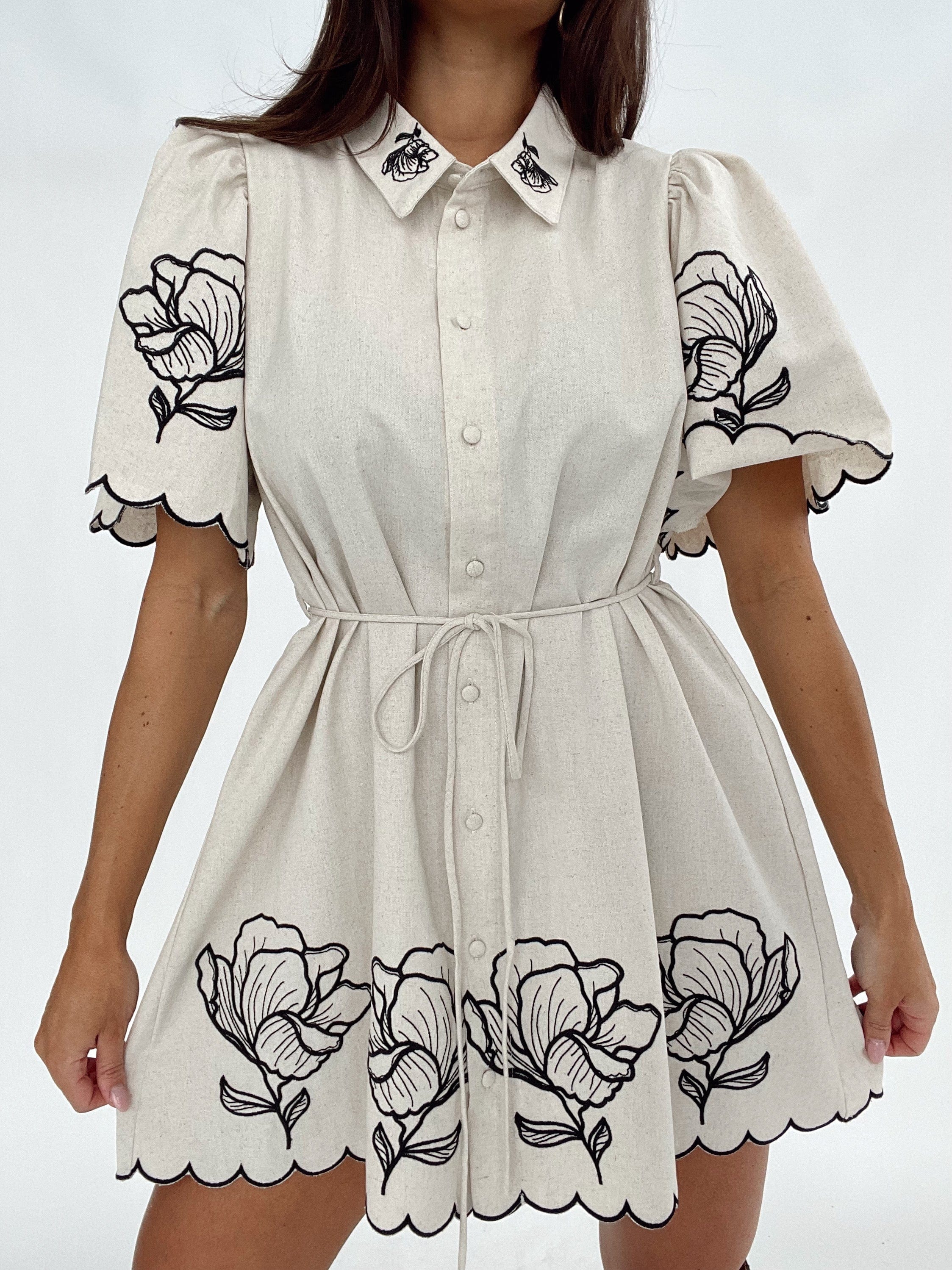 Expertly crafted with a button down closure and tie waist, this Linen Embroidered Shirt Dress offers a flattering silhouette. The intricate embroidered detail adds a touch of charm to this versatile mini dress. Elevate your wardrobe with this stylish and timeless piece.