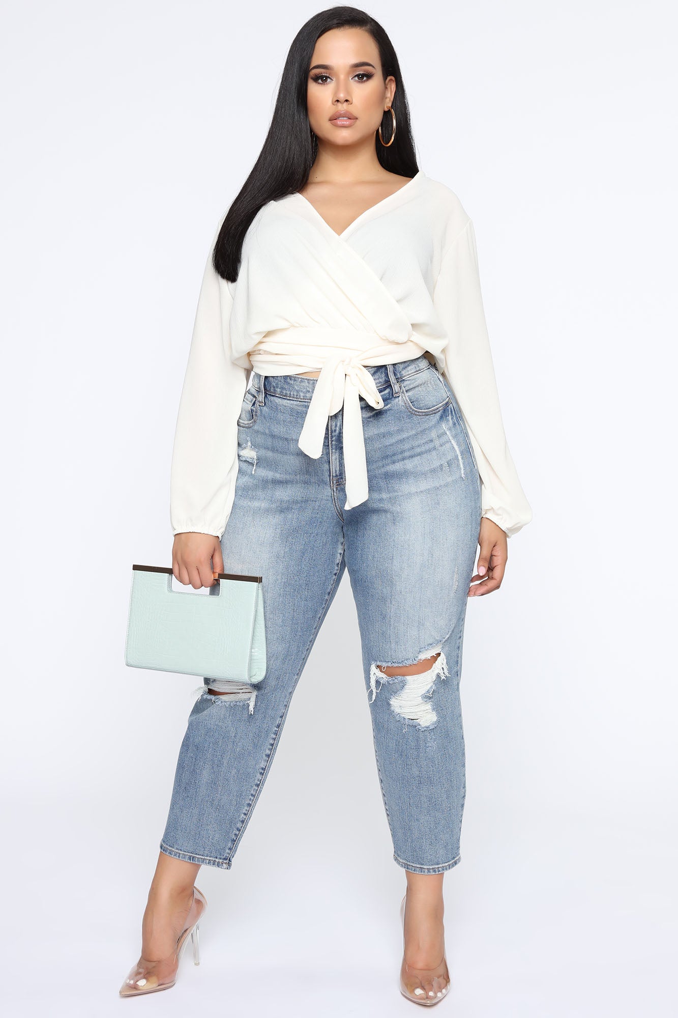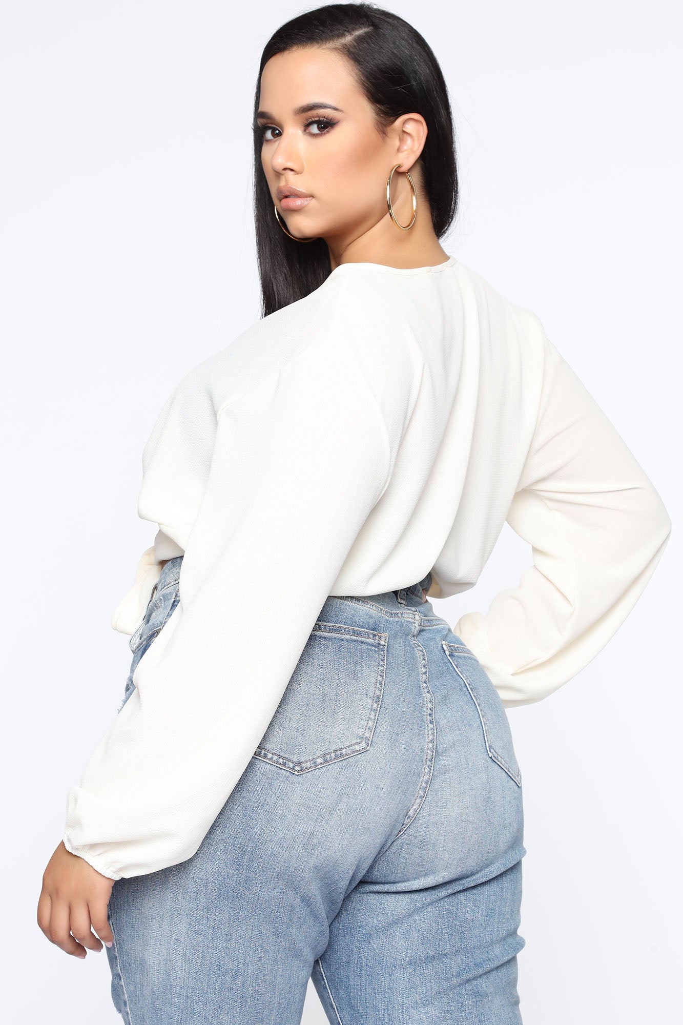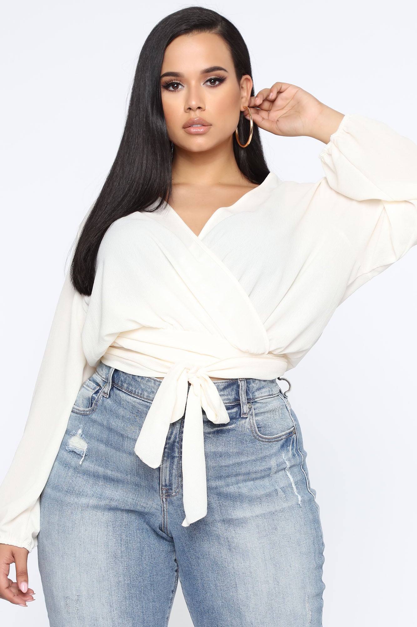 Showa?em who's boss. Our favorite business-chic blouse features a surplice neckline, waist tie detail and long sleeves. Get our Little White Lies Top in Ivory, Burgundy or Black to command attention at your next business meeting.
