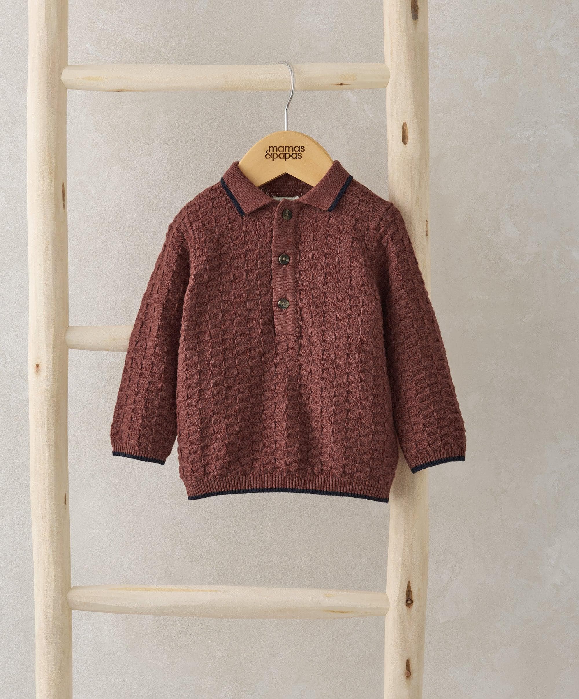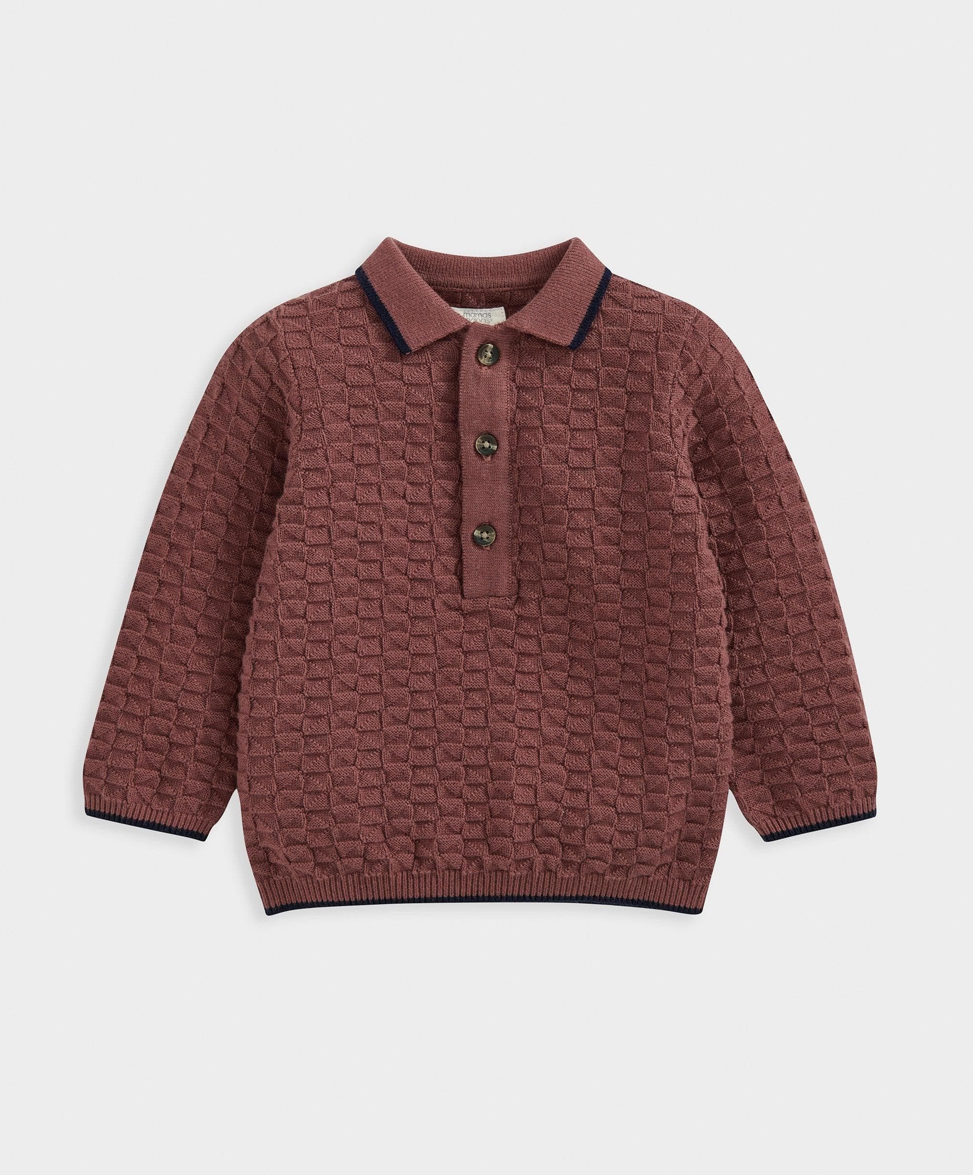 Long-sleeved knit polo with ribbed cuffs and hem. 100% cotton knit
