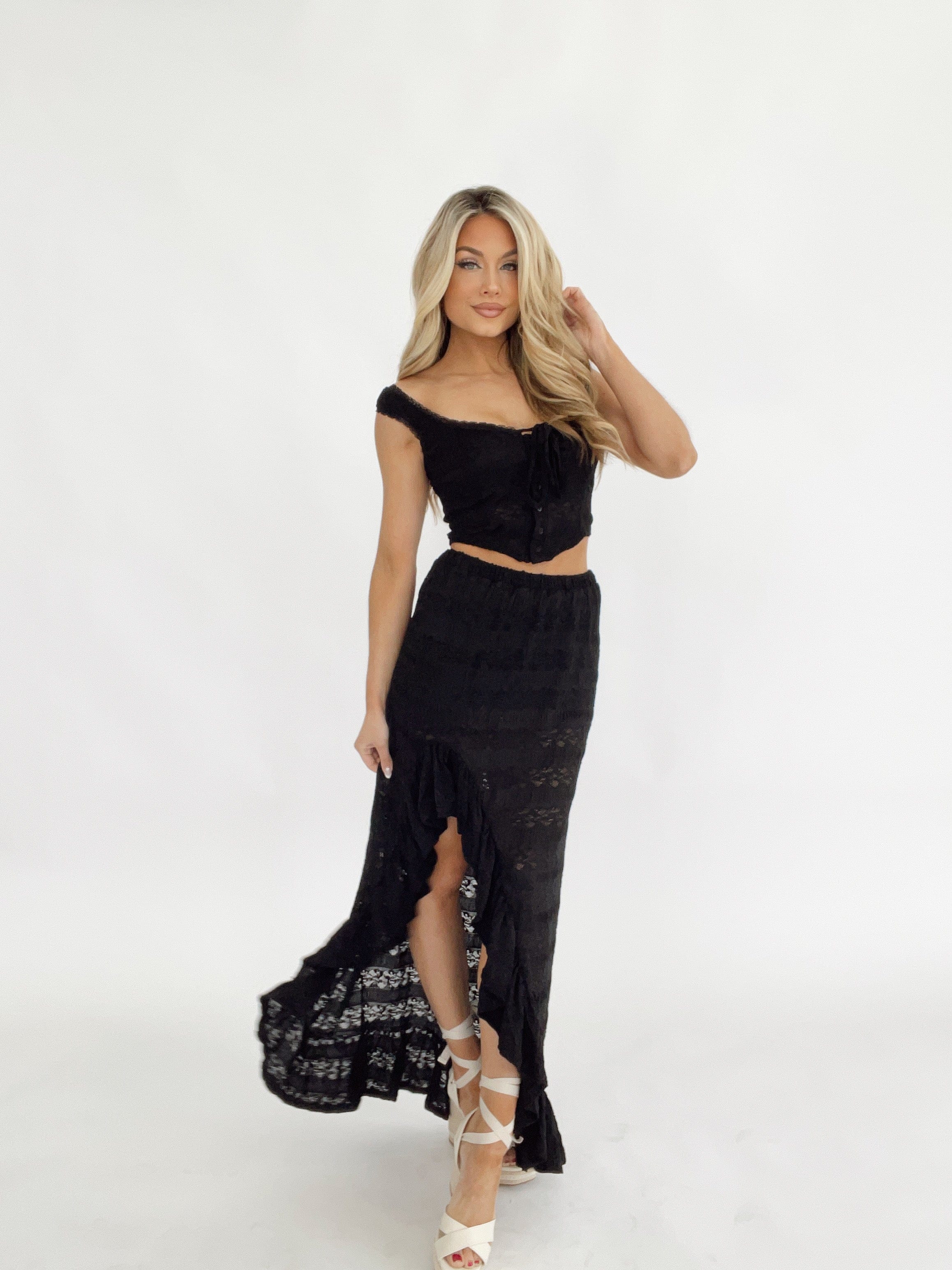 Indulge in sophistication with our Loveliest Lace Maxi Skirt. The soft inner lining and stretchy, high-waisted design provide both comfort and shape. Adorned with lace overlay and ruffled detailing, this maxi skirt is perfectly sheer and sultry. Perfect for a spring or summer dinner or drinks, this elevated and trendy piece exudes sweet style.