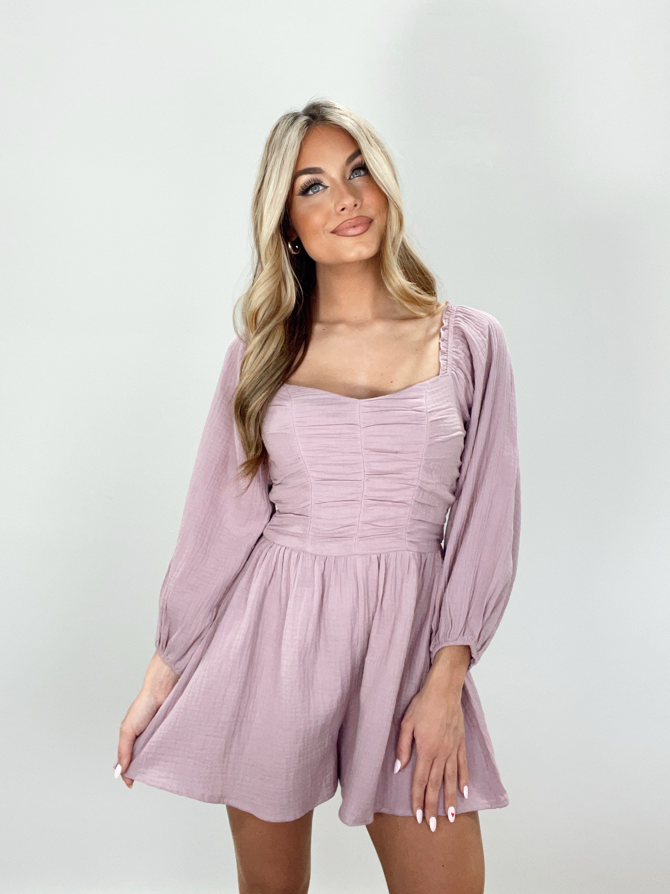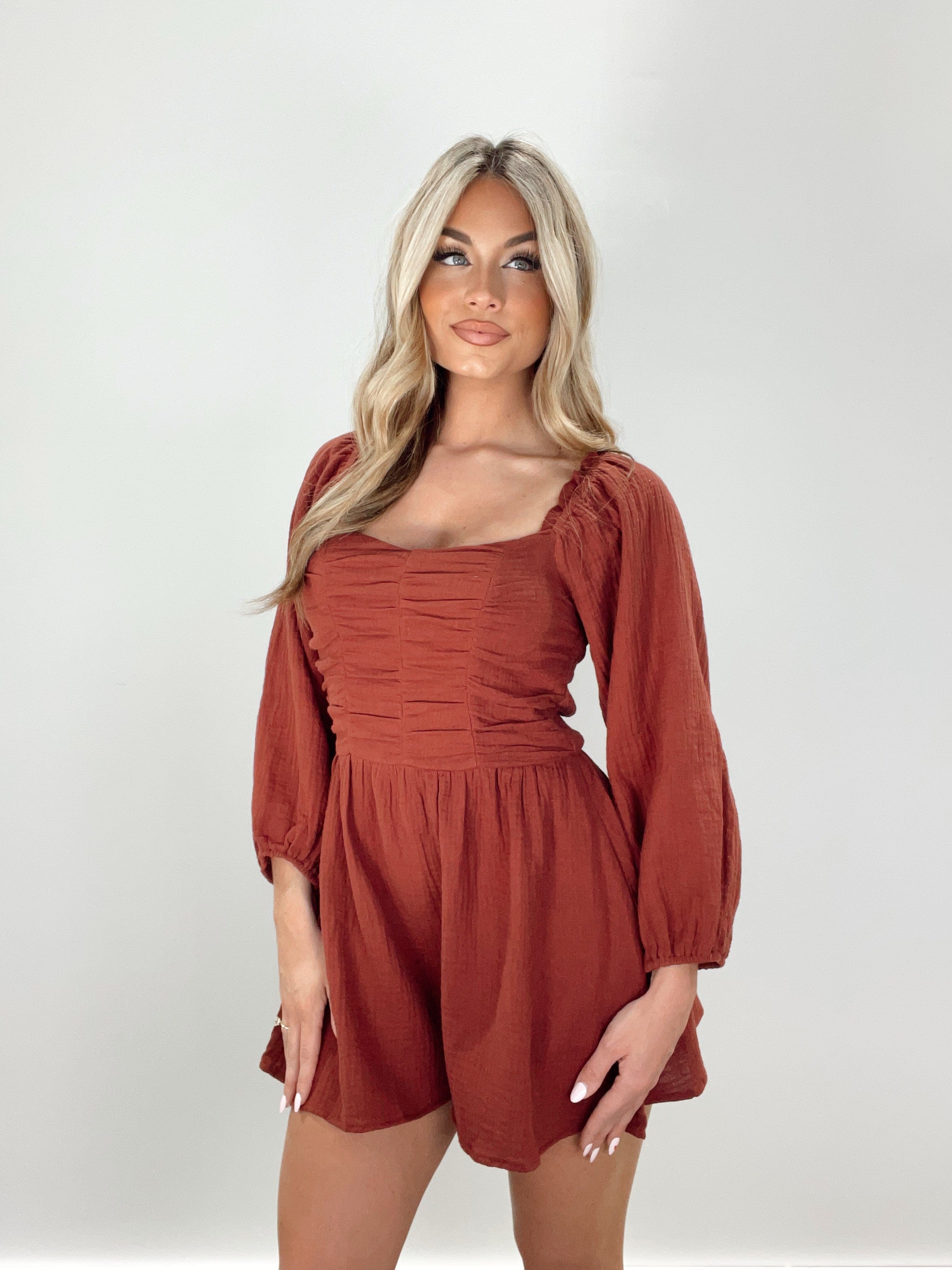 Embrace the season with our Loveliest Time Romper. Featuring balloon sleeves, a square neckline, and ruched detailing, this romper is both elevated and versatile. With a soft inner lining and textured design, it offers both comfort and style, perfect for brunch dates, shopping, or a classy dinner. Sophisticated and chic, it's a must-have for any spring wardrobe.