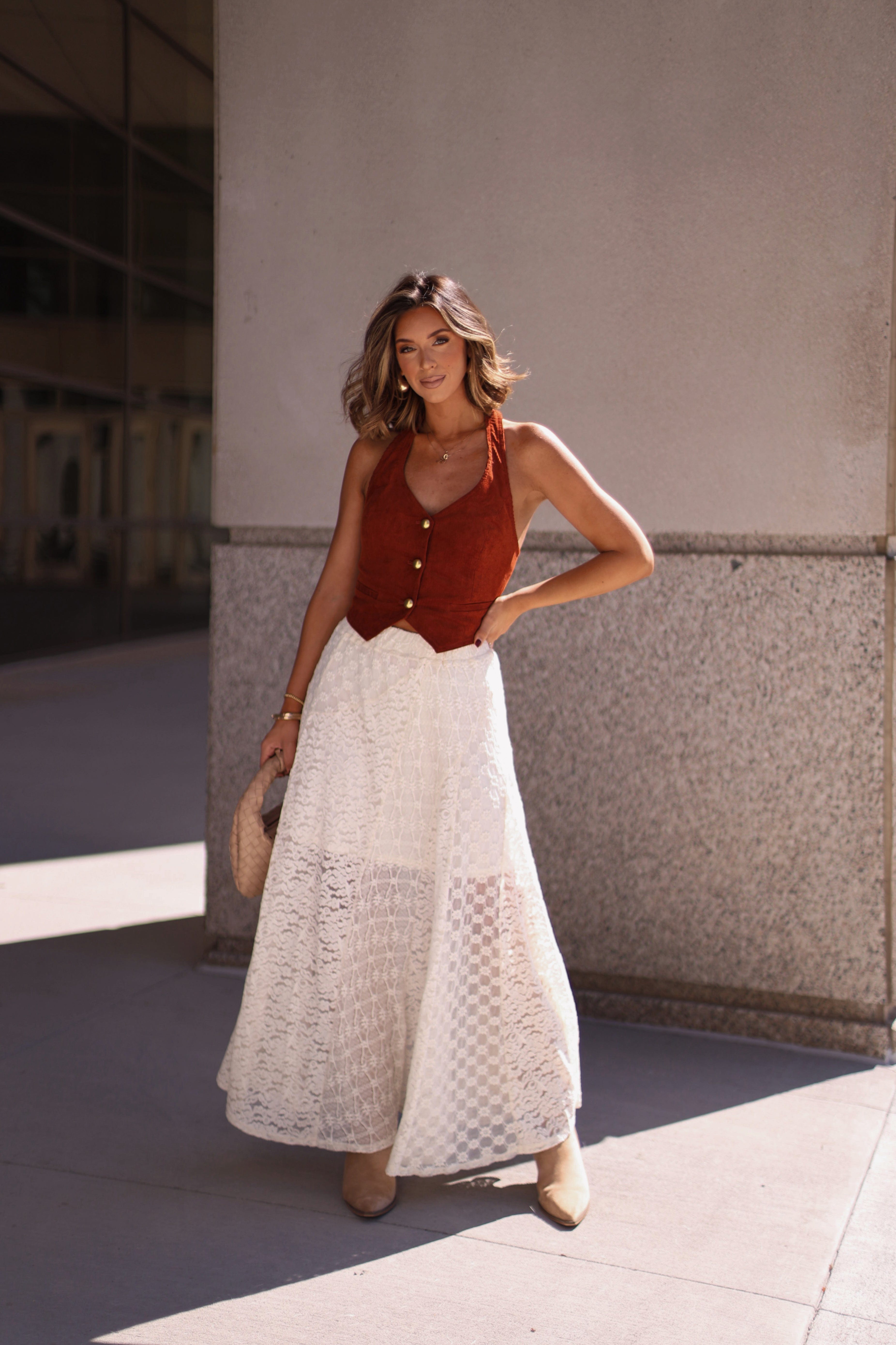This Lovely Lace Maxi Skirt is the perfect addition to any fall wardrobe. Made of cream lace, it pairs well with sweaters for a cozy, yet stylish look. For a touch of western chic, throw on some cowgirl boots. Get ready to turn heads!