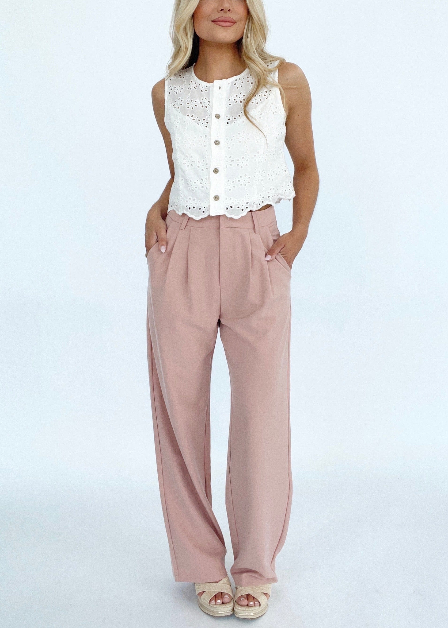 Introducing our woven pants, featuring a flattering pleated design and high-waisted fit for a professional, chic look. Complete with pocket details, button and zipper closure, and a straight leg, these pants offer both style and functionality. Elevate your wardrobe with a pop of color and versatile, sophisticated design that's perfect for work, dinner, or drinks. Experience luxurious comfort and elevated style with these trendy, classy pants.