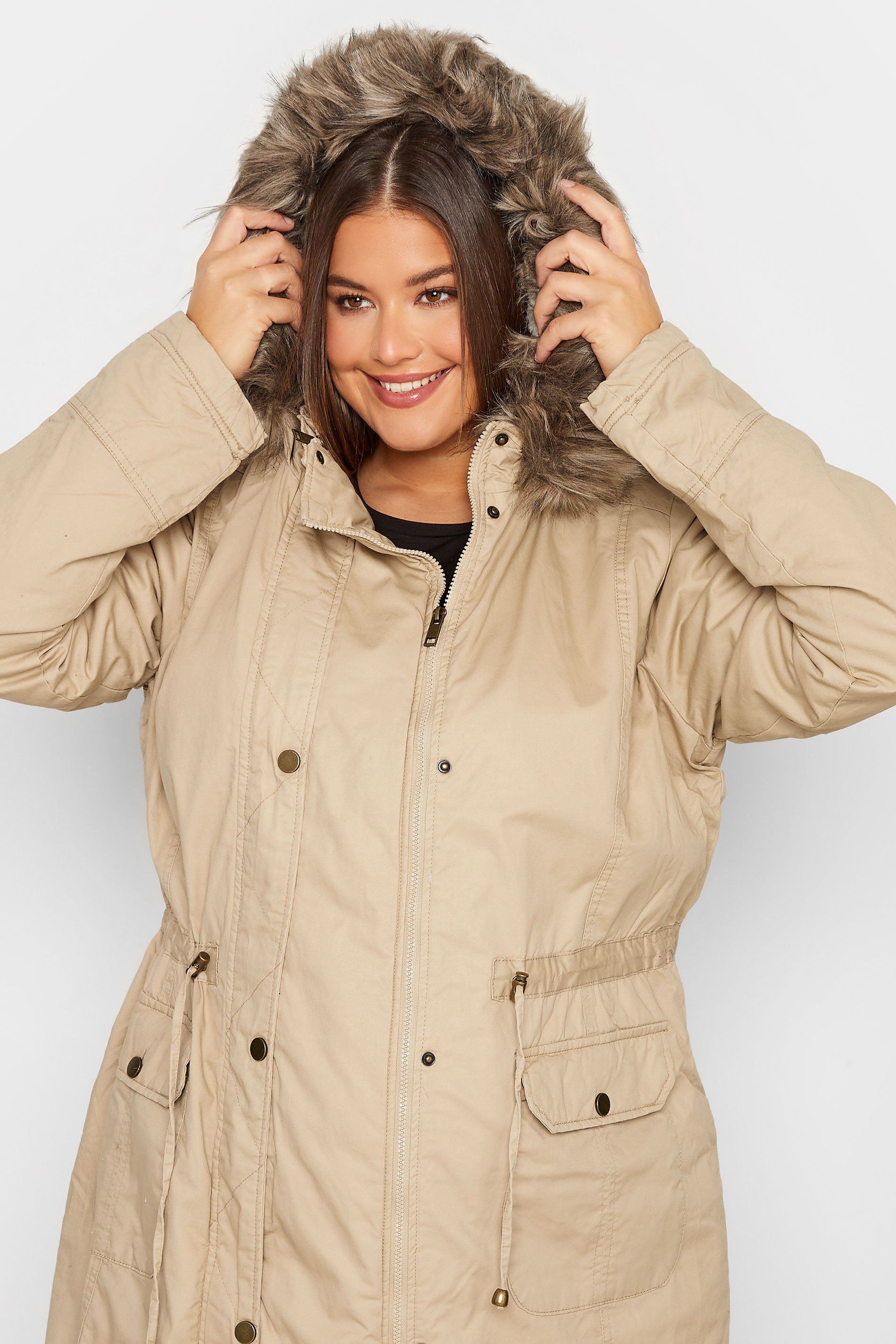 - Hood with detachable fur detail