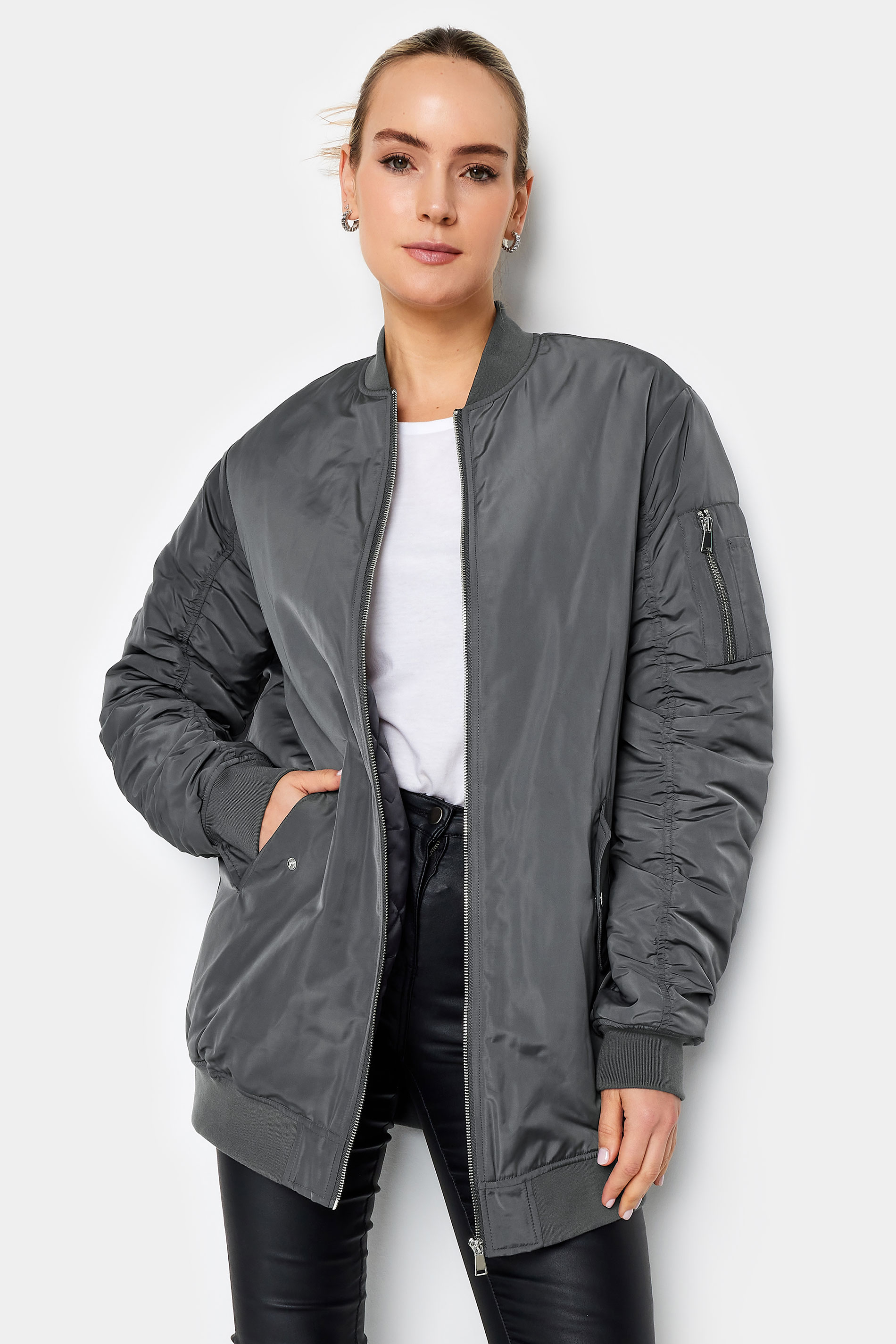 Elevate your outerwear collection with this must-have longline bomber jacket. Made from a comfortable woven fabric, it features a zip fastening with side pockets and ruched detailing. Layer over jeans and a t-shirt for a stylish and effortless daytime look.