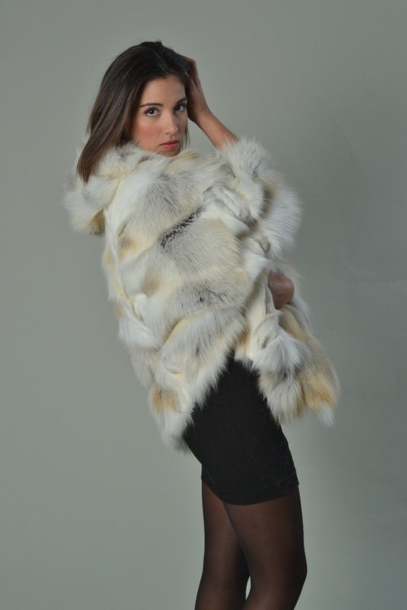 A natural golden fox fur coat . Made of pelts coming directly fromnorthern Finland . Thearctic circle climate provides the ideal condition for super long haired pelts of high density and incomparable hair quality . This fur coat is brand new ,silky , plush and supple .