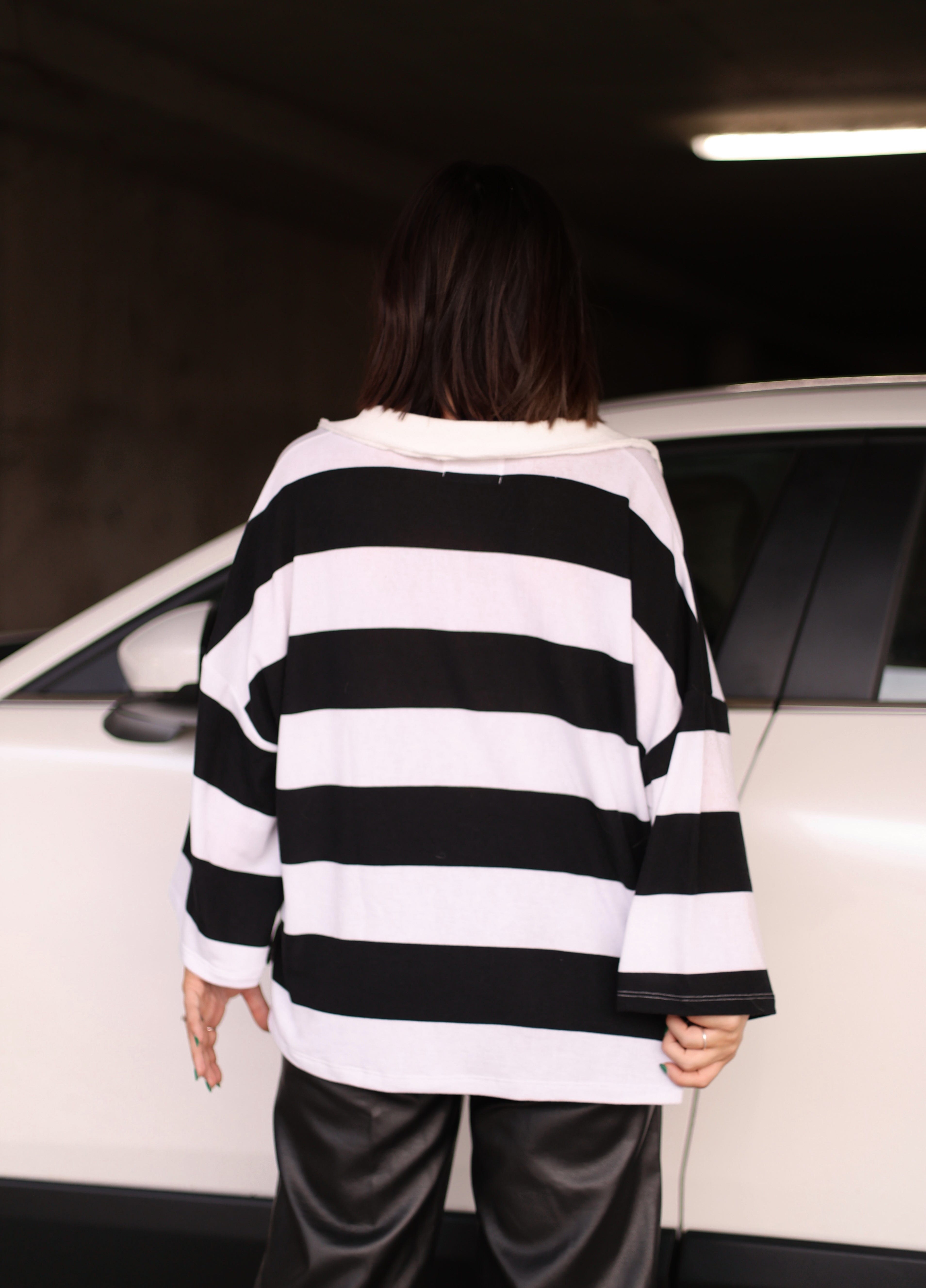 This Match Day Striped Top evokes sophisticated and refined style. Its ultra-soft and stretchy fabric is ideal for any occasion, whether lounging or running errands. Featuring a collared neckline, v neckline, dropped shoulders, side slit details, pocket detail, and wide sleeves, this neutral-hued rugby top is the perfect combination of fashion-forward design and comfort.