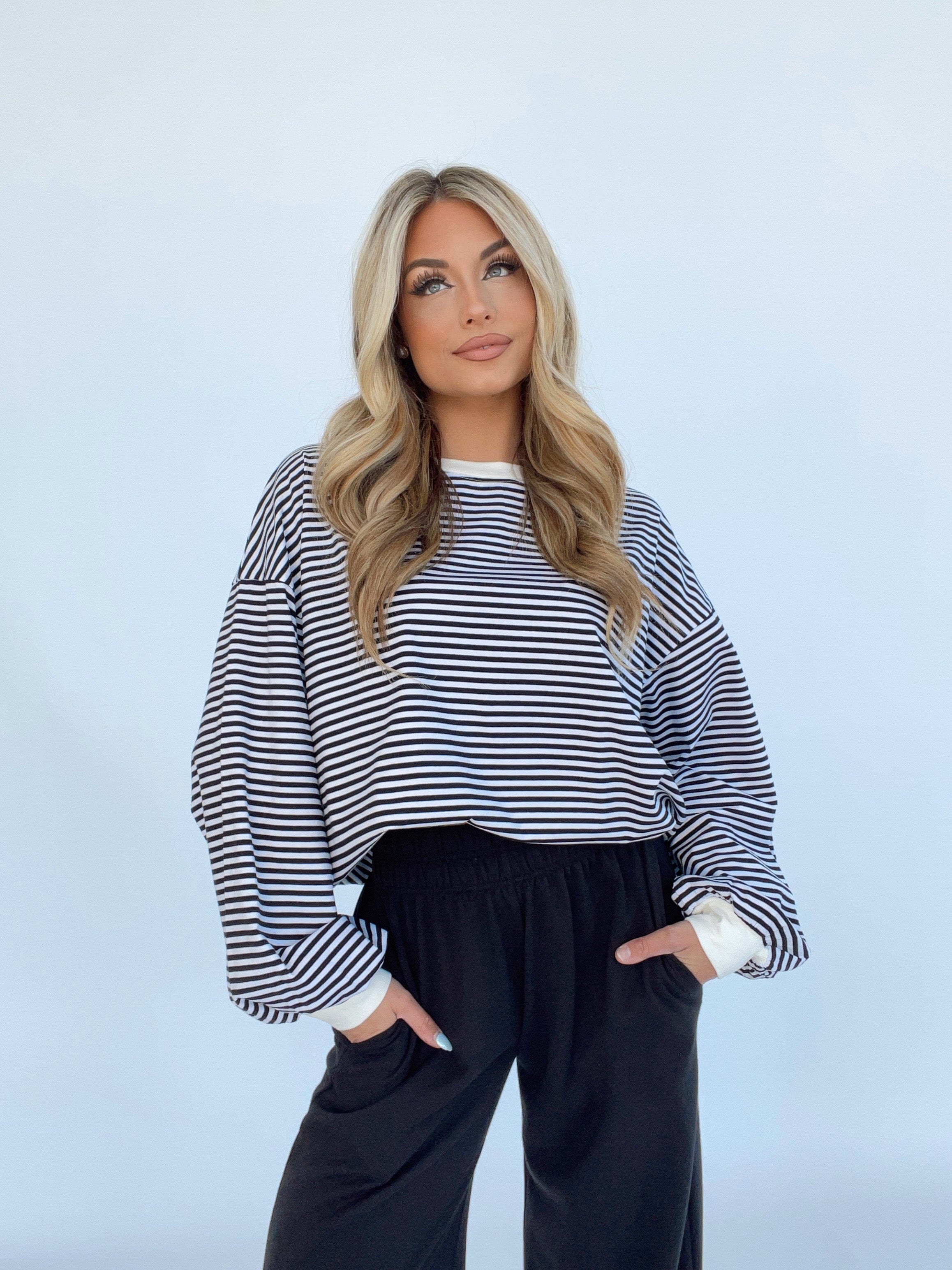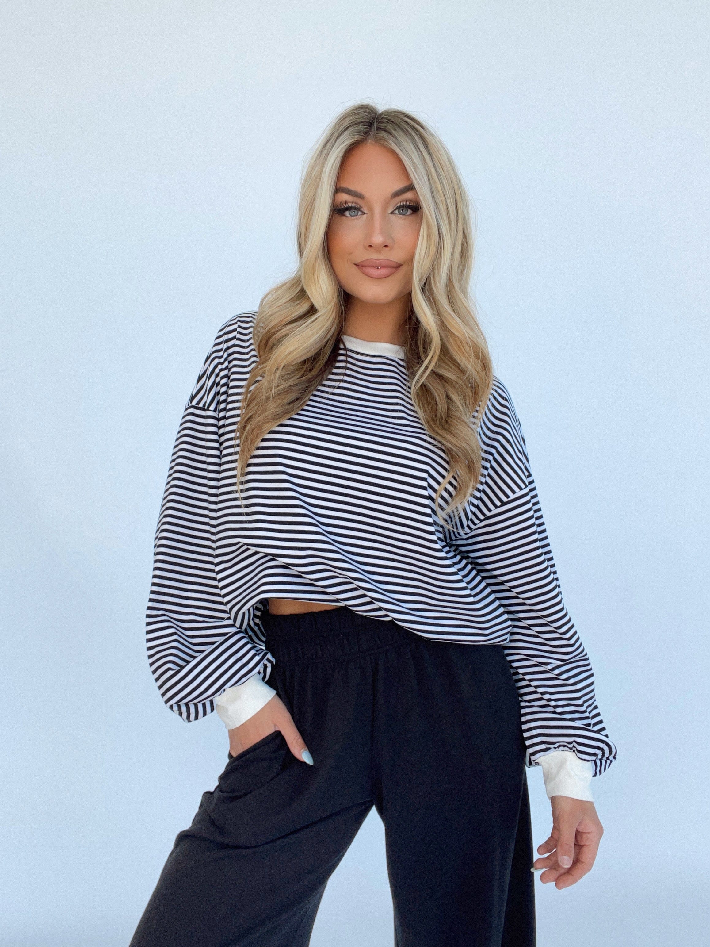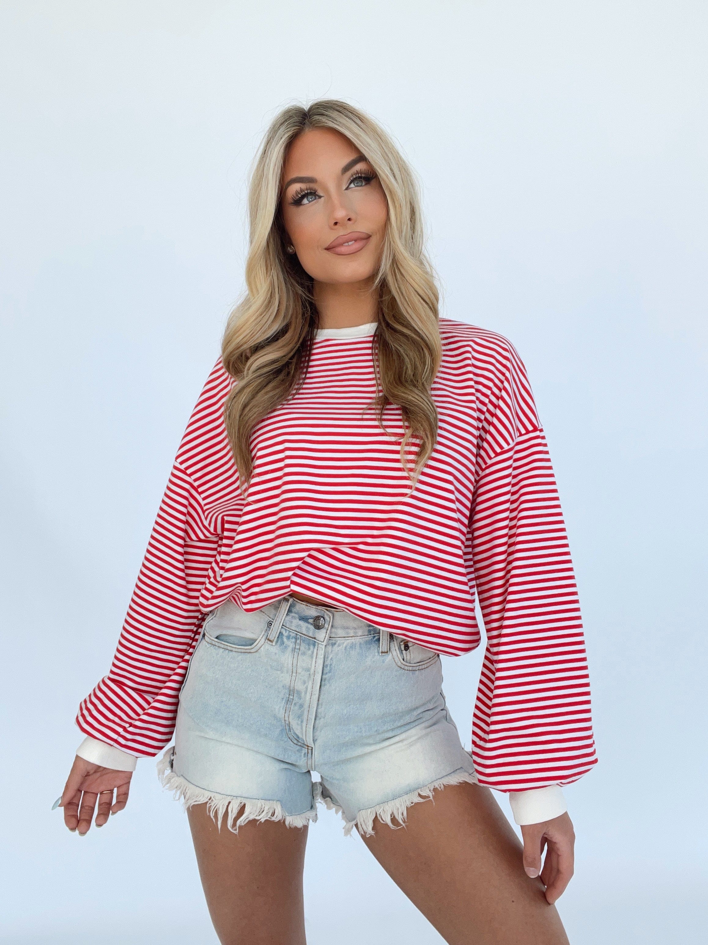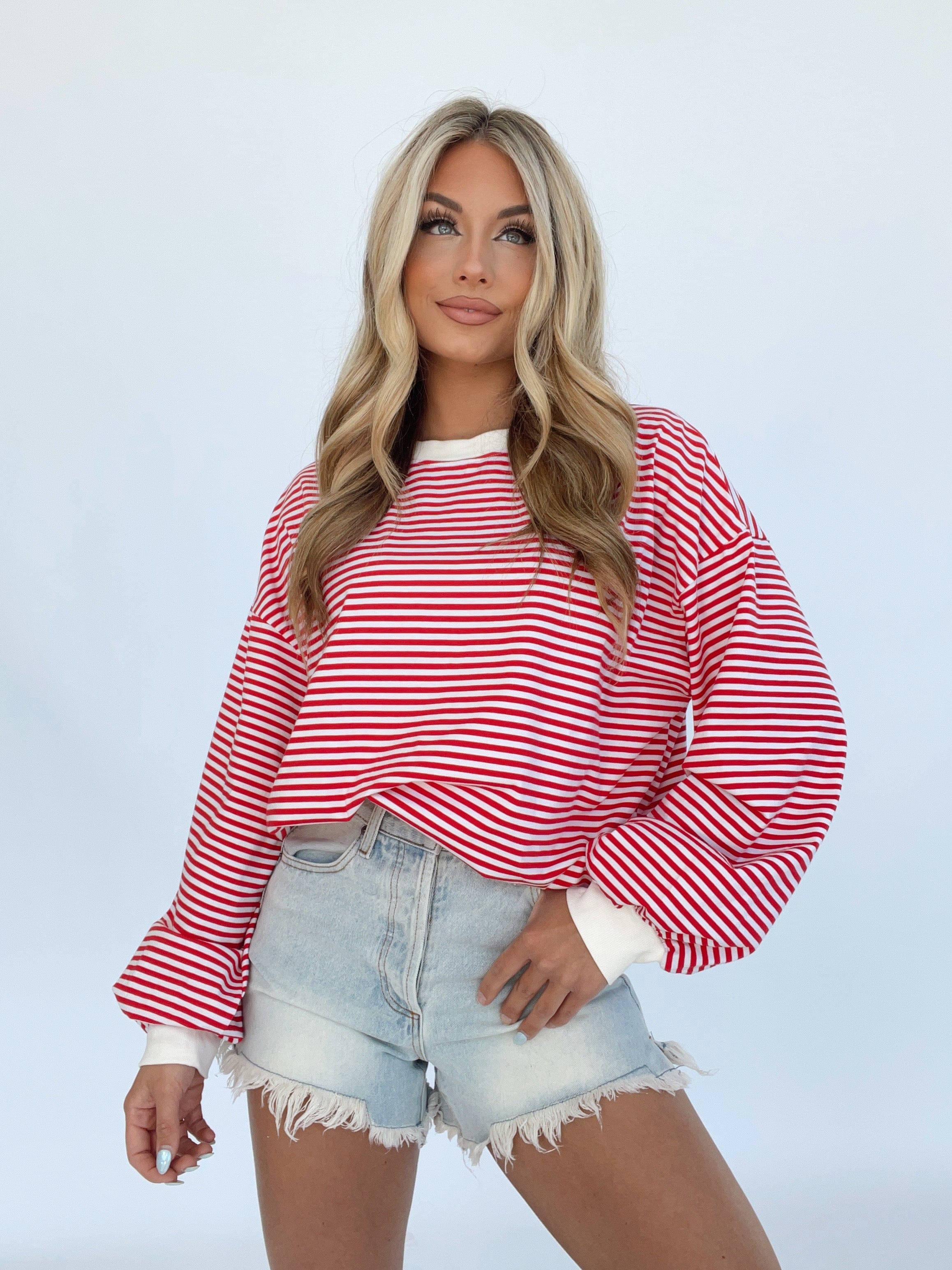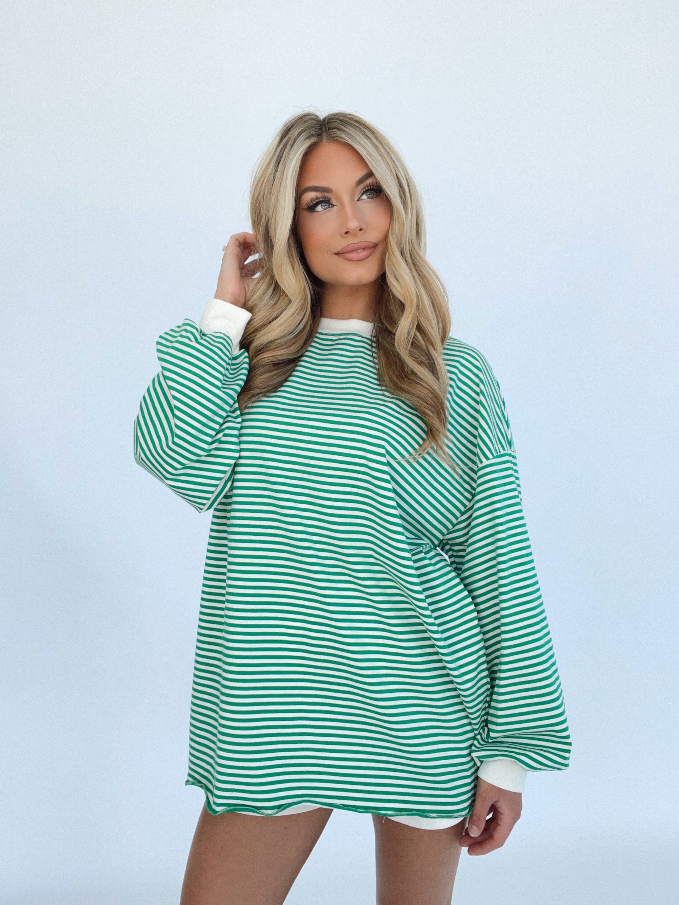 Indulge in elevated comfort and style with our Striped Tunic Top. The rounded neckline, oversized fit, and drop shoulders provide a trendy and versatile look for lounging or shopping. The soft and stretchy fabric and balloon sleeves add a luxurious touch. Perfect for spring and summer, this top will bring a bold pop of color to your wardrobe.