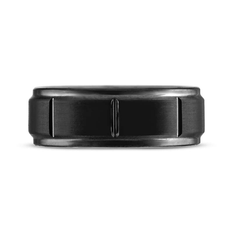 This sleek and stunning wedding band speaks to his sense of style and is a remarkable way to say your vows. Crafted in black ion-plated tungsten, this commanding 8mm band showcases rectangular segments, stepped edges and a brushed finish.