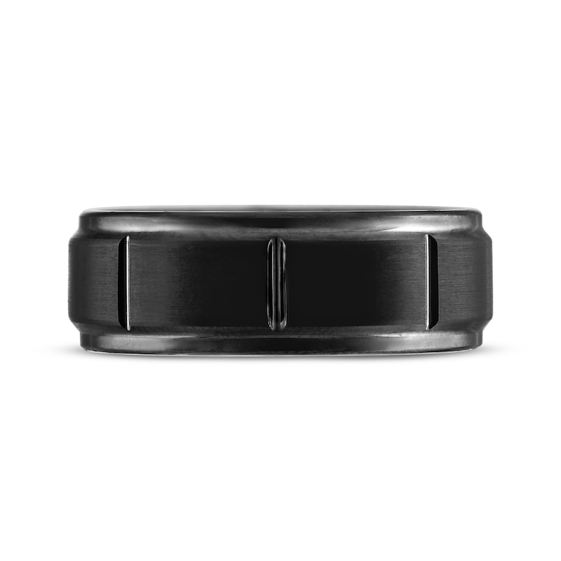 This sleek and stunning wedding band speaks to his sense of style and is a remarkable way to say your vows. Crafted in black ion-plated tungsten, this commanding 8mm band showcases rectangular segments, stepped edges and a brushed finish.