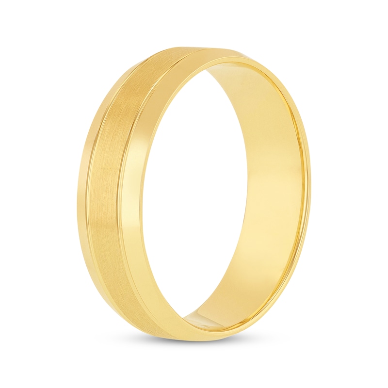 This classic wedding band is styled in timeless 10K yellow gold. A stripe of brushed texturing adds a unique and eye-catching detail to the handsome design.