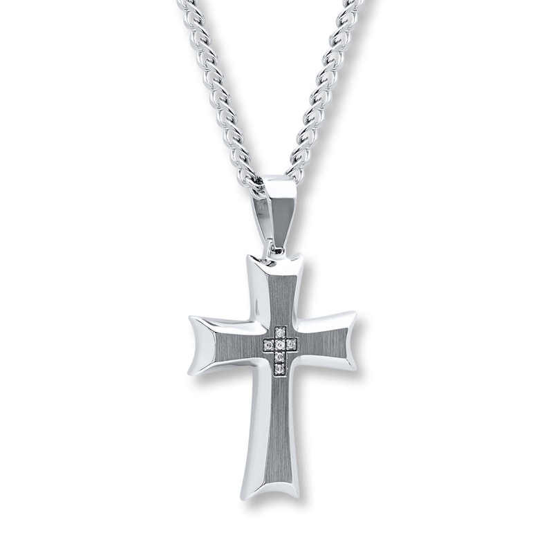 Twinkling round diamonds accent the center of this handsome men's cross necklace. Crafted of stainless steel, the pendant has a total diamond weight of 1/20 carat and suspends from a 24-inch curb chain that secures with a lobster clasp.