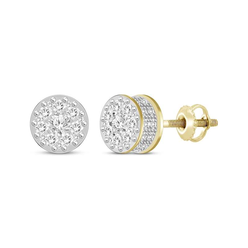 Sparkle from every angle with these stunning stud earrings. Set in timeless 10K yellow gold, brilliant round diamonds sparkle along the front and sides of each earring. The earrings have a total diamond weight of 1/2 carat and secure with screw backs.