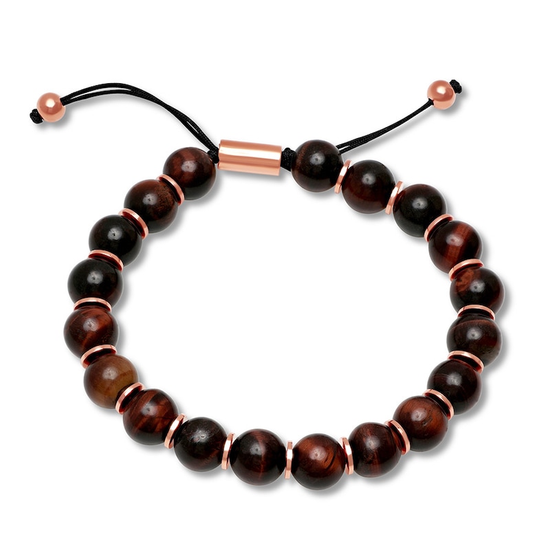 Tiger's eye quartz beads alternate with rose-gold-tone stainless steel plates in this distinctive bracelet for him. The bracelet adjusts up to 9.5 inches with the sliding bolo clasp.