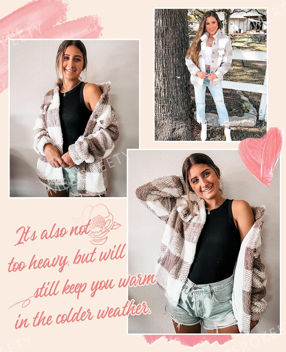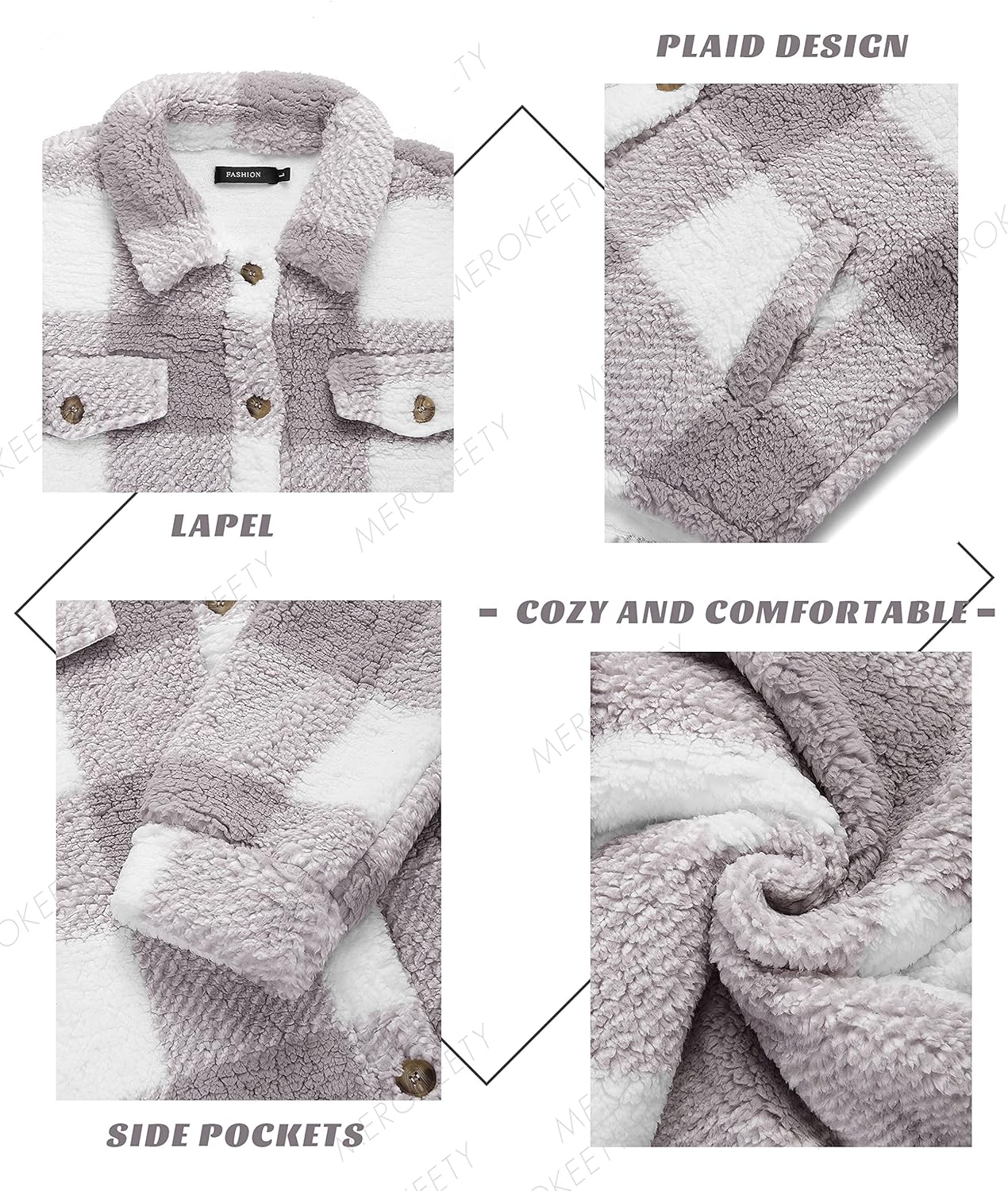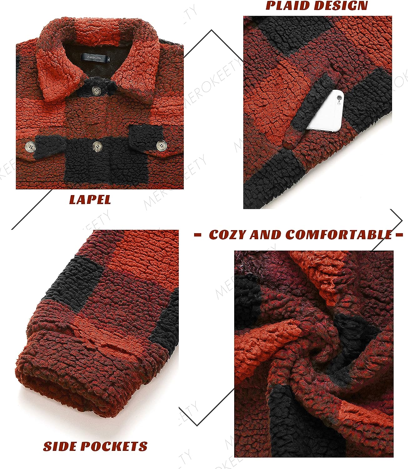 - Unique design: Classic plaid design, button down, long sleeves, two side pockets, fuzzy fleece, lapel, round hemline on back, faux shearling jacket, casual and relaxed fit.
