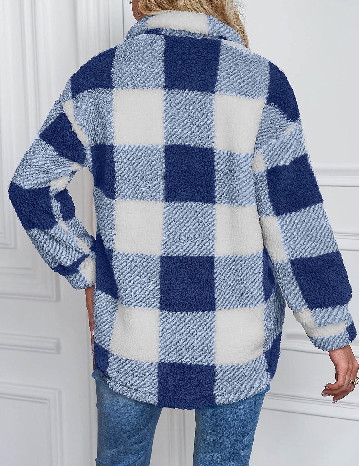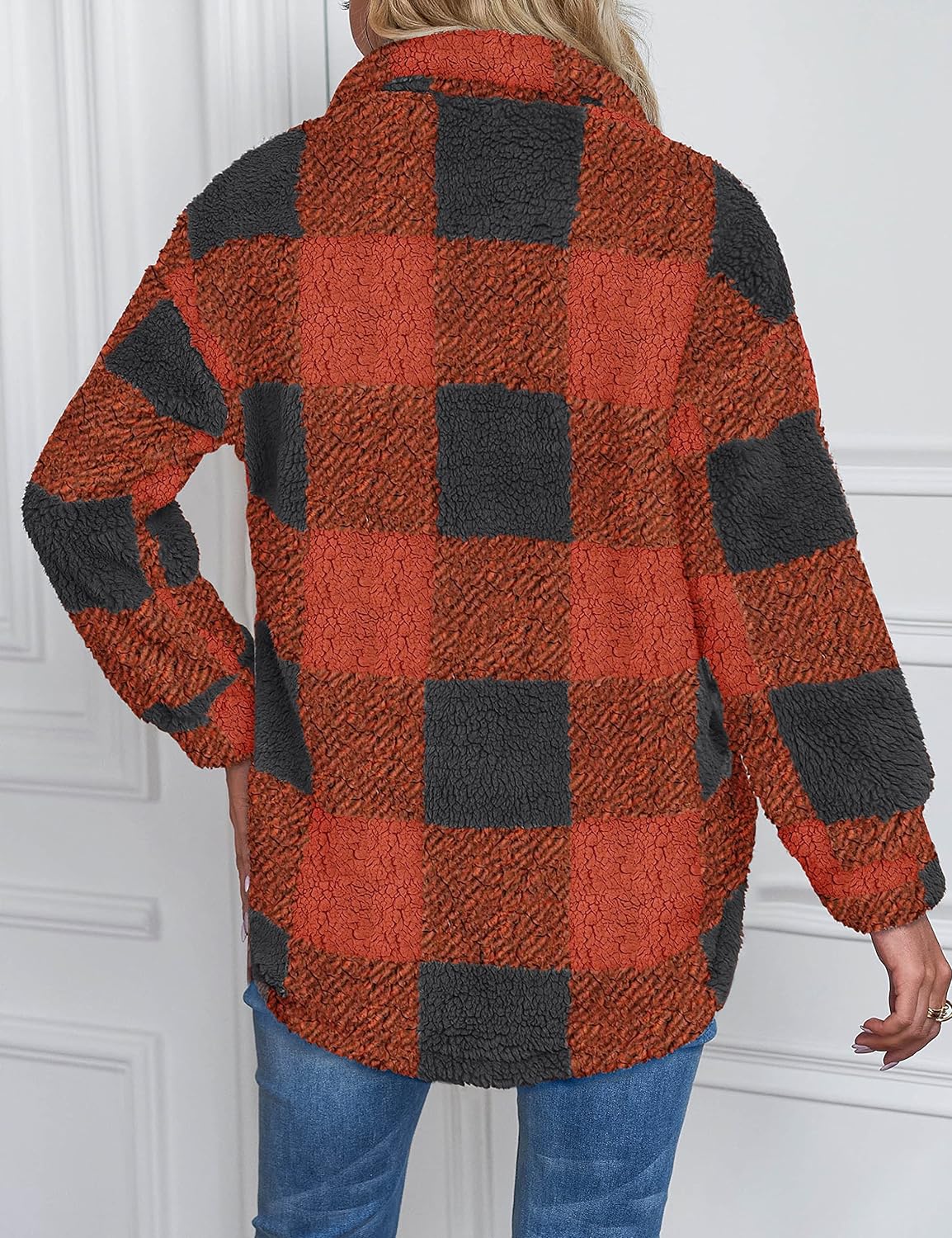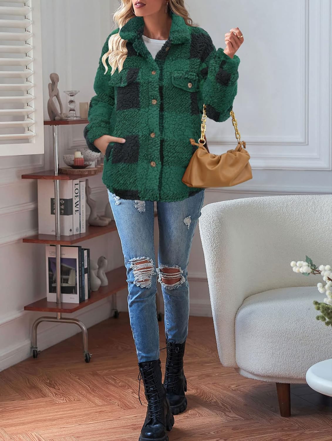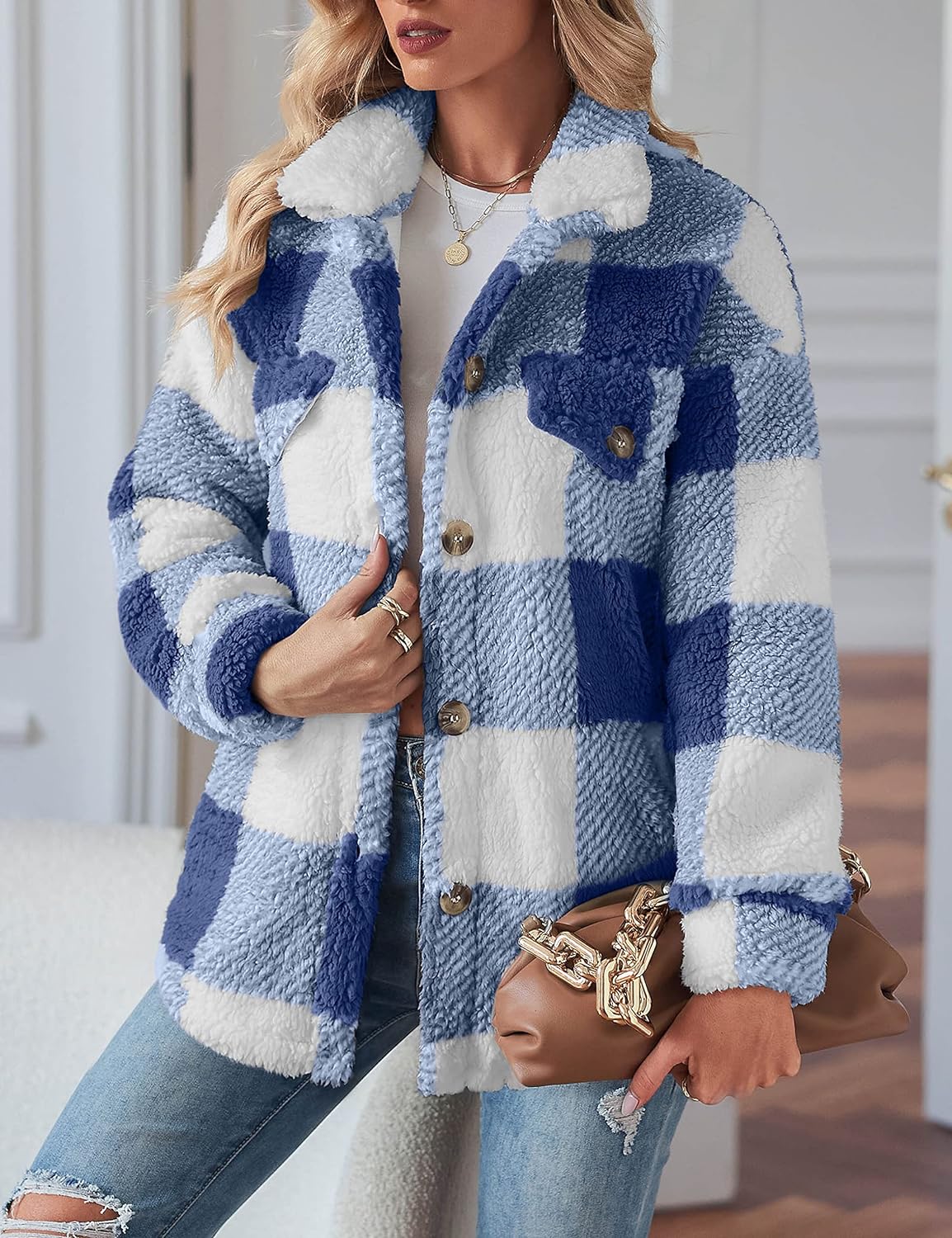 - Unique design: Classic plaid design, button down, long sleeves, two side pockets, fuzzy fleece, lapel, round hemline on back, faux shearling jacket, casual and relaxed fit.