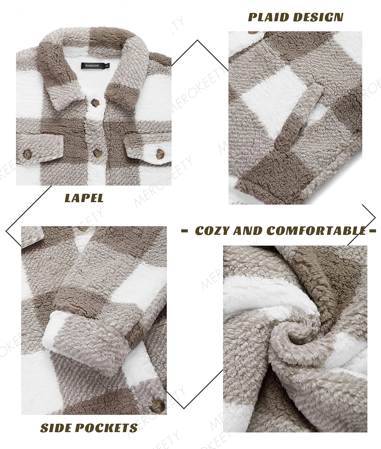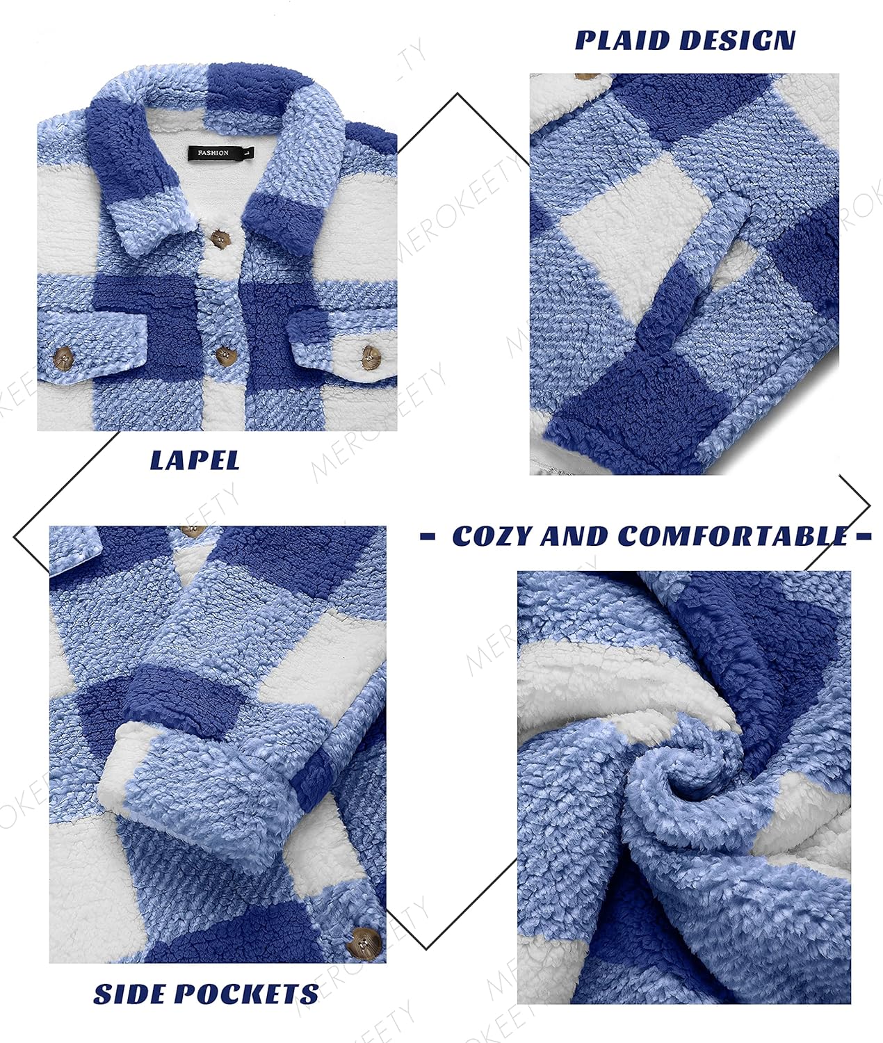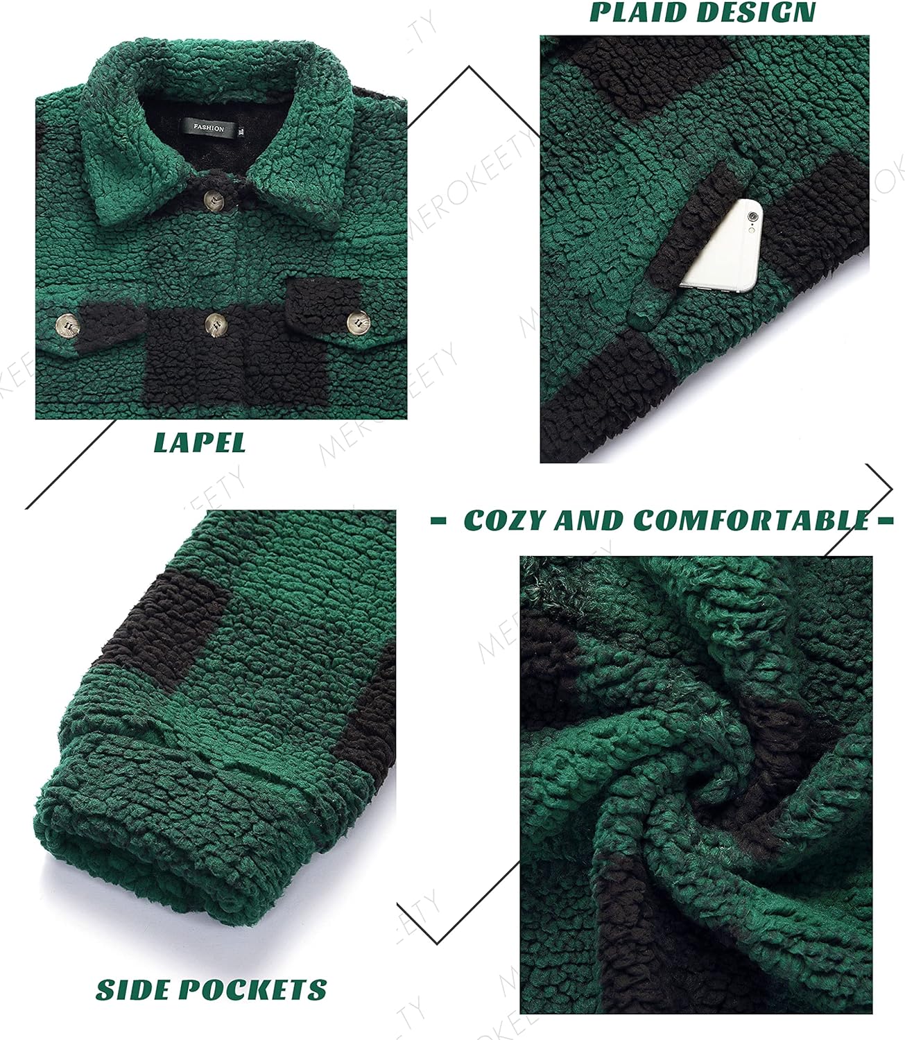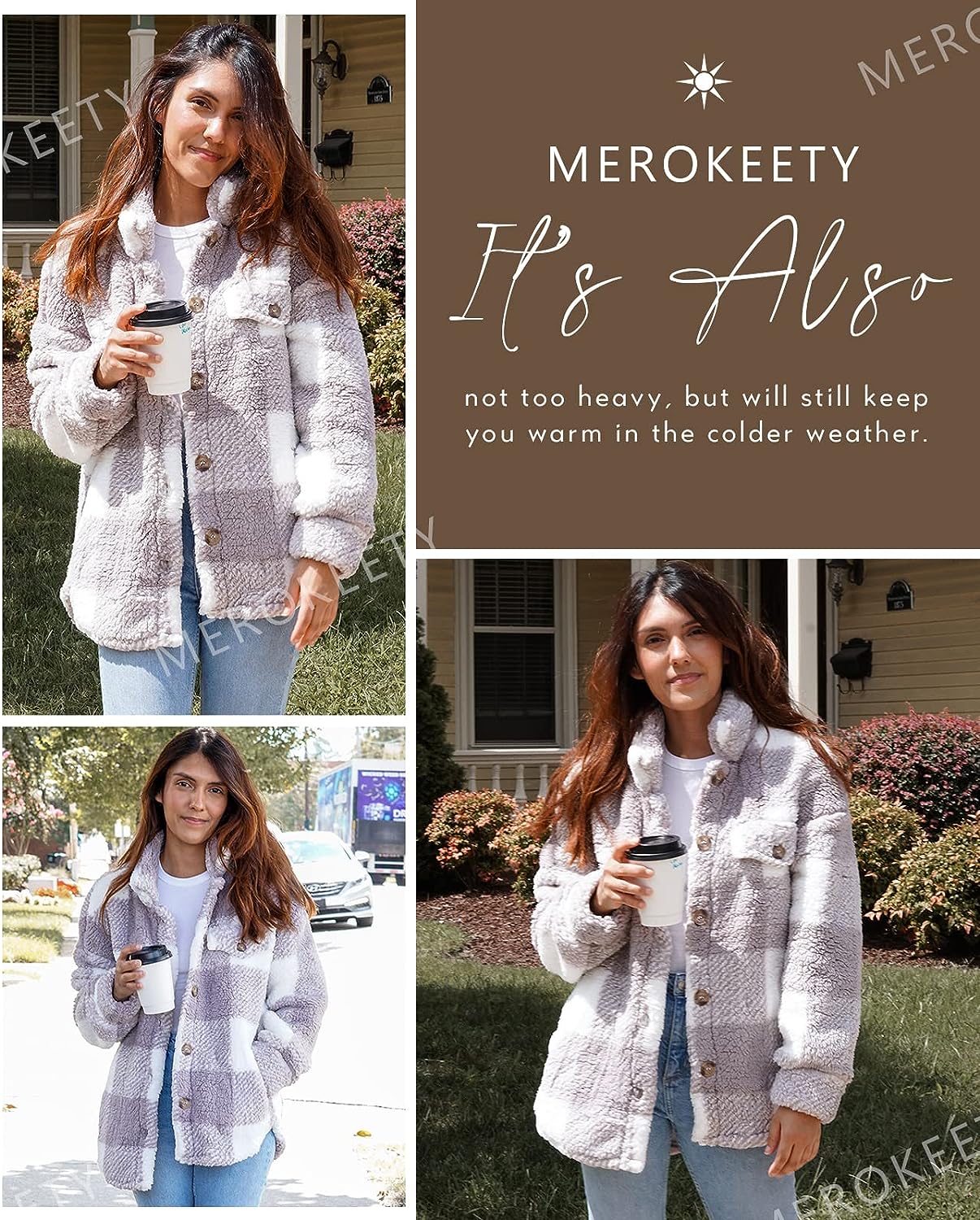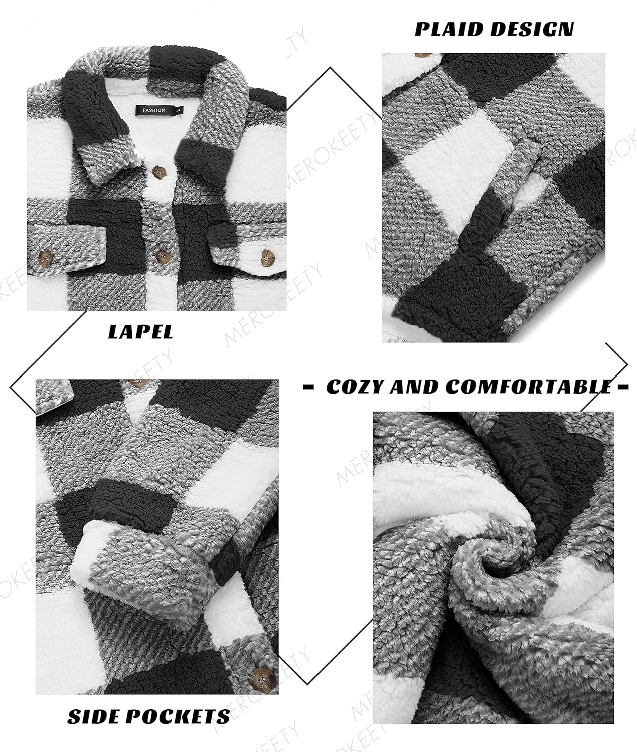 MEROKEETY Women's Fuzzy Fleece Jacket Button Down Plaid Sherpa Outerwear