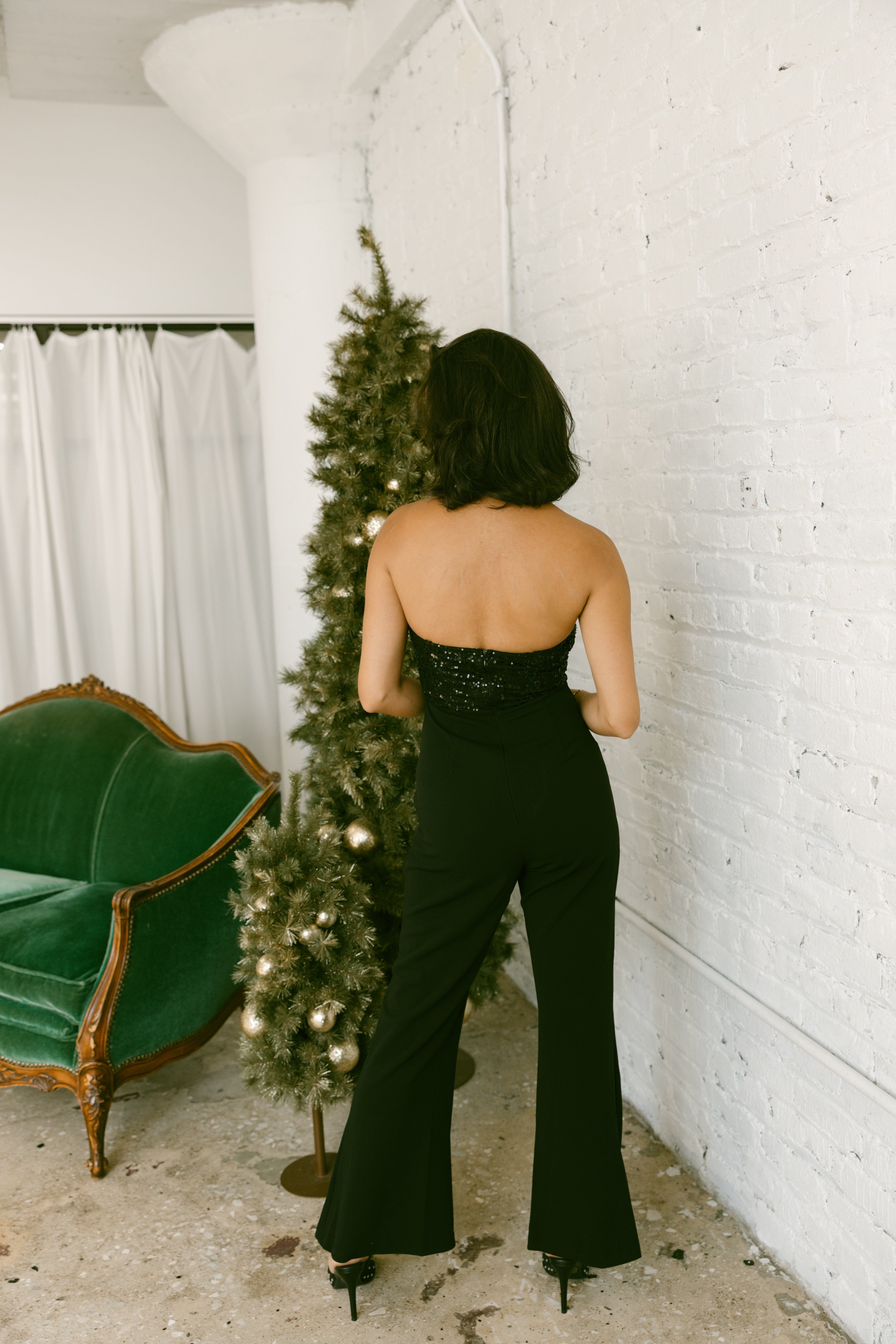 This Midnight Lining Jumpsuit is the perfect holiday season outfit, with its flattering jumpsuit design and elegant zipper closure in the back. The removable straps add versatility and style, making it a must-have for any New Year's celebration.
