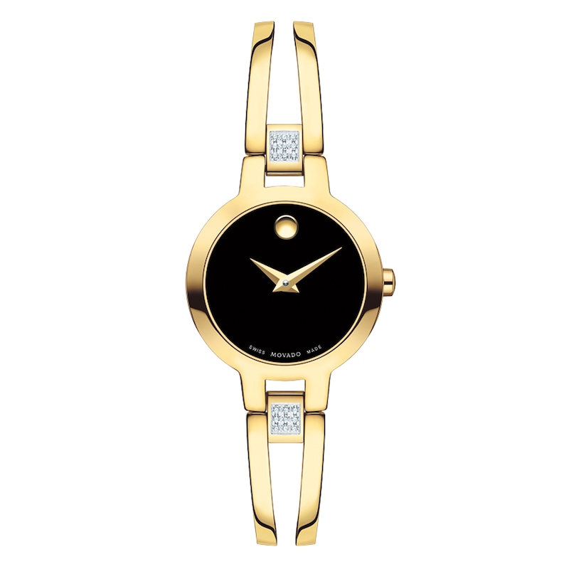 This chic Amorosa women's watch from Movado showcases a black Museum dial with a yellow-gold-tone dot and hands set in a 24mm yellow-gold-tone PVD-finish stainless steel case topped with a sapphire crystal. Diamonds accent the yellow-gold-tone PVD-finish stainless steel double-bar bangle-style bracelet that includes back sizing links and secures with a jewelry clasp. The watch features a Swiss quartz movement and is water-resistant to 30 meters.