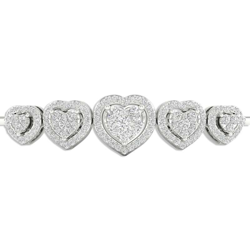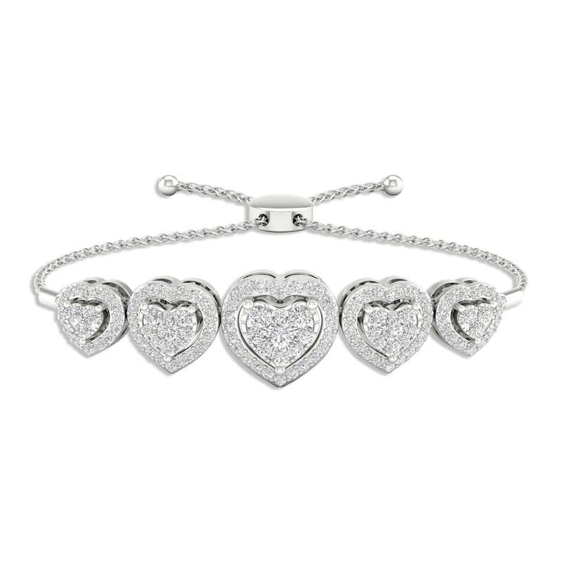 A sweet and sparkling gift for someone you adore, this bolo bracelet features five heart-shaped clusters of dazzling round-cut diamonds, each framed by more round diamonds to stunning effect. The bracelet is crafted in iconic 10K white gold and has a total diamond weight of 1/2 carat. The wheat chain adjusts up to 9.5 inches and secures with a sliding bolo clasp.