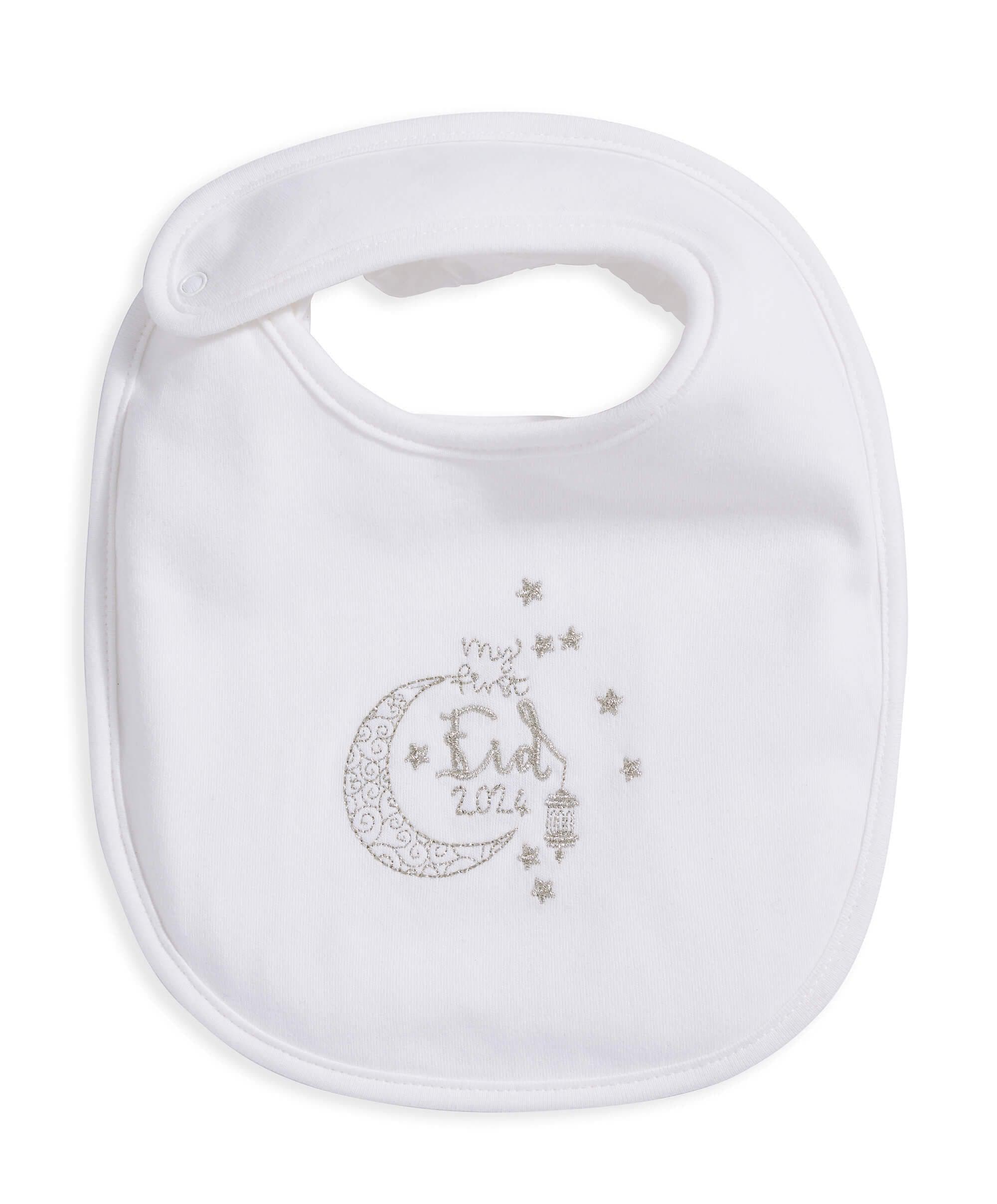 Dual-sided jersey bib embroiderd with 'My 1st Eid' detail. Popper fastening for easy adjusting. Terry towelling on reverse, to mop up spills!