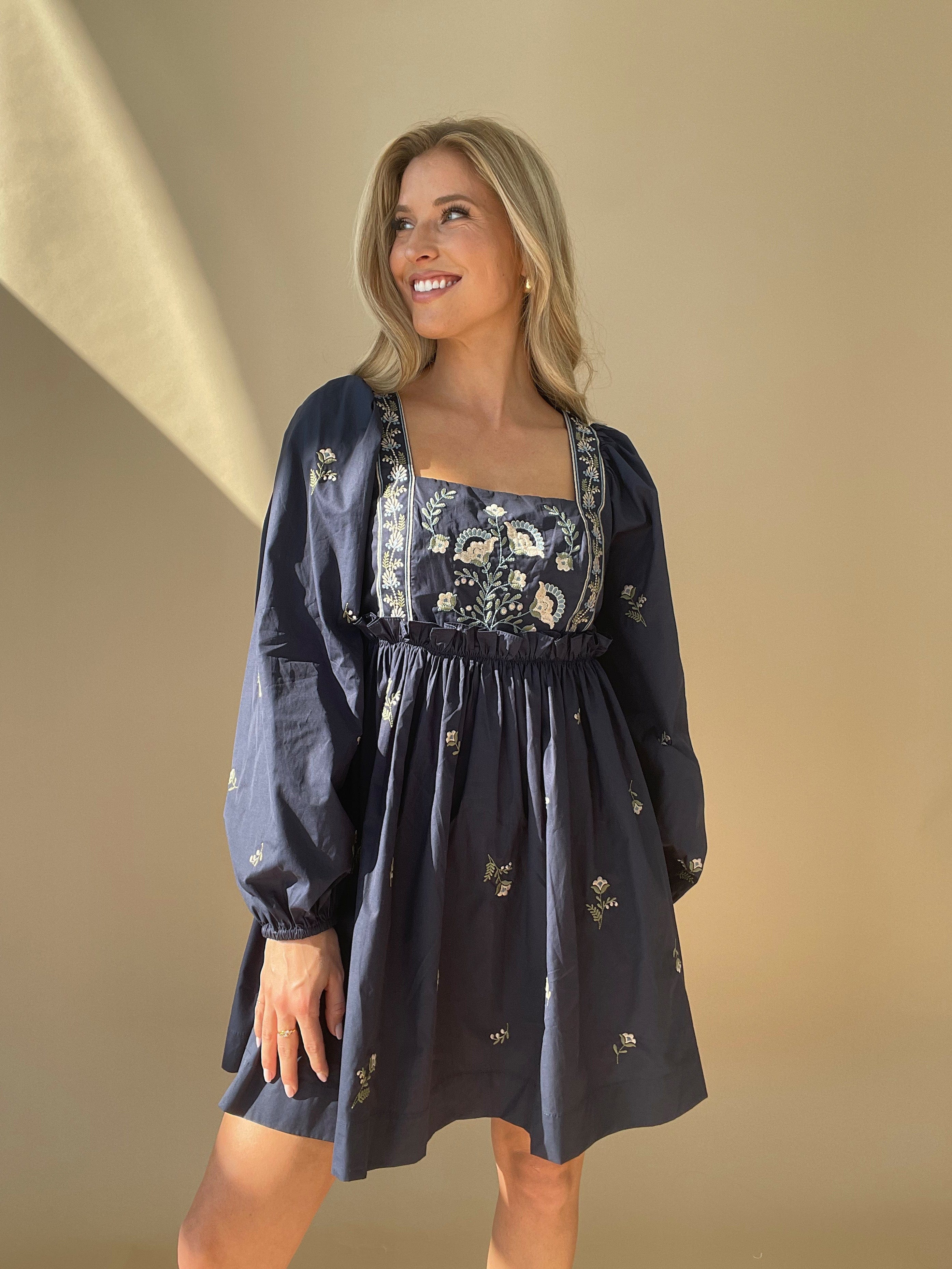 Expertly designed with a square neck and long sleeves, this Navy Floral Embroidered Dress is perfect for a stylish Thanksgiving look. With a delicate embroidered floral design, this mini dress also features a zipper closure in the rear for easy wear. Elevate your wardrobe with this elegant and versatile piece.