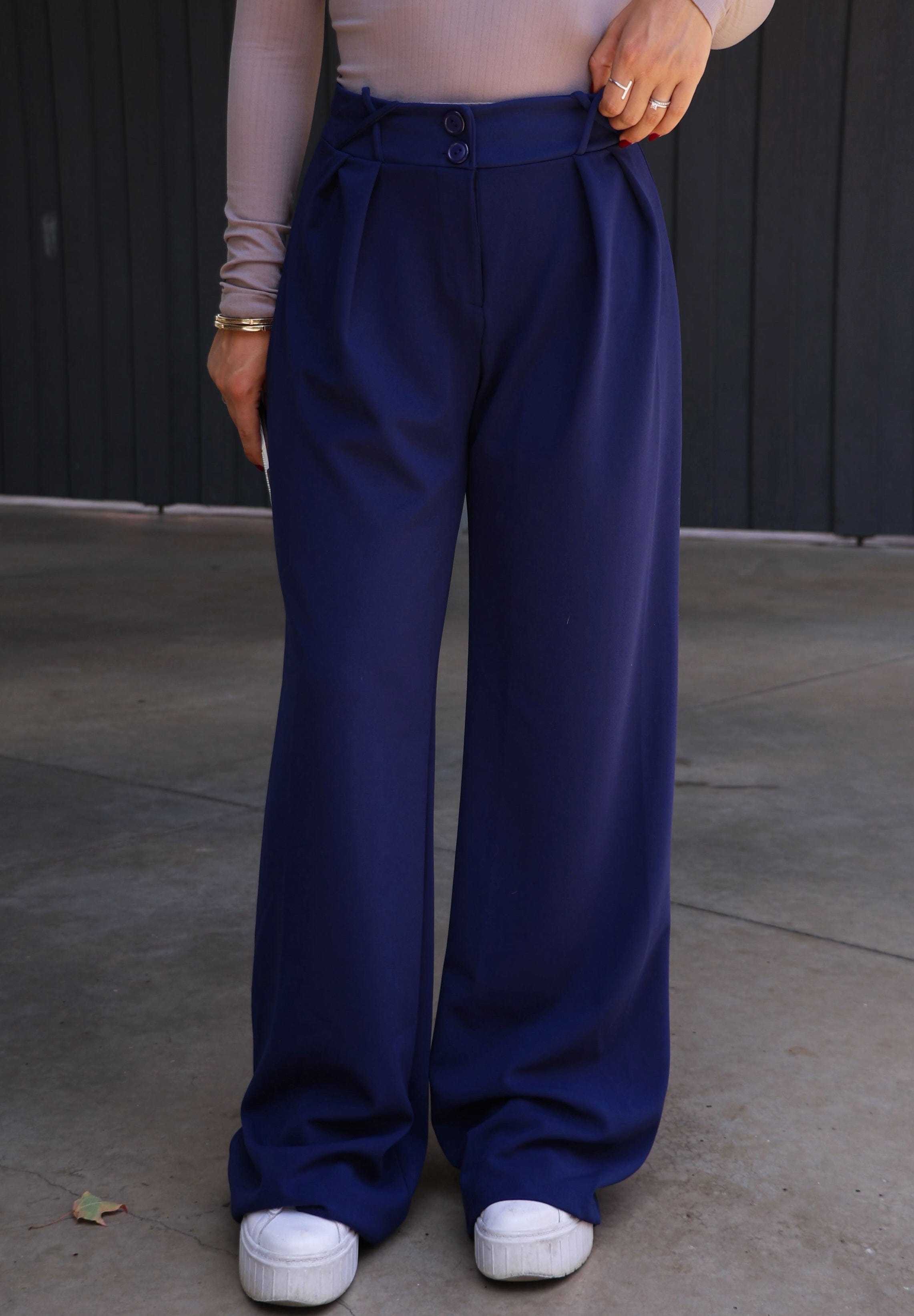 Our Navy Nights Pants offer a perfect blend of professional style and comfort. Crafted with a soft material, elevated stitching, pleated design, and wide leg, these pants exude sophistication and provide a rich pop of color for any occasion. The high waisted button and zipper closure creates a look that is simultaneously classic and modern, making them suitable for business or after-work drinks.