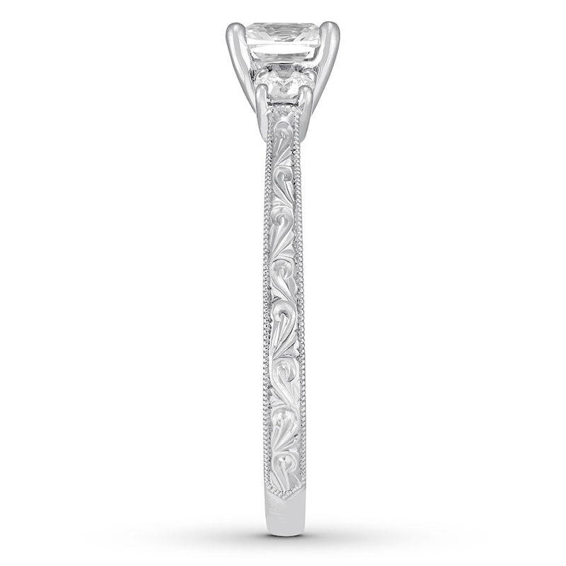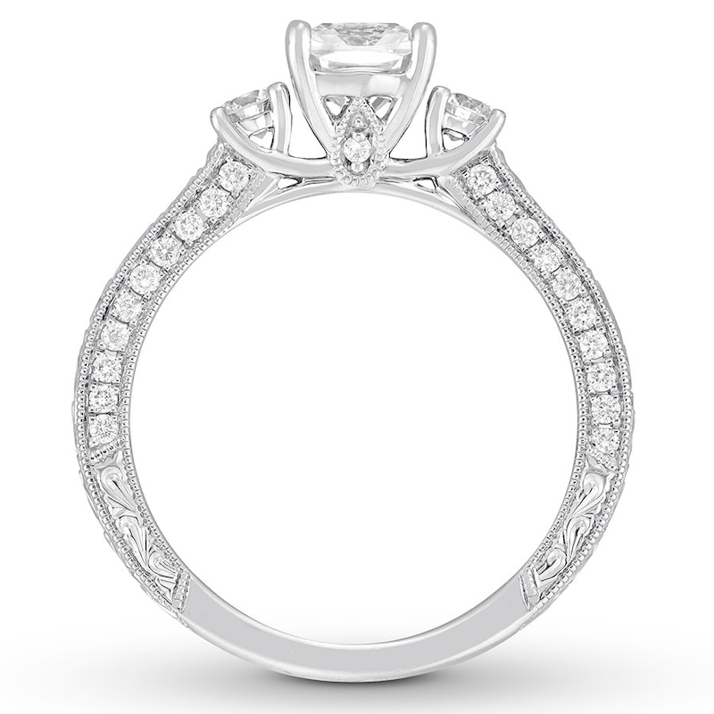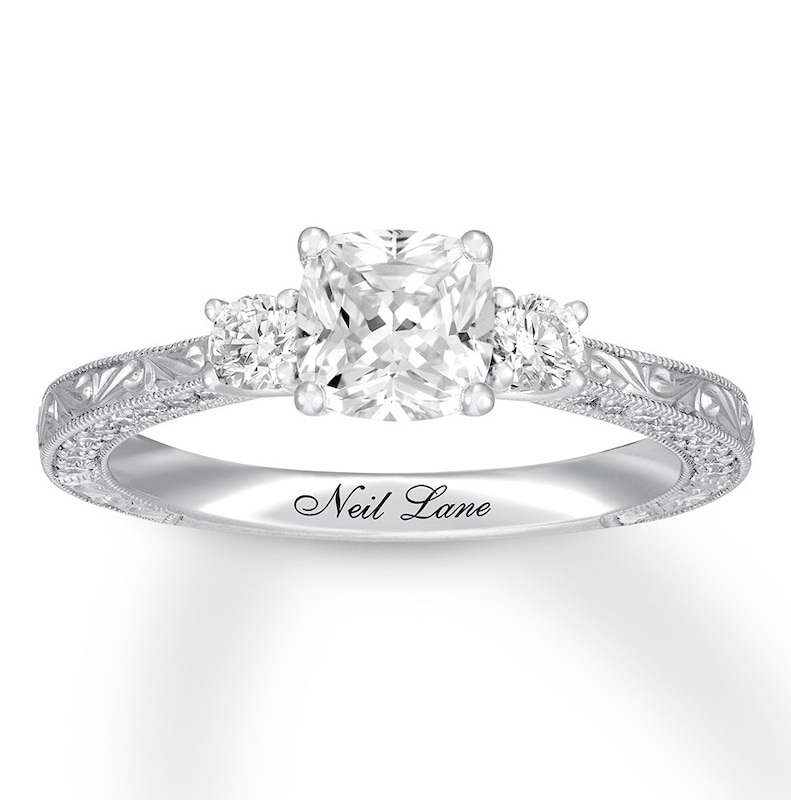 From the Neil Lane Bridal® collection comes this vivacious diamond engagement ring. A 1-carat cushion-cut diamond shares the spotlight with two round diamonds, one on either side. Floral flourishes and milgrain edges decorate the band of 14K white gold to complete the vintage look. Sparkling round diamonds line the side of the band, bringing the total diamond weight to 1 1/3 carats.