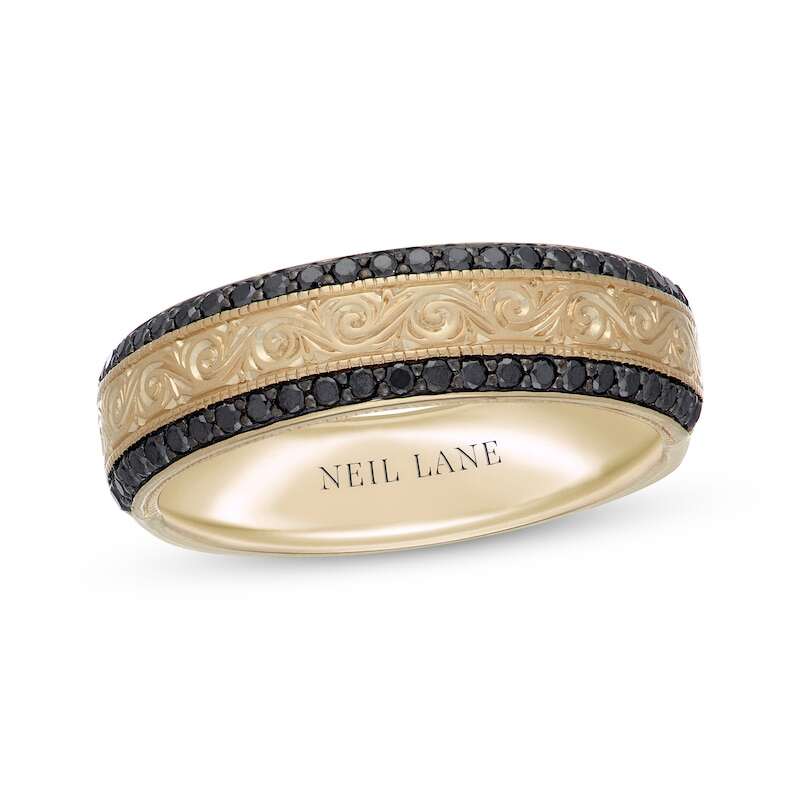 This distinguished men's wedding band from the Neil Lane? collection features an intricately detailed engraved milgrain center framed with rich round-cut black diamonds. Crafted of 14K yellow gold, the band has a total diamond weight of 1/2 carat.