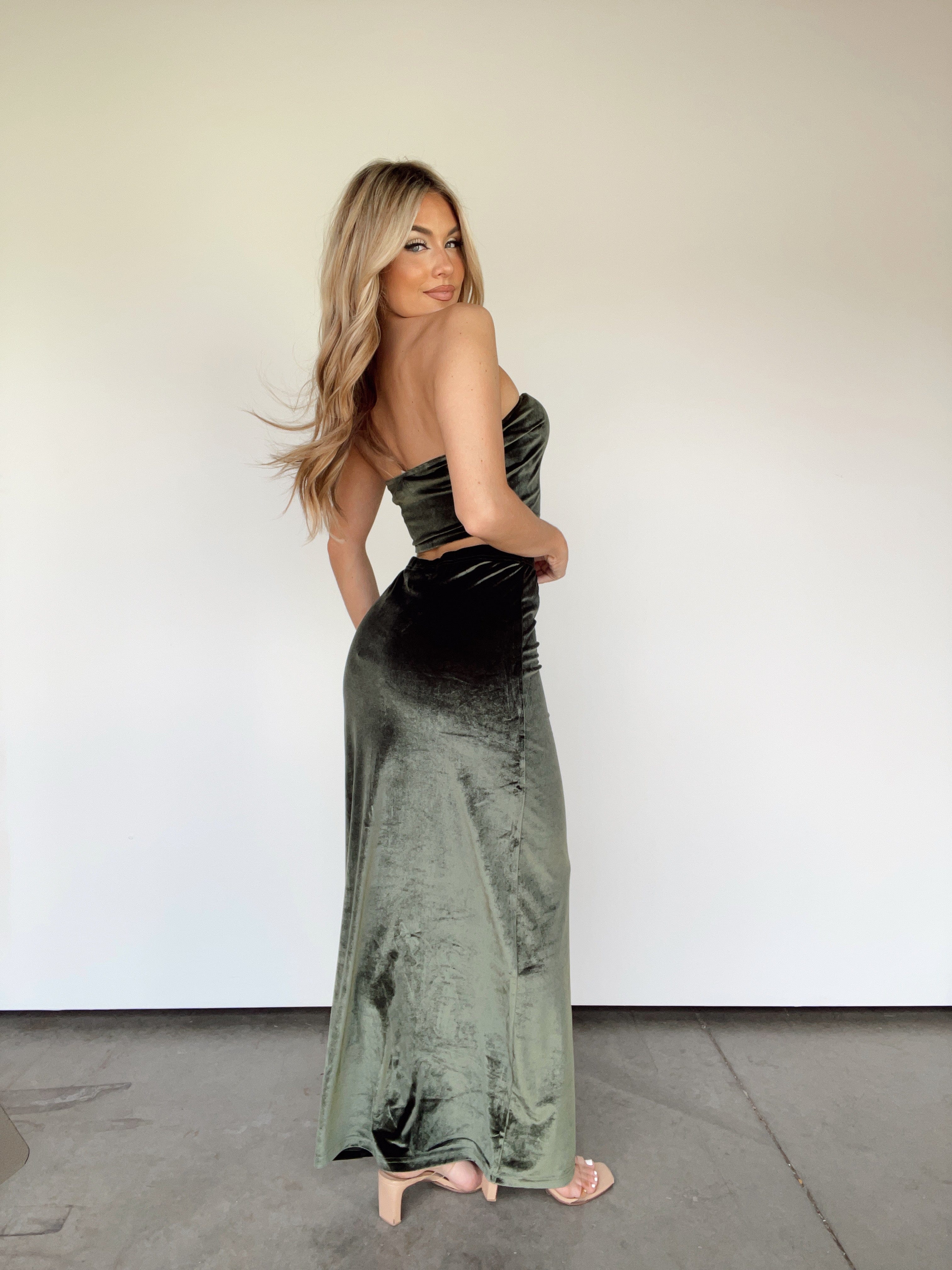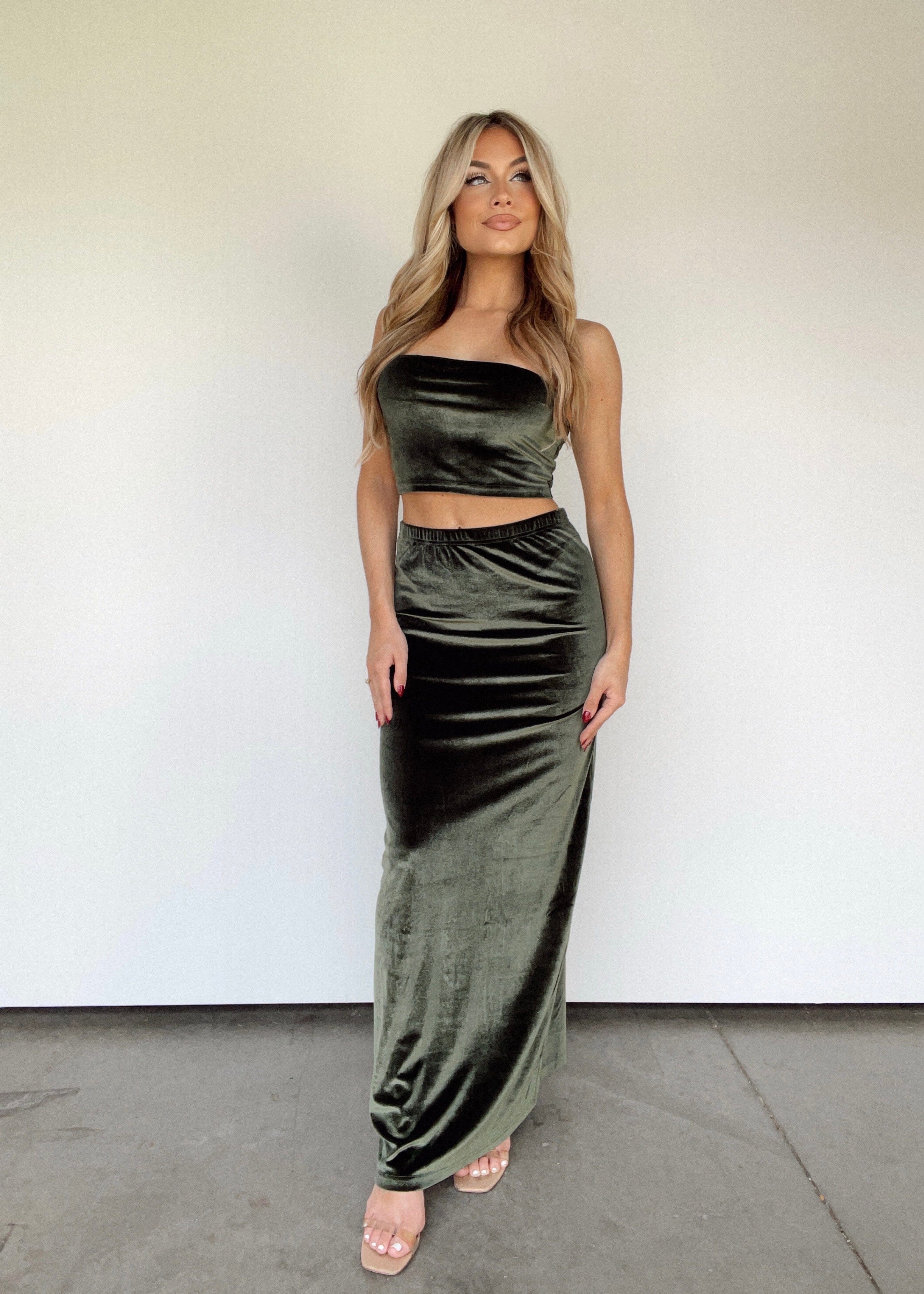 Look stunning for any occasion in the Noticing Me Skirt. Crafted from ultra-soft velvet and designed with a high-waisted silhouette and maxi fit, this sophisticated skirt will hug your body in all the right places. Versatile enough to pair with any top, the Noticing Me Skirt is the perfect addition to your wardrobe for weddings, dinners and drinks during the fall season. Layer over silky camisoles and accessorize with heeled sandals for an elegant, classy look.