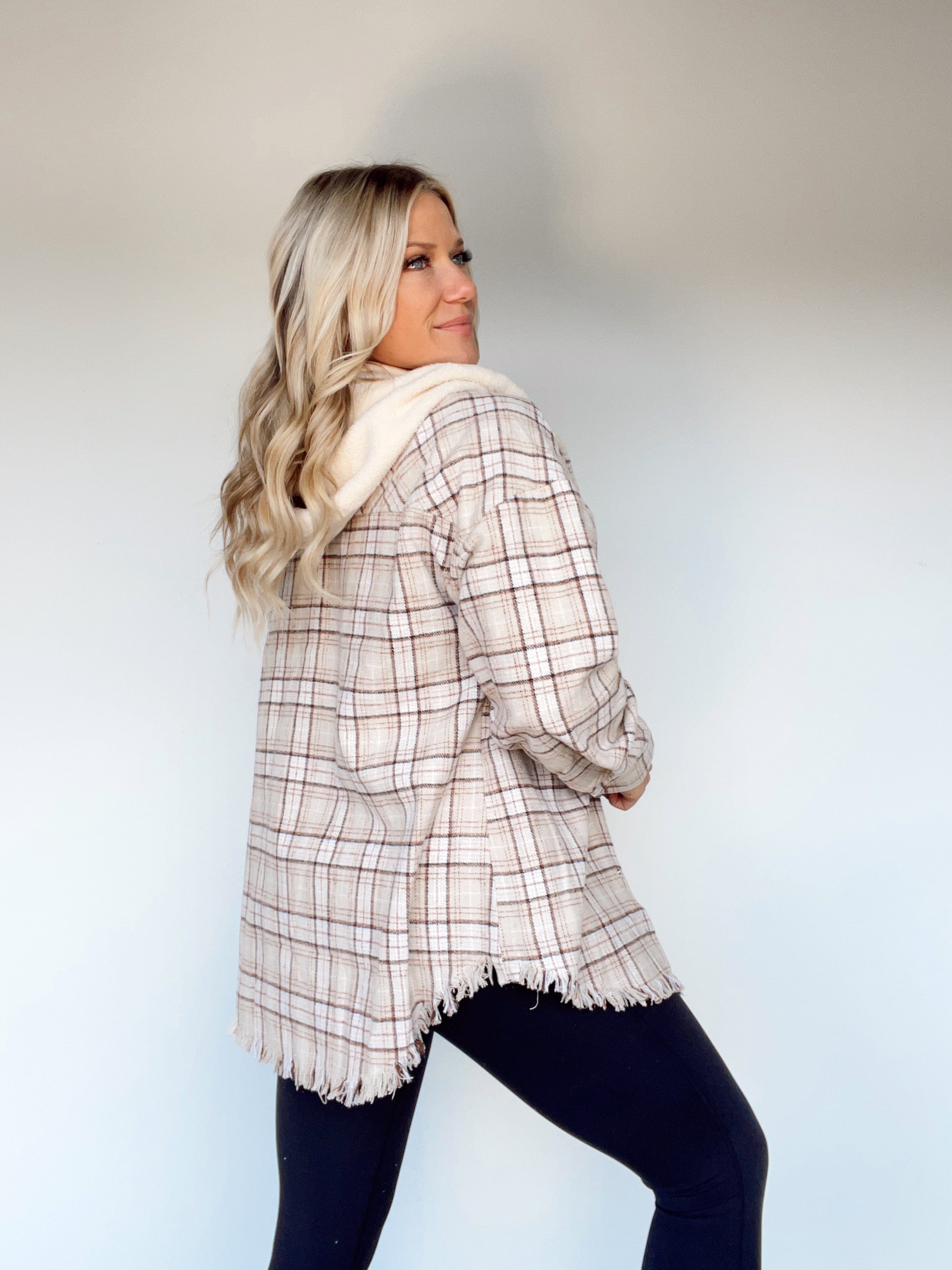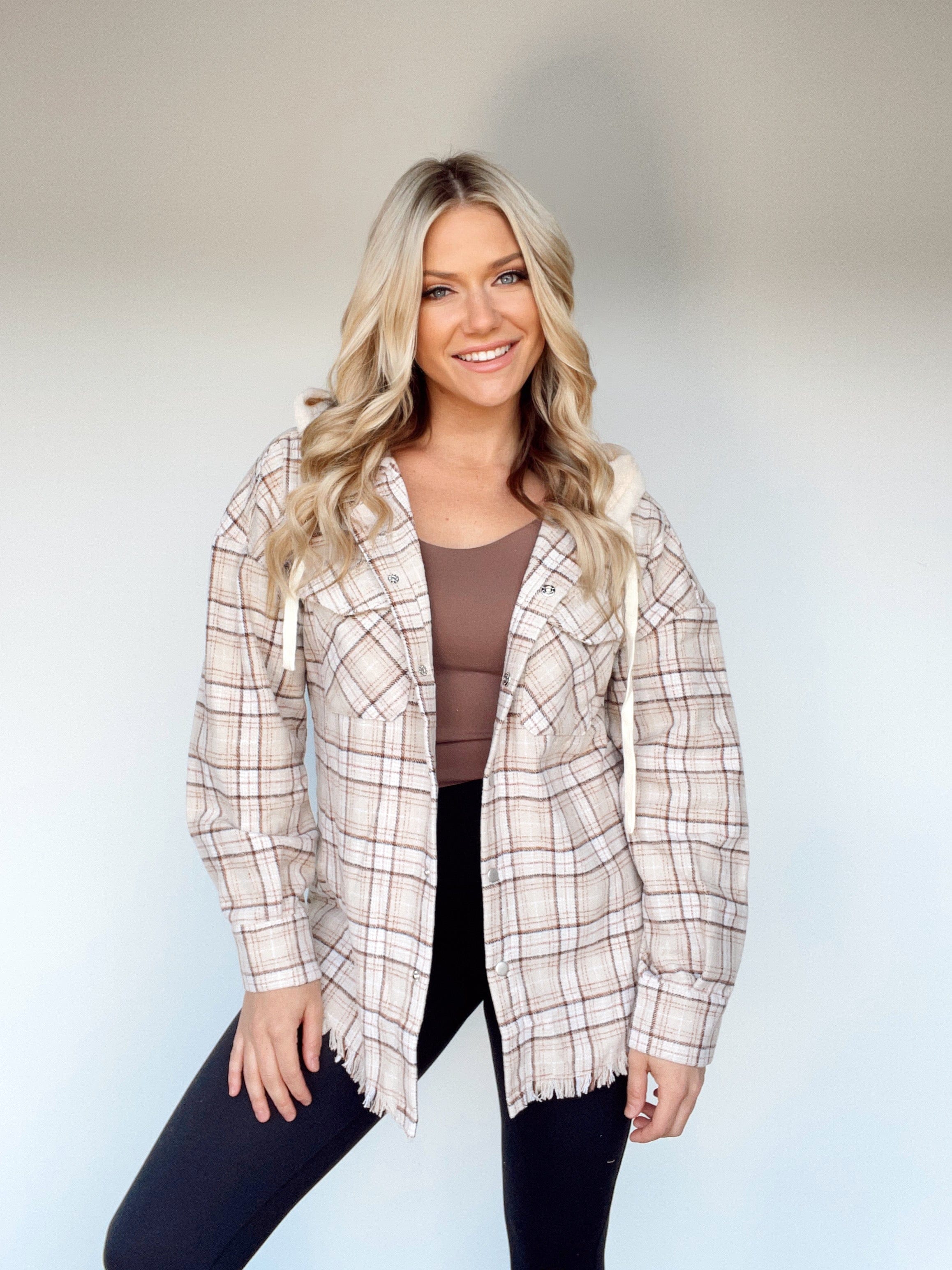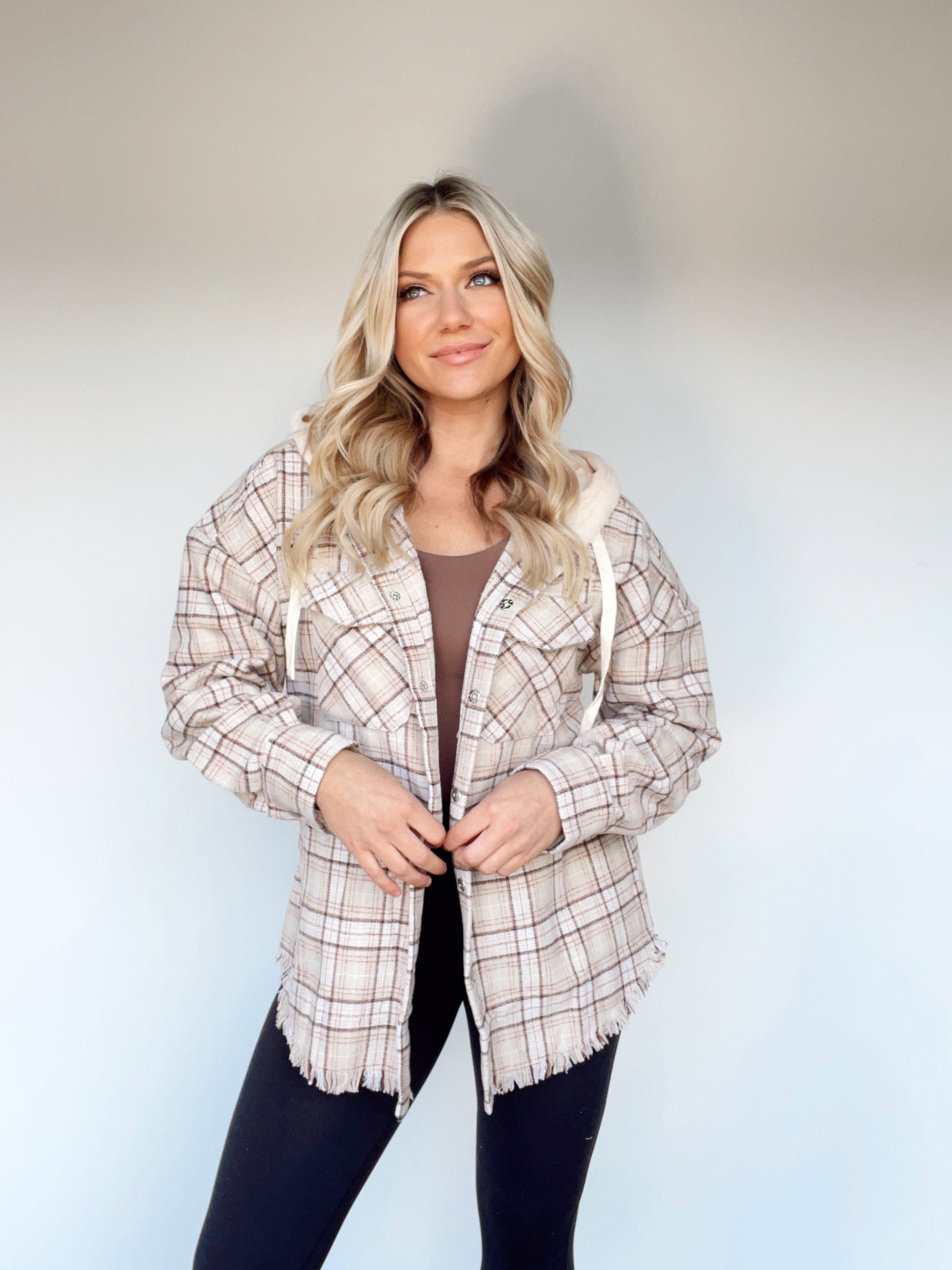 Elevate your post-fall wardrobe with this timeless Don't Be Chai Flannel Shacket. The button closures, drawstring hood, pocket details and frayed hem offer a classic look, while its soft, cozy warmth will keep you snug even on chillier nights. With its relaxed fit and festive pumpkin patch and apple picking plaid, this neutral piece will be your go-to for hot cocoa dates and chilly autumn days.