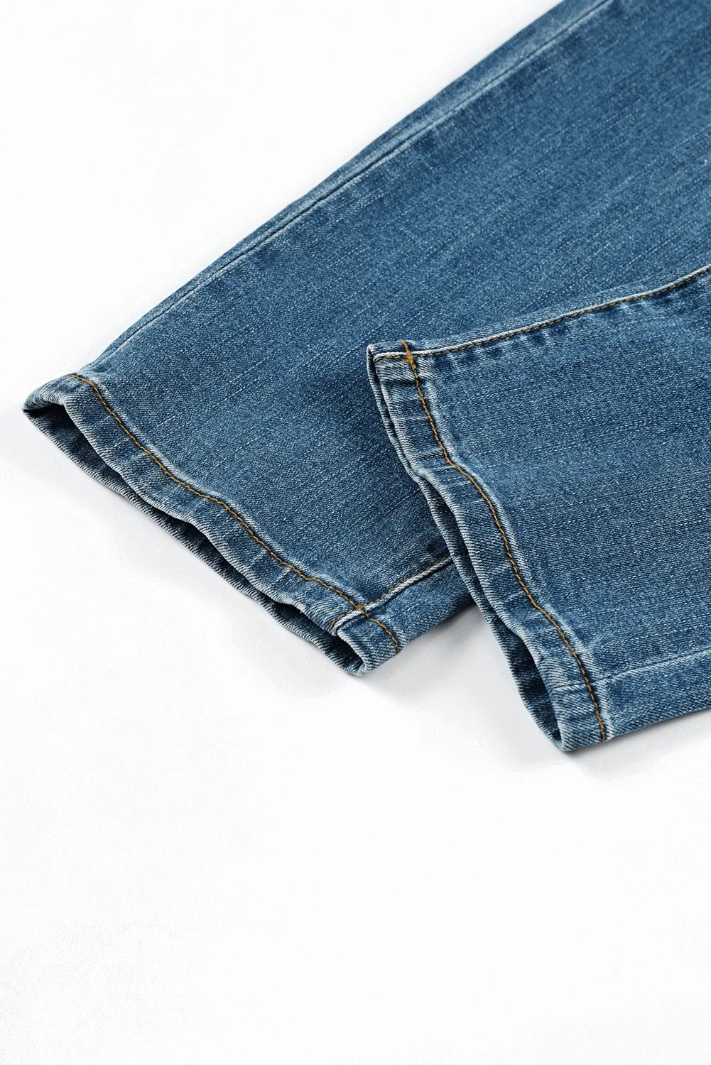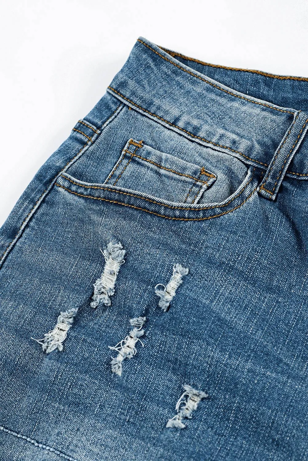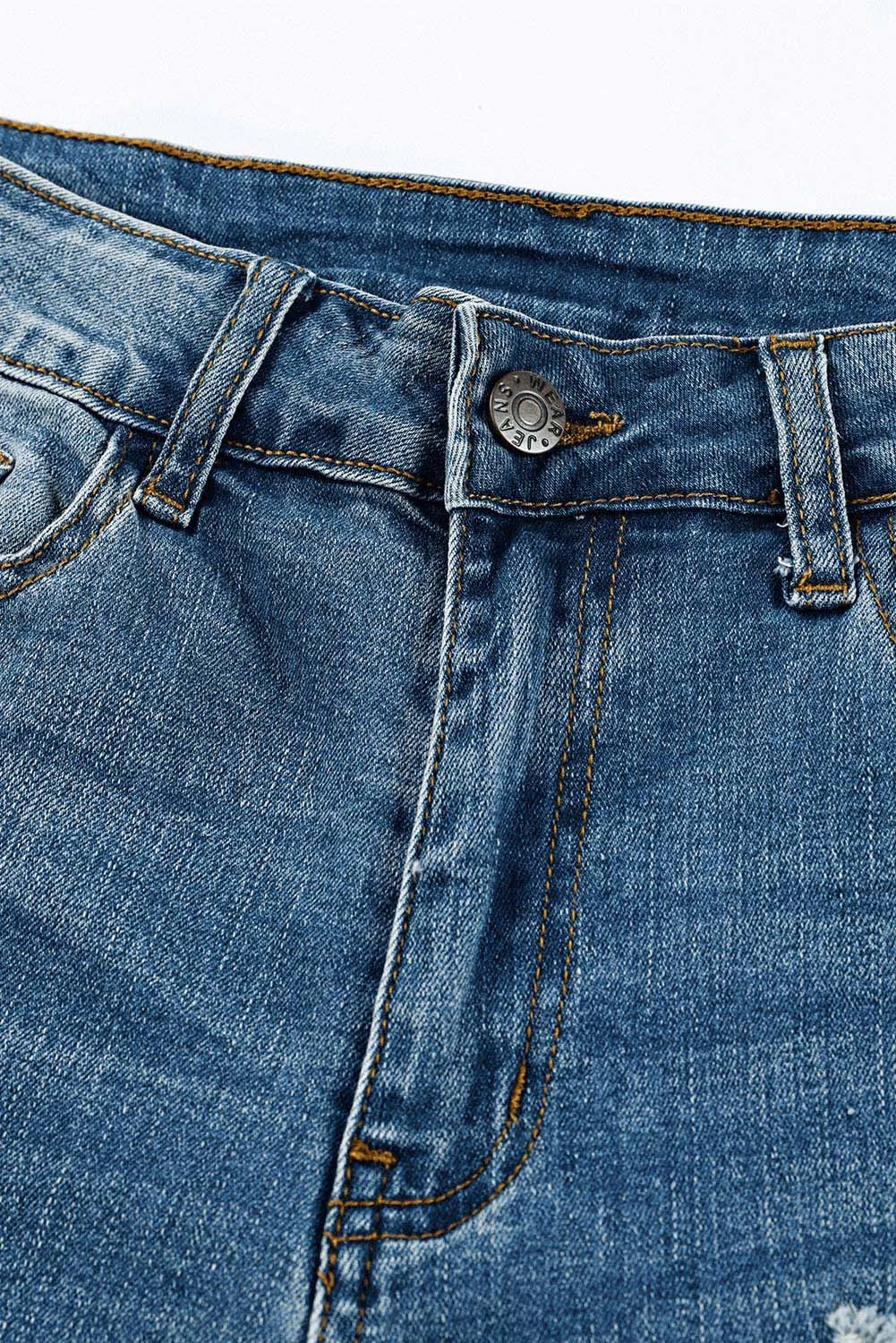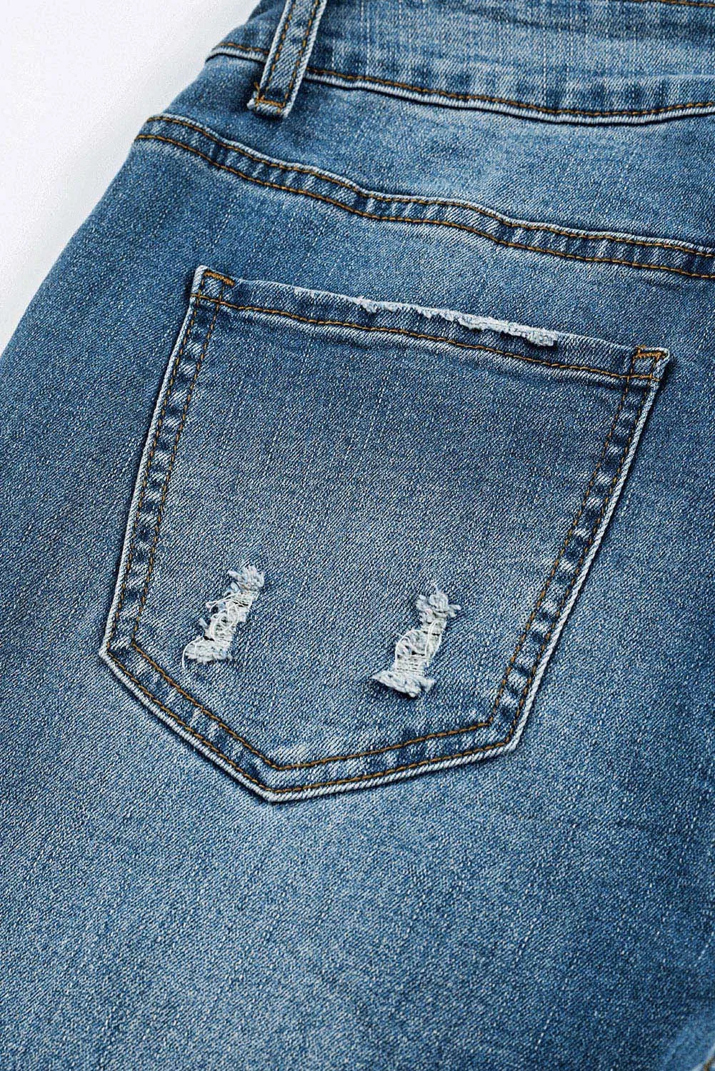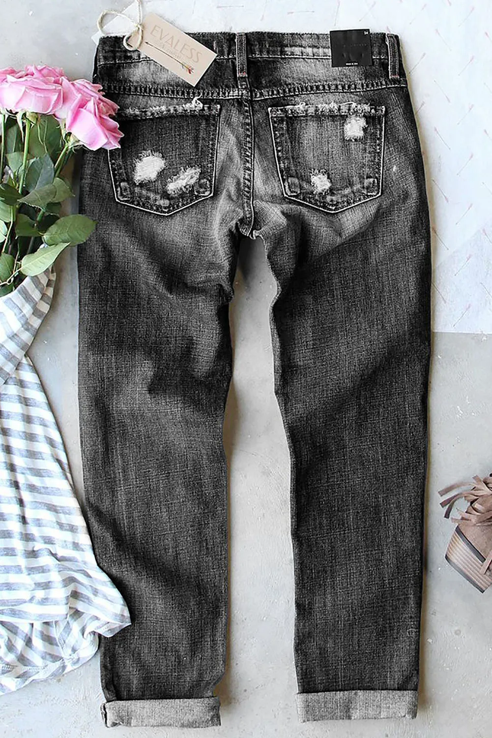 - The button ripped jeans feature medial rise and destroyed broken holes design. Slim fitted denim pants for women