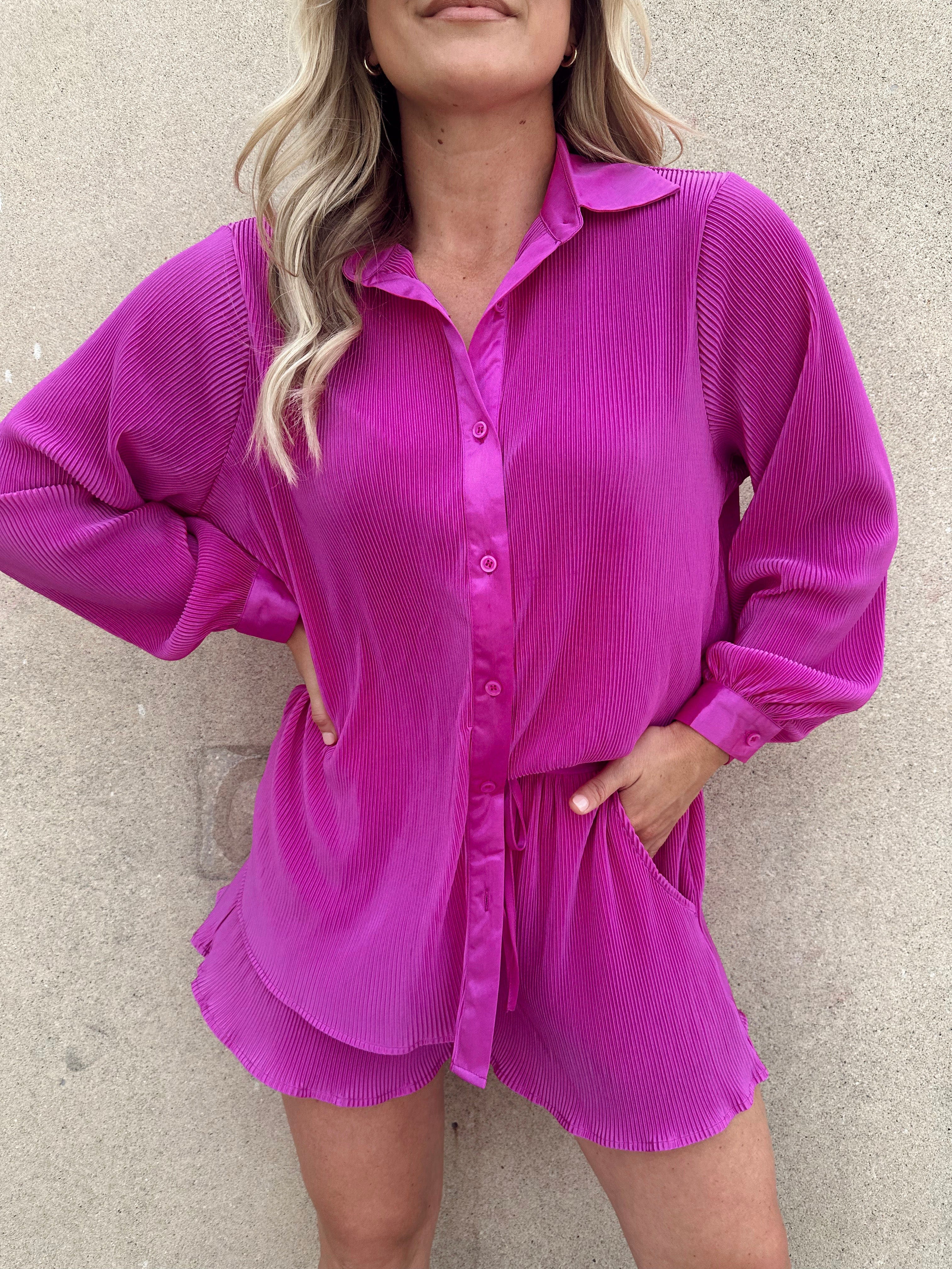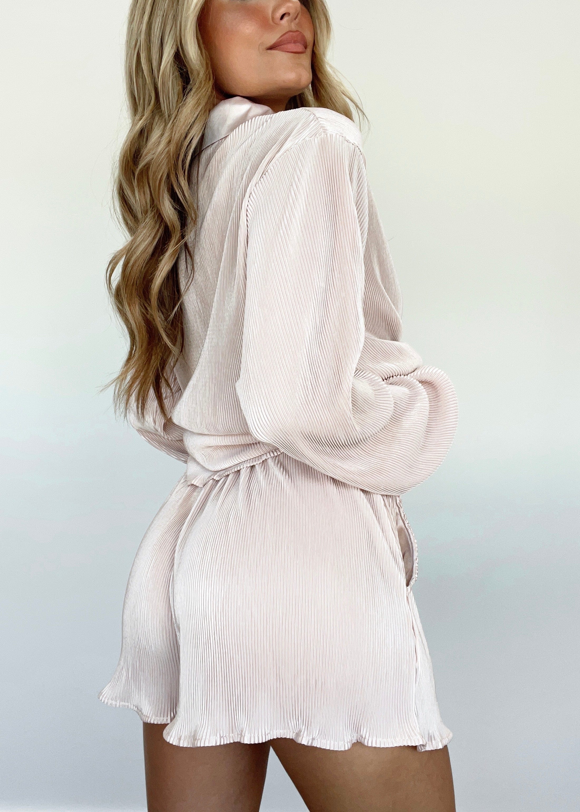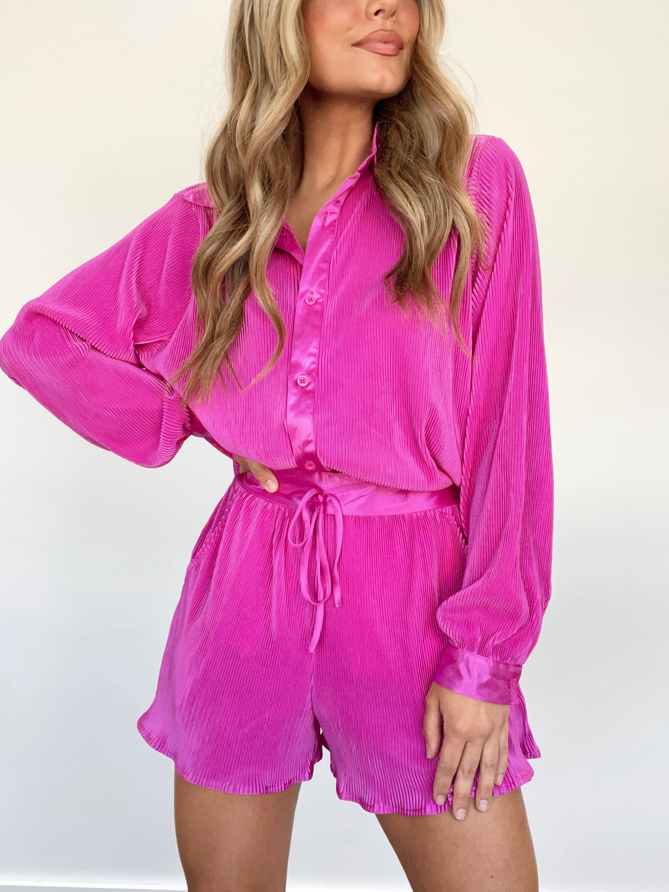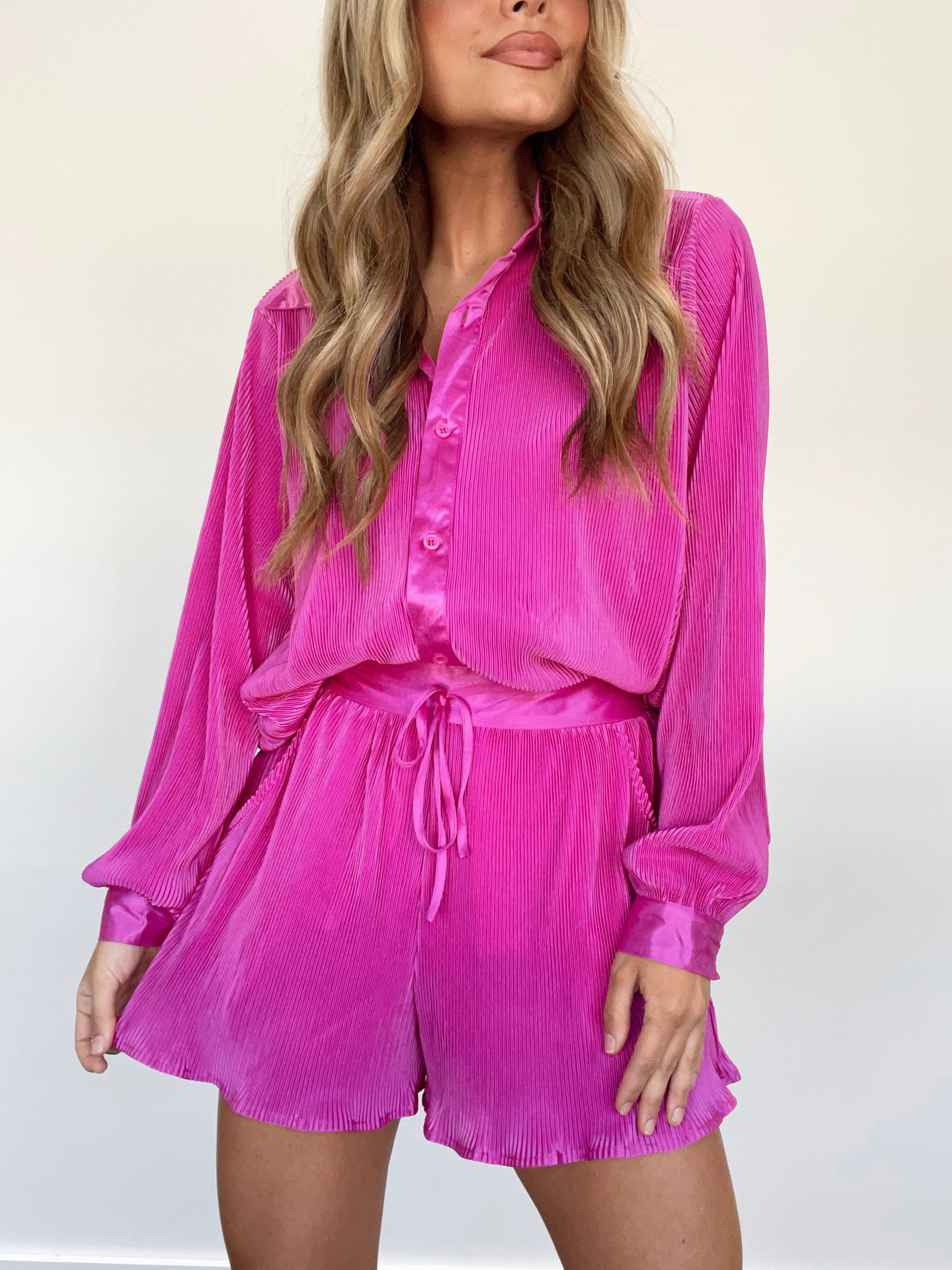 Our On Set Shorts offer an effortless blend of comfort and stylish sophistication. Featuring an adjustable drawstring waistband and a ruffled hem, these relaxed shorts are crafted in luxurious crinkle textured satin for an elevated look. The perfect combination of trendy and lounging style, our On Set Shorts add a subtle pop of color to your wardrobe.