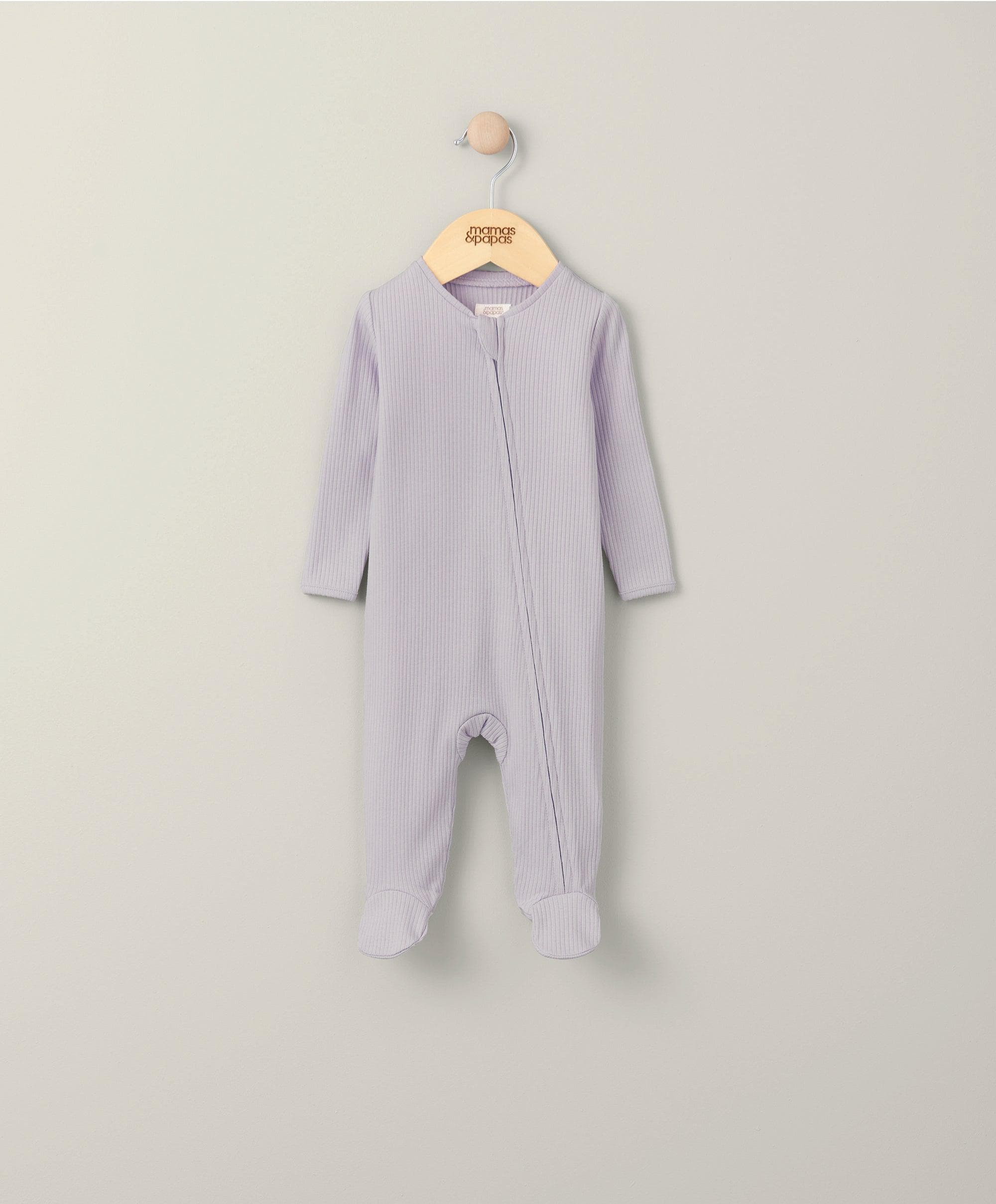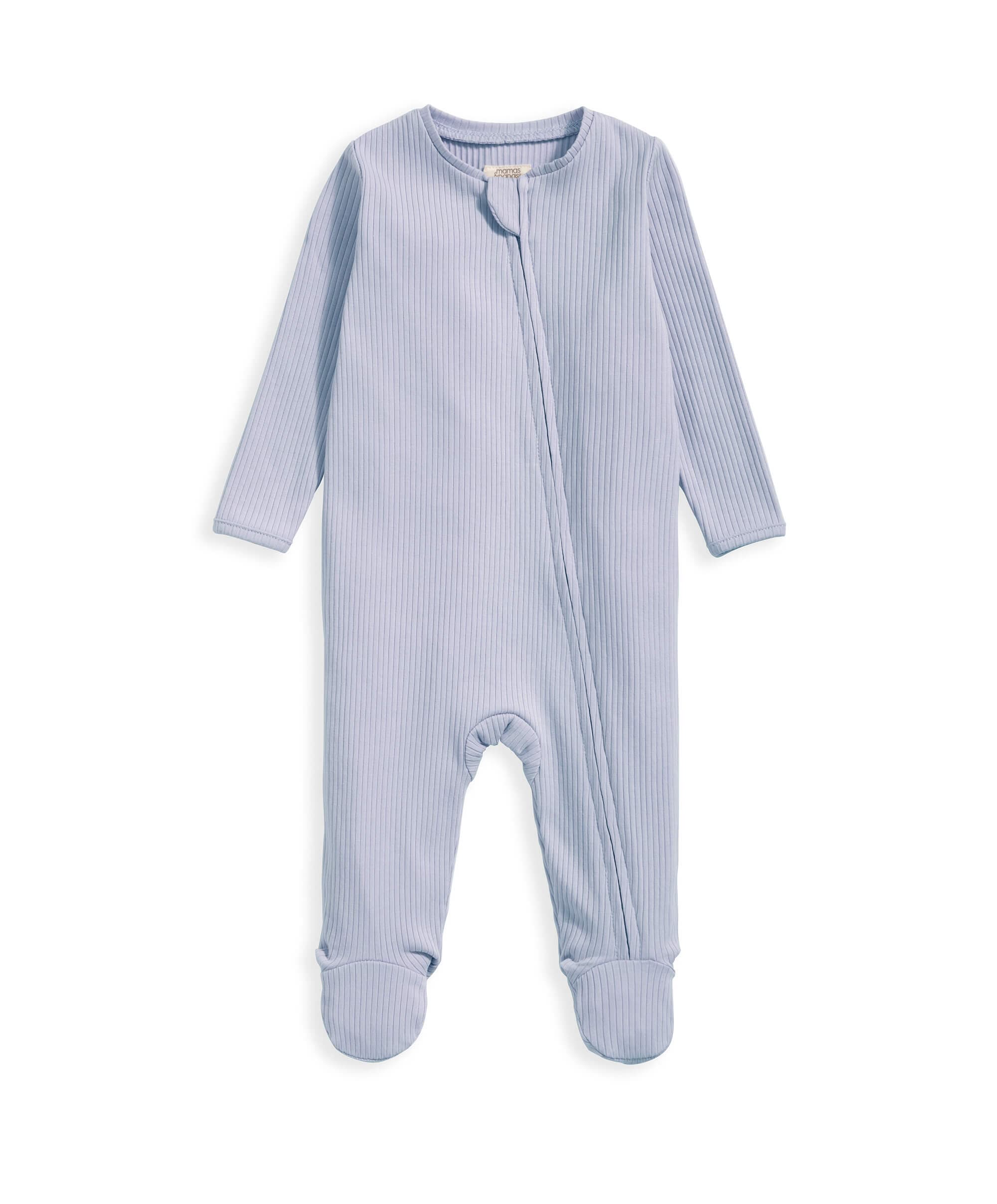 Long-sleeved ribbed organic cotton all in one. With zip front fastening for ultra easy changing. Integrated protective chin guard, scratch mitts and feet, for warmth and protection. The softest organic ribbed cotton. Pairs well with our ribbed organic cotton hat!