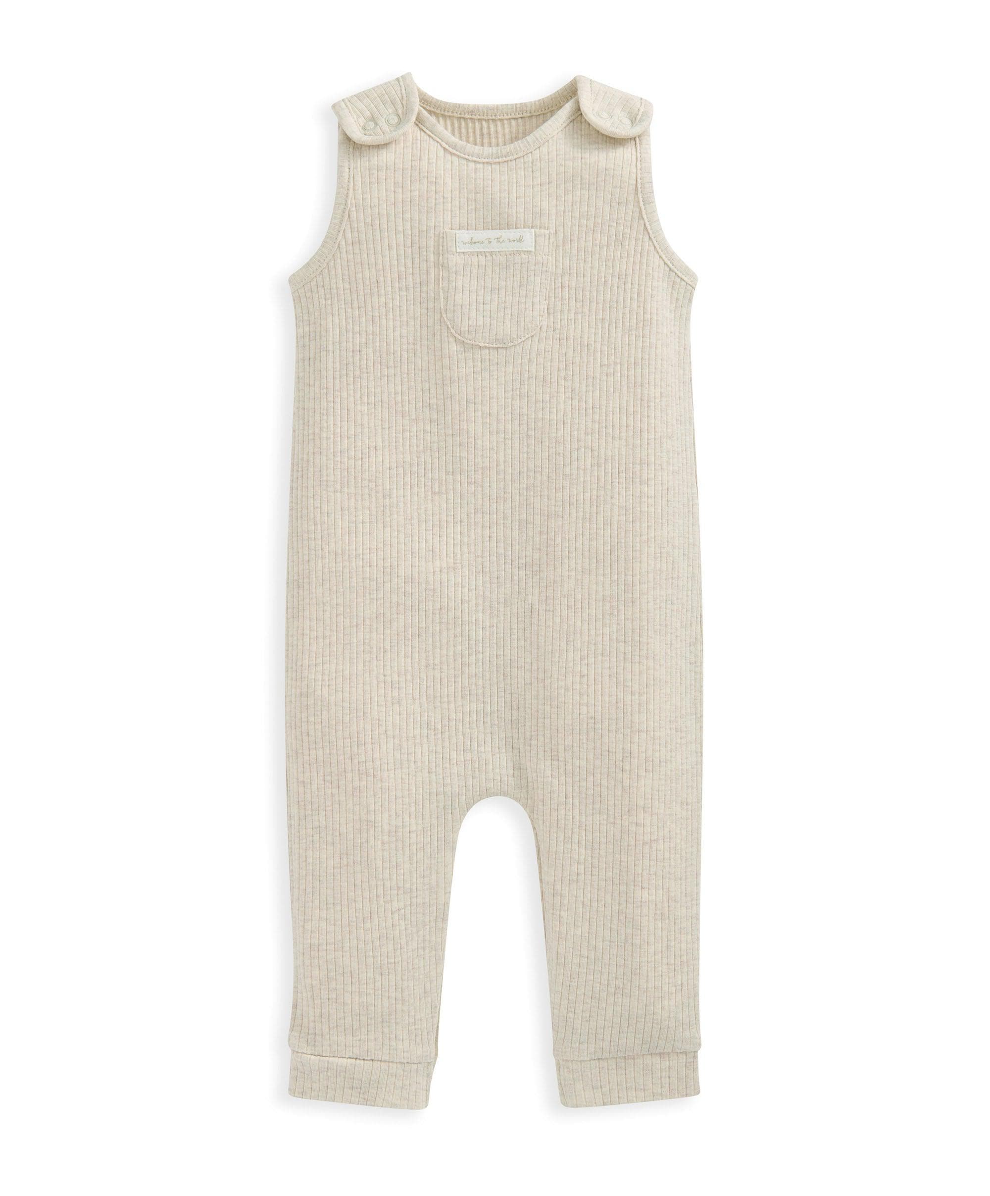 Oatmeal organic ribbed cotton sleeveless romper, with shoulder popper fastening