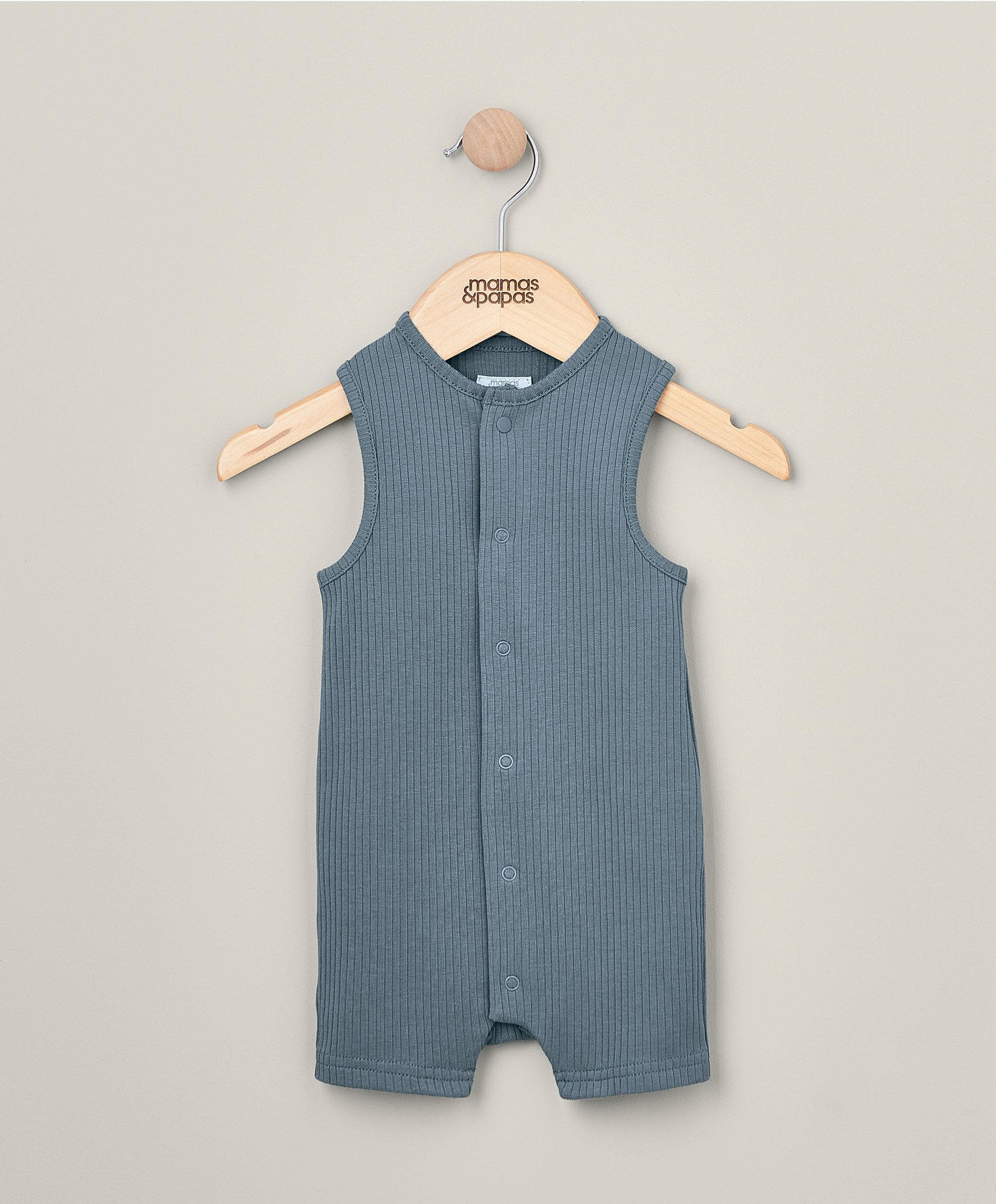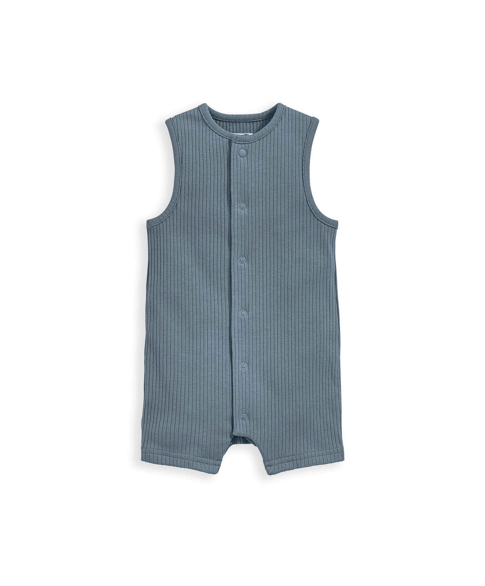 Sleeveless blue romper in 100% organic ribbed cotton. Concealed popped opening down front.
