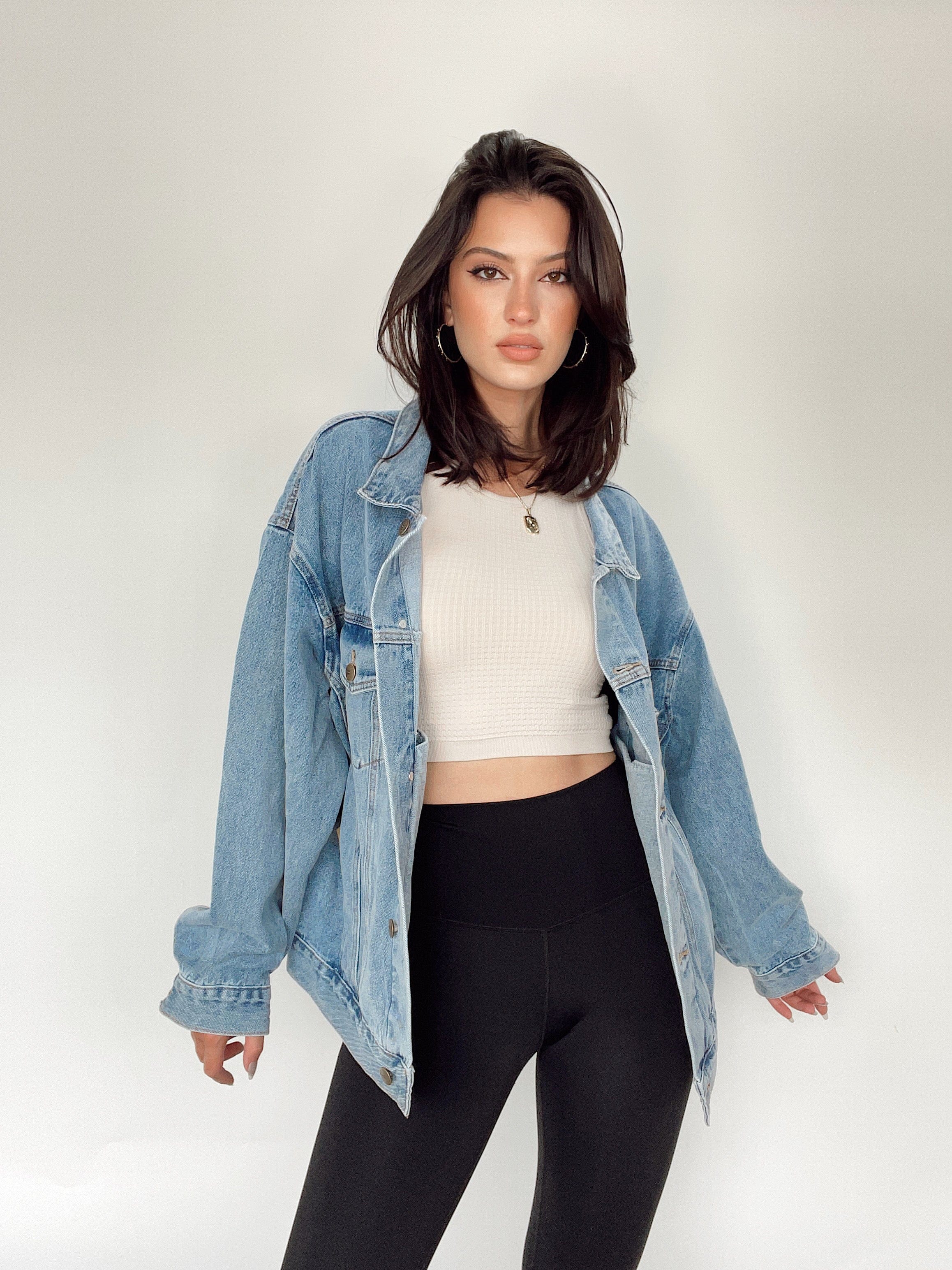 Discover the Denim Oversized Claudia Jacket – a top pick among staff and customers alike. With its oversized fit and versatile style, this 100% cotton jacket is the perfect addition to any outfit. Sizing runs true, making it a must-have for any trendy, cool girl look!