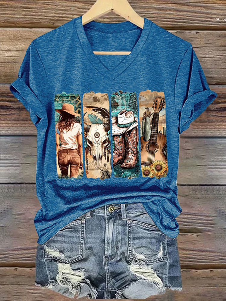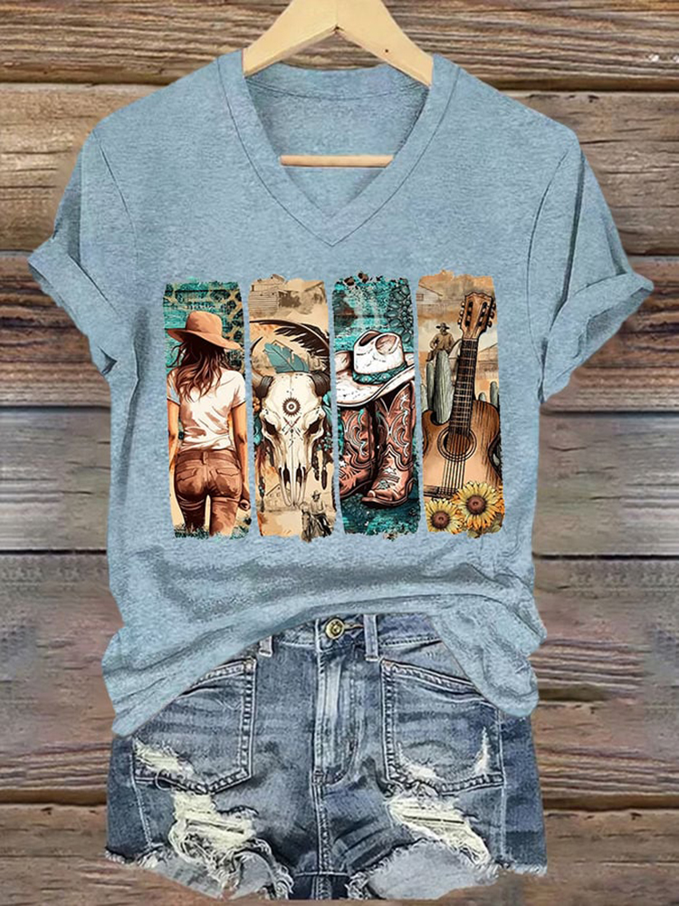 Patterned Printed V-Neck Short-Sleeved T-Shirt