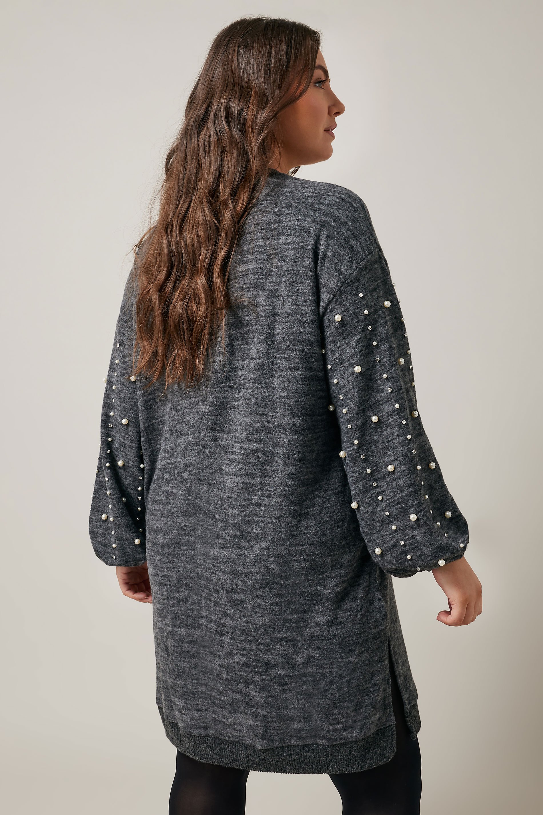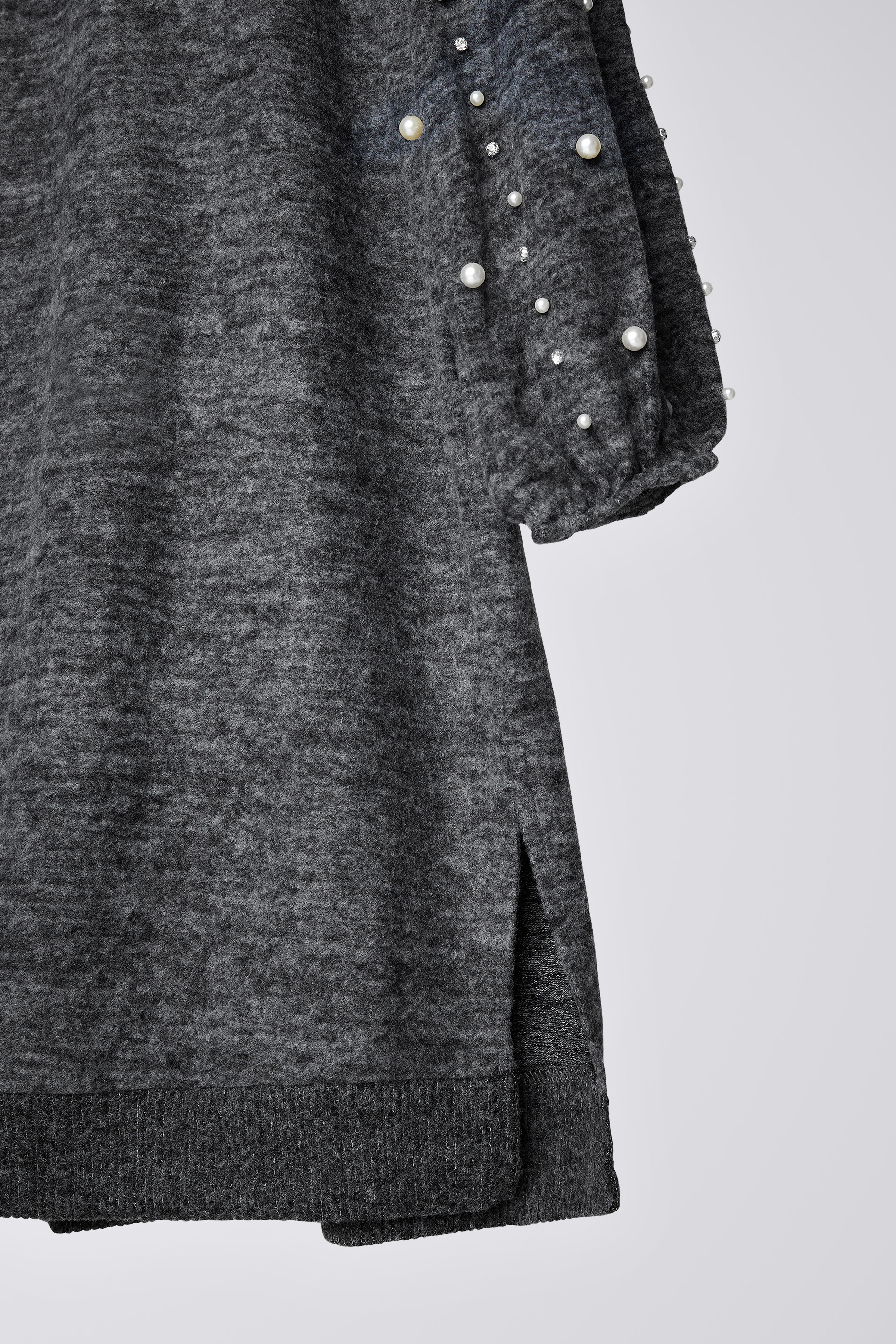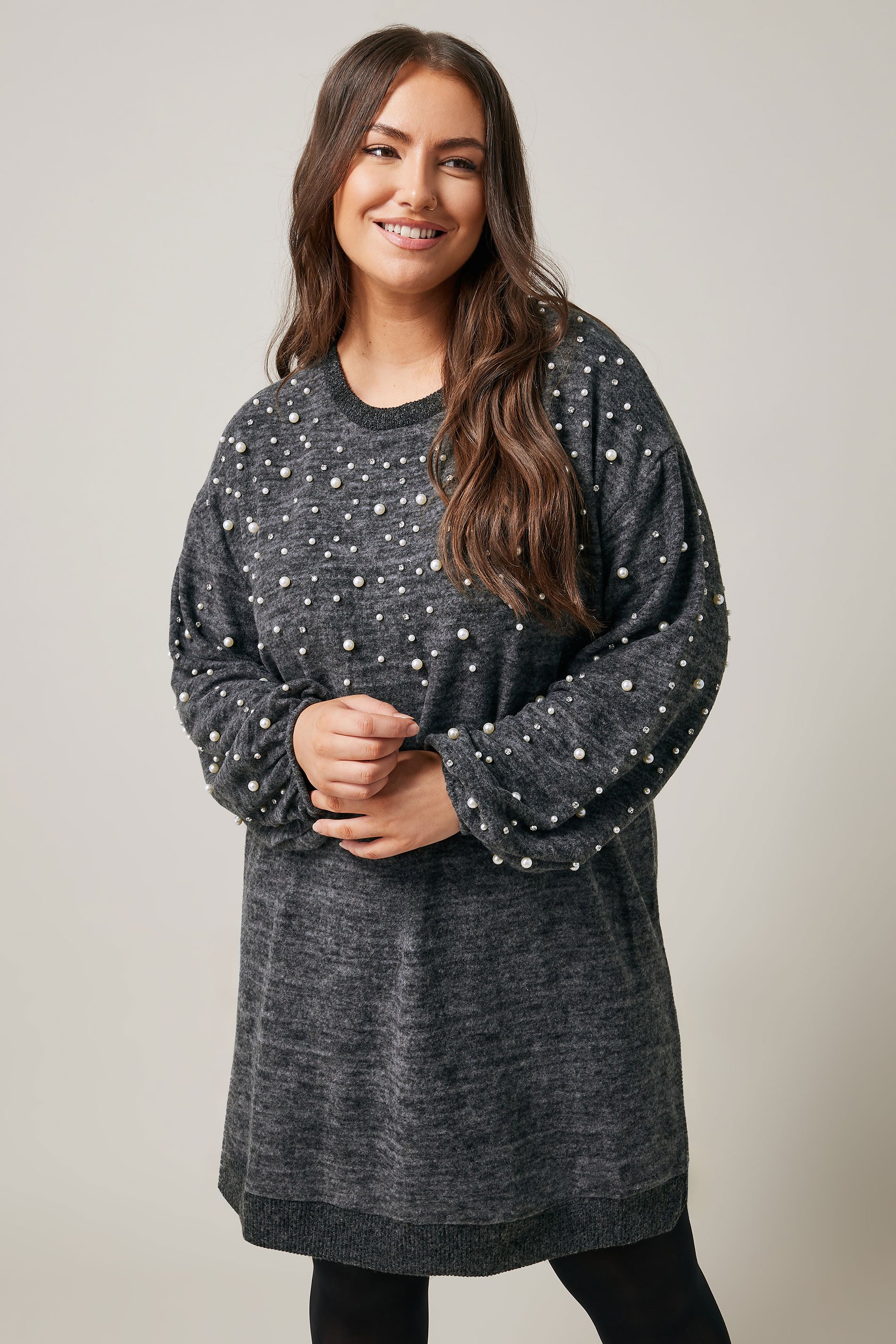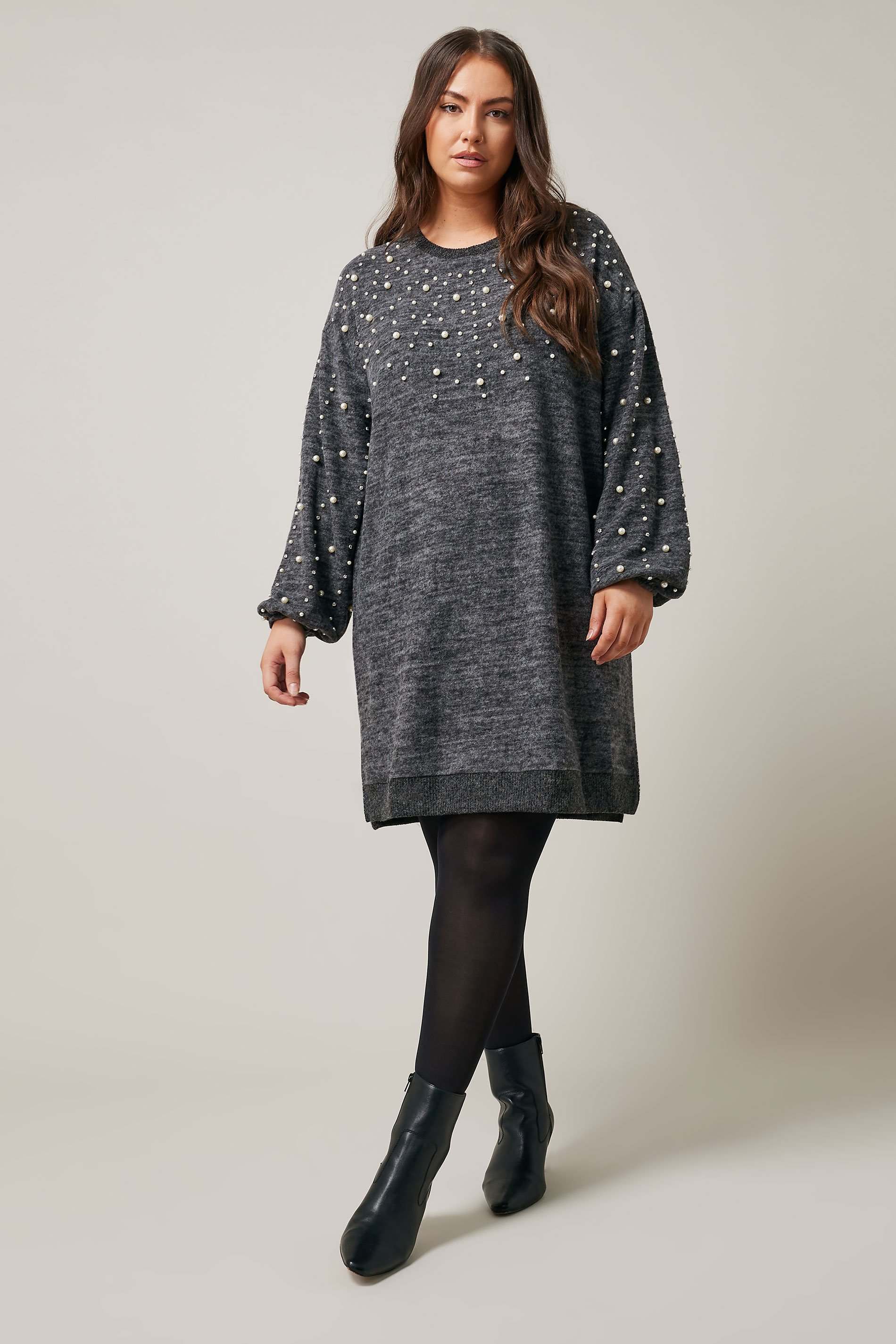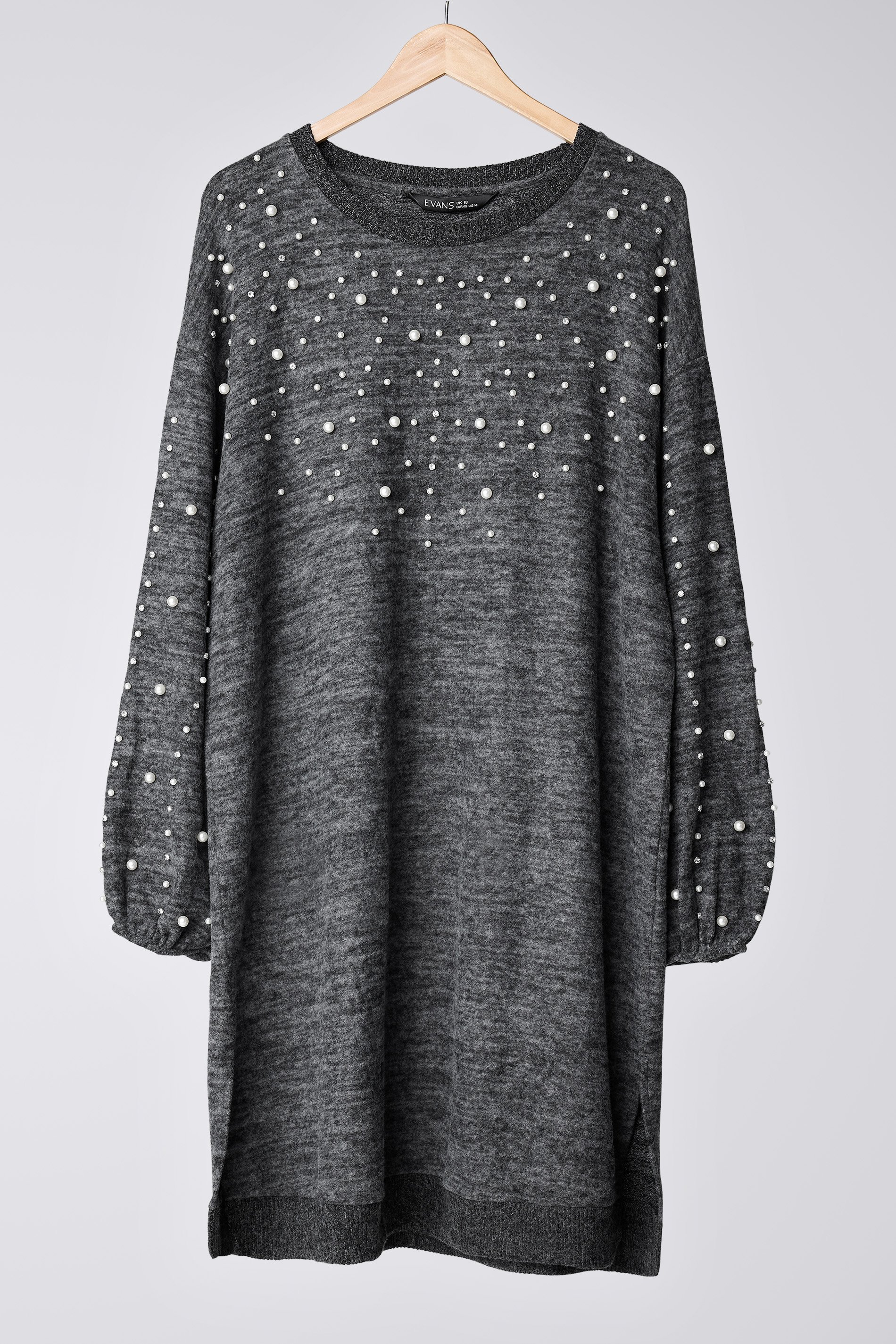 Embrace luxury with this soft touch jumper dress. Made from a soft knitted fabric, this jumper features pearl embellishments and a scoop neckline. Pair with tights and boots for a perfect autumnal look.