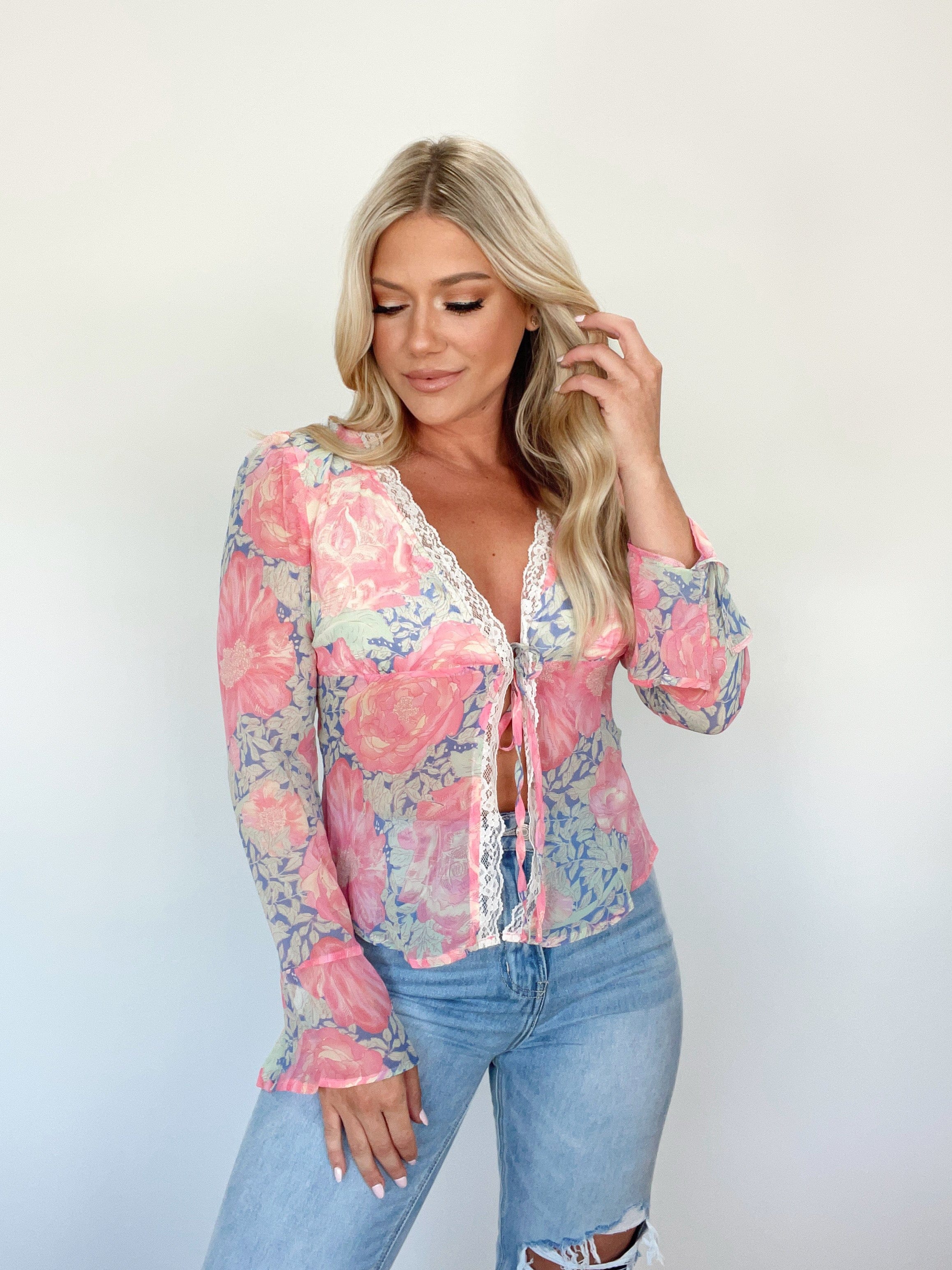 Our Petalscape Tie Blouse is the perfect addition to your wardrobe for the summer season. Crafted from a light mesh fabric, this blouse features a V-neckline with lace trim, long sleeves, a stylish front tie detail, and a floral pattern for a sweet, elevated pop of color. Trendy, stylish, and effortlessly chic, this blouse will make a statement wherever you go.