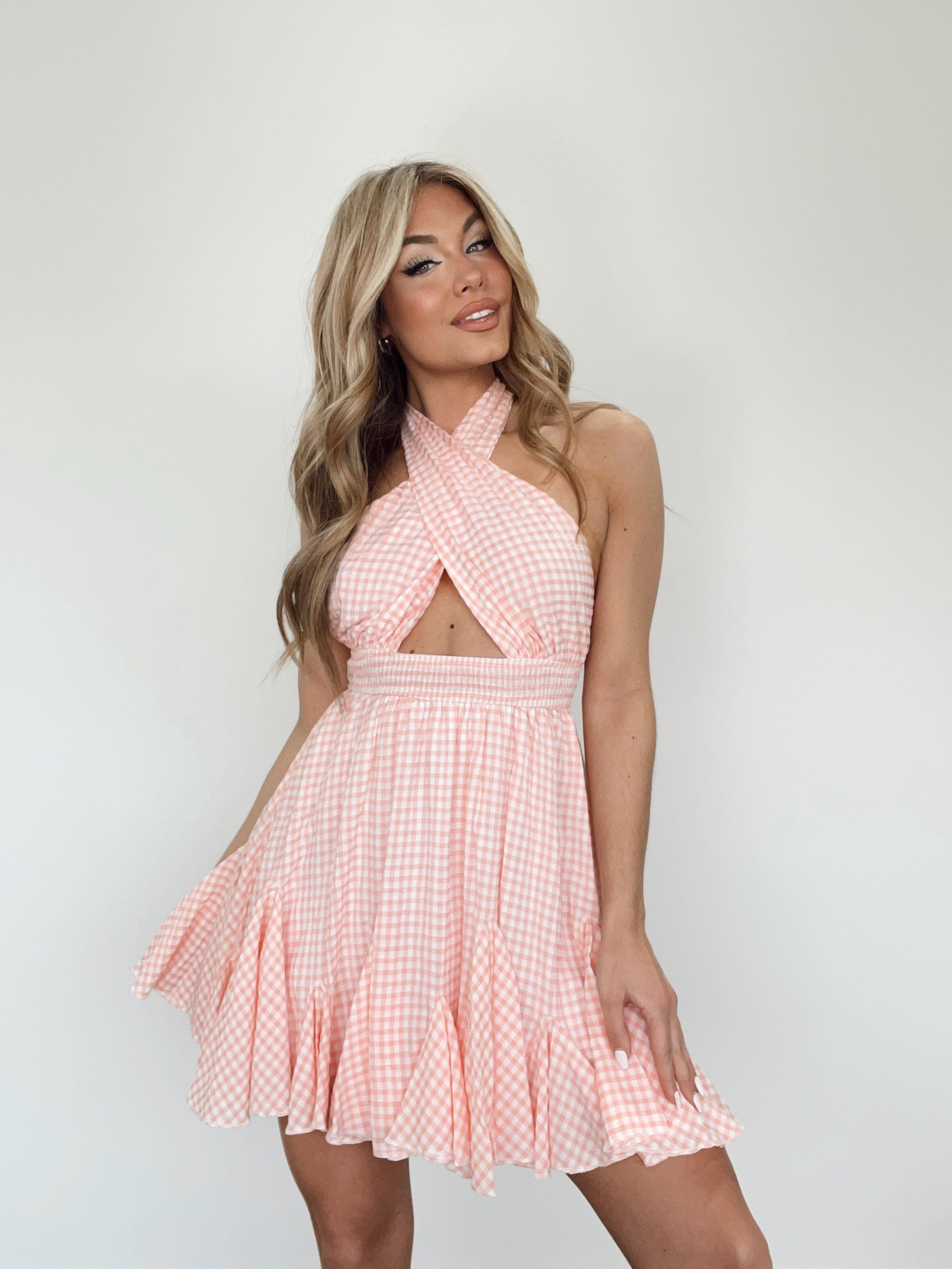 Introducing the Pink Checkered Charm Dress, a timeless, feminine style suitable for both casual and elevated looks. Crafted with a checkered print, cross tie detail, halter neck and front cutout, it features a stretchy elastic waistband and flowy ruffled hem. Perfect for spring and summer, this versatile dress will quickly become a wardrobe staple.
