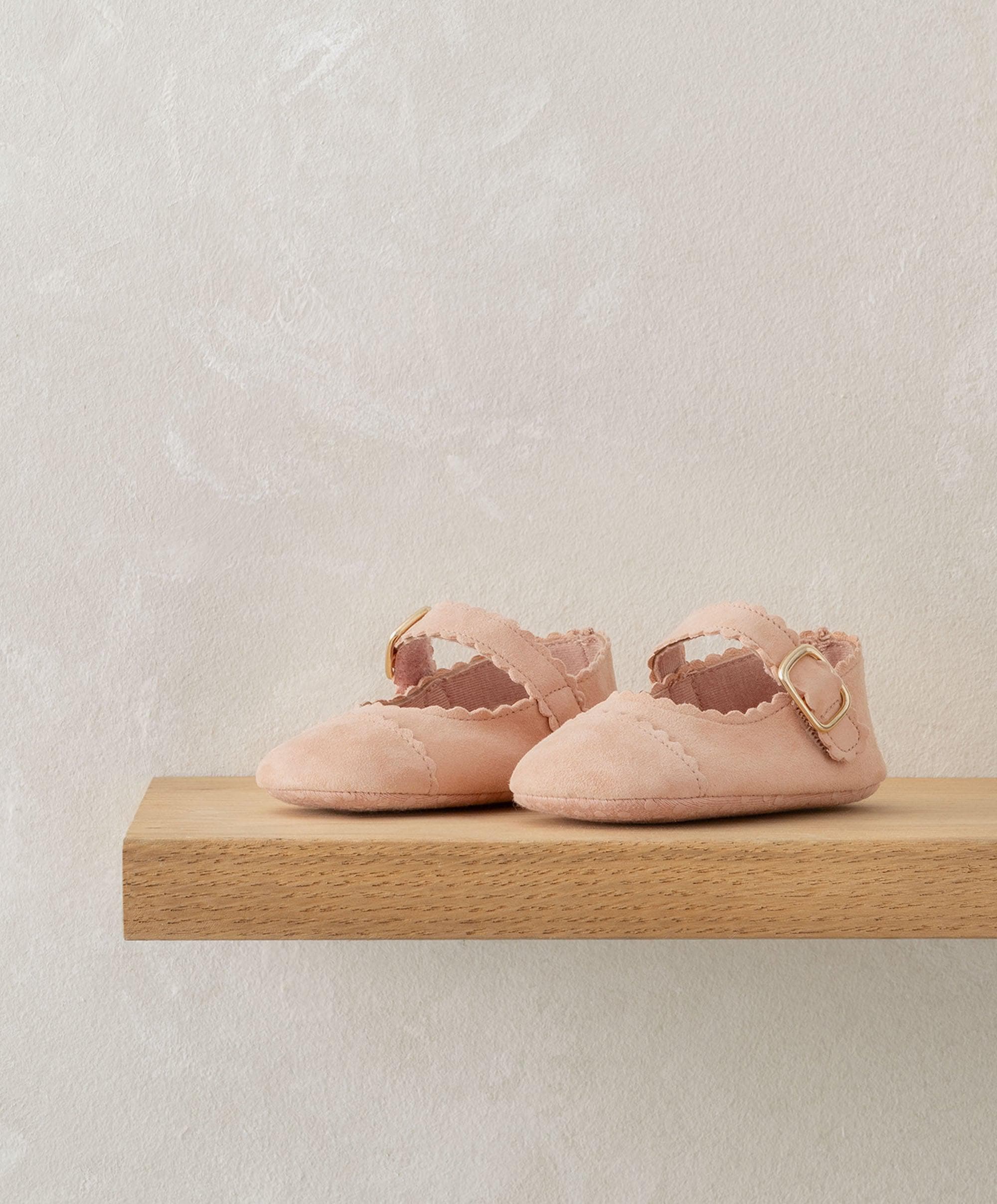 Pink Scallop detail pram shoe. Jersey sole with puff print. Strap with Velcro fastening and square gold buckle.