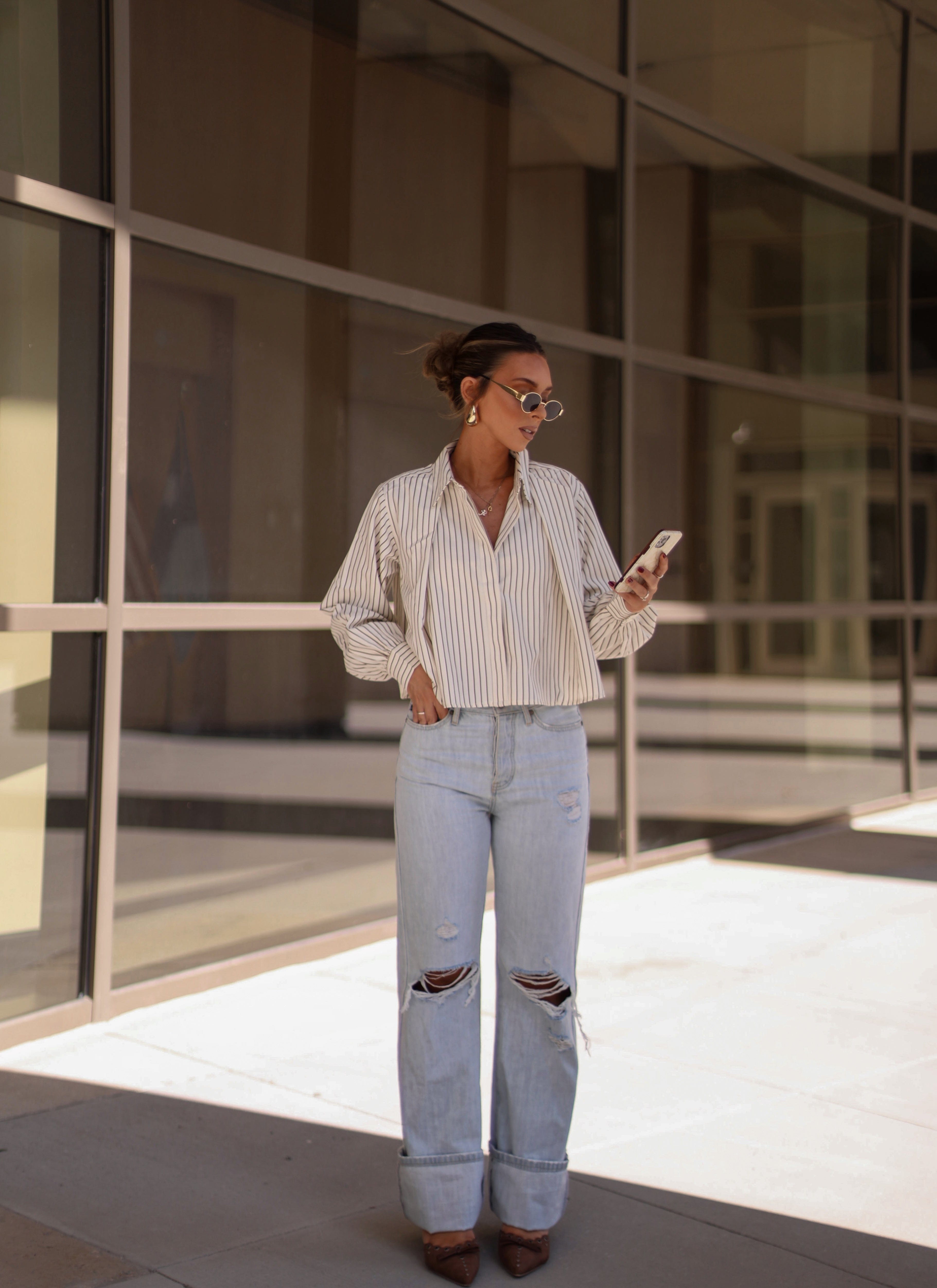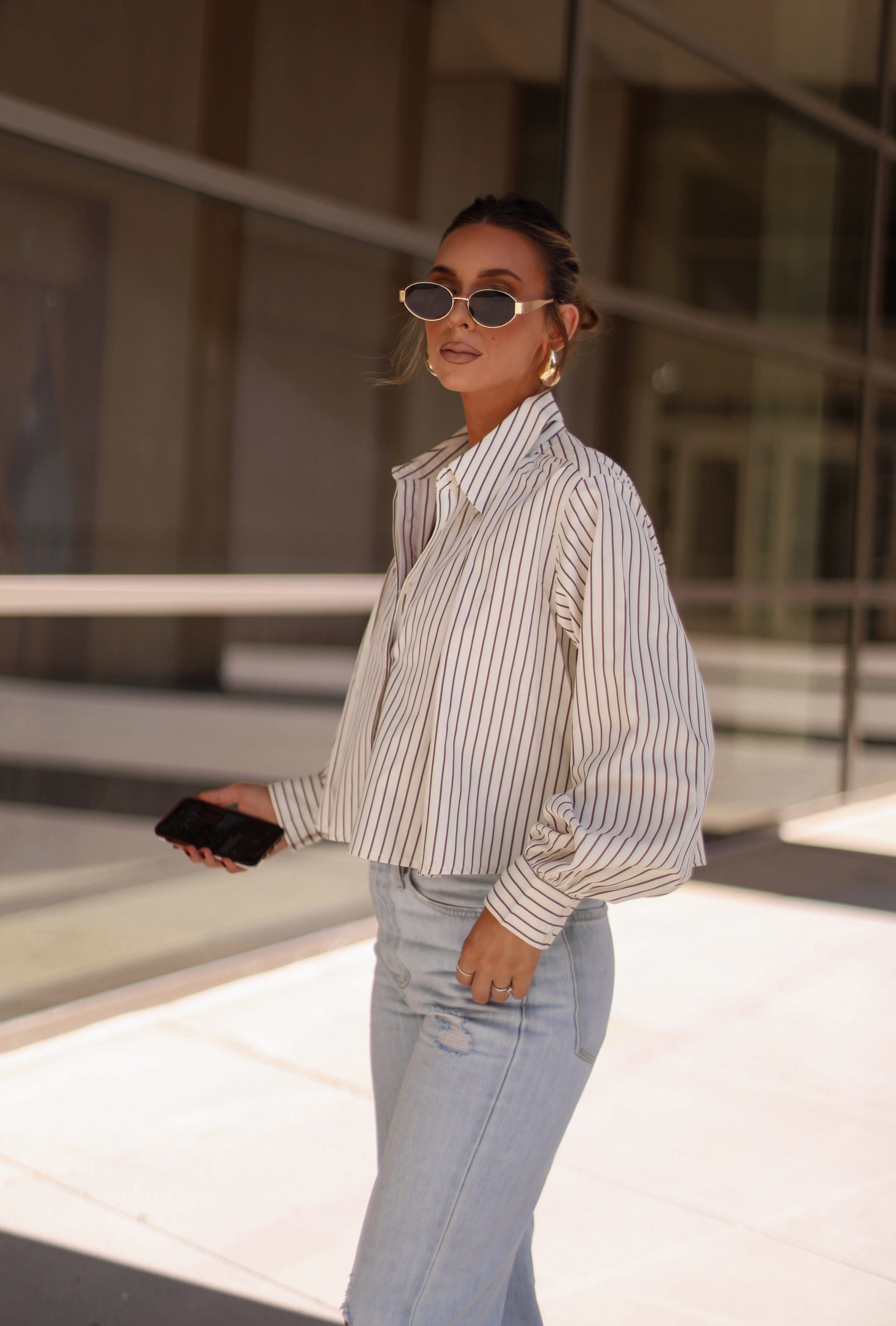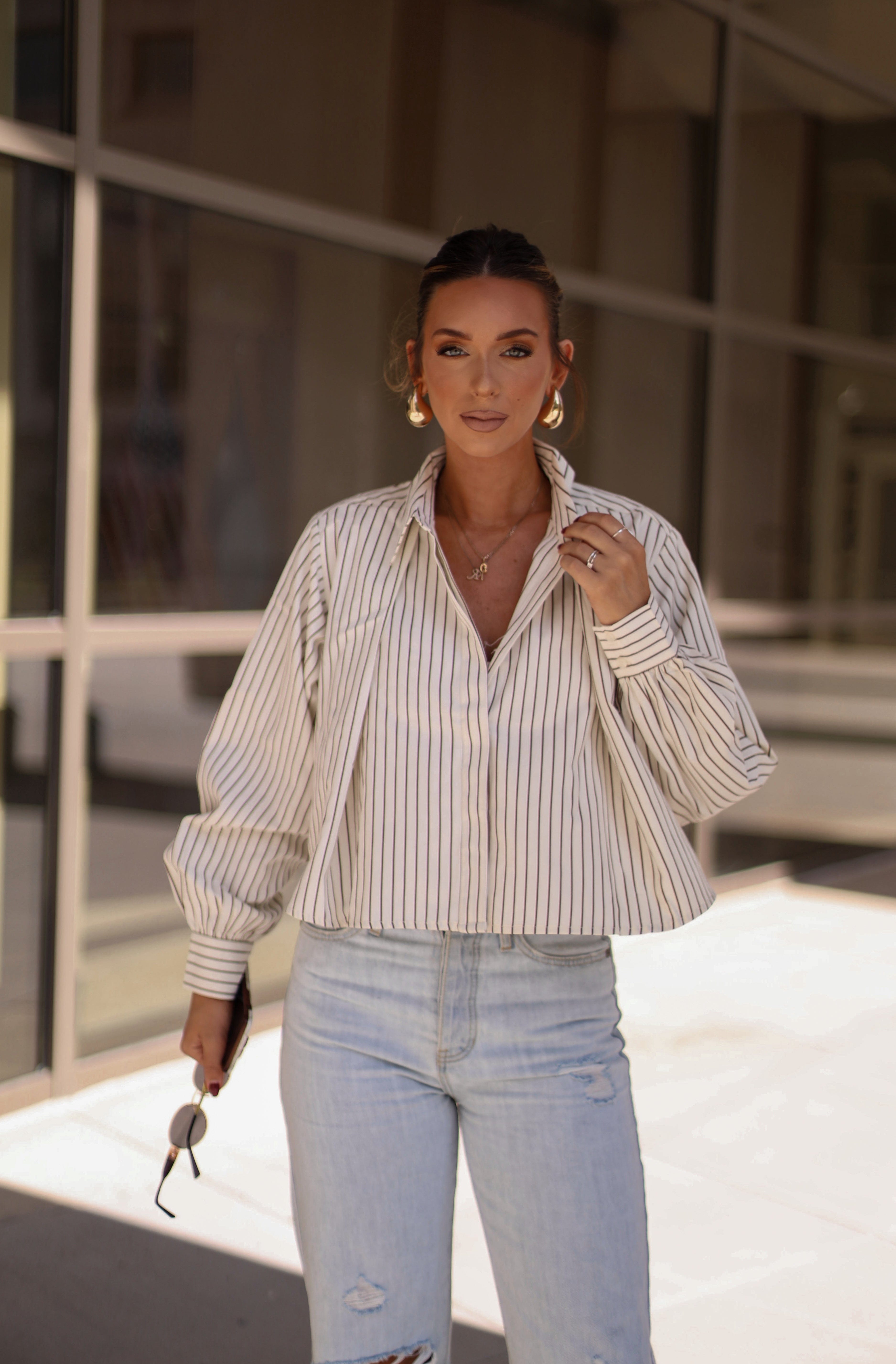 An expertly designed pleated striped button down with oversized sleeves. This top delivers a timeless style with a touch of modern flare. The pleats add dimension, while the stripes elongate the figure. The button down feature allows for versatile styling options. A must-have for any fashion-forward individual.