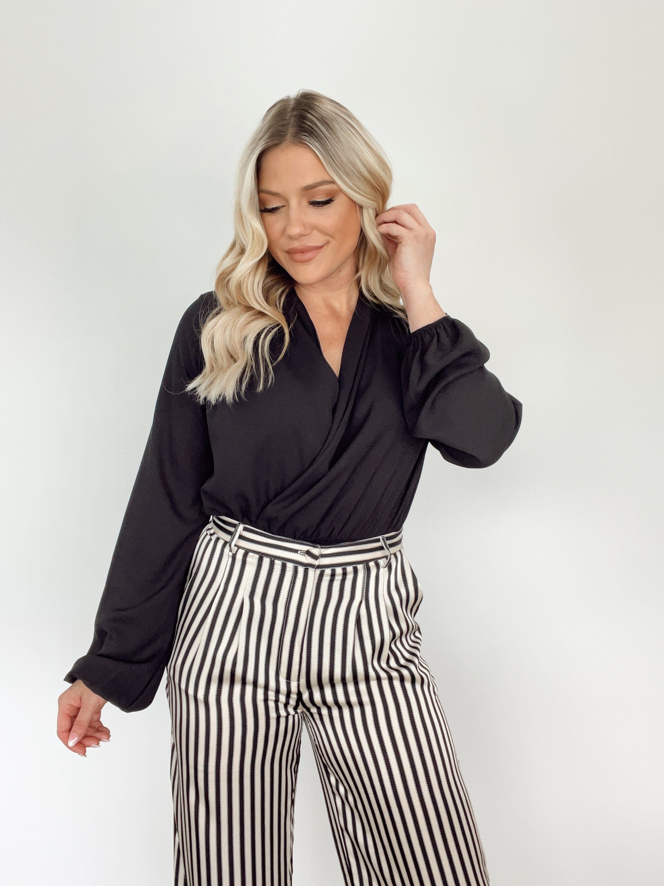 Make a statement in the Polished And Professional Bodysuit. This silky, sheer bodysuit features a sophisticated crossover and plunge neckline, making it perfect for creating a look that's both flirty and risk-taking. Dare to stand out and shine!