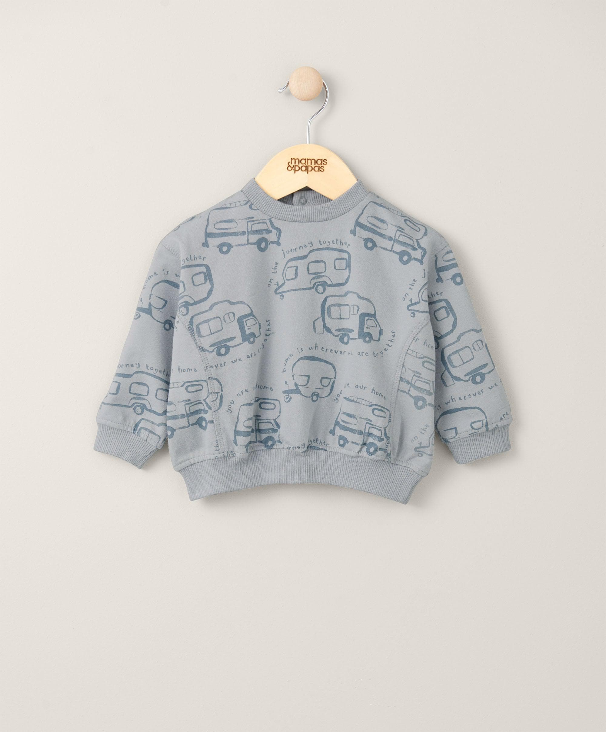Boys long-sleeved jersey sweatshirt. 'You are our home' all over print. Contrastig ribbed trim at hem and cuffs in tonal shade. Popper opening makes it super easy to dressed. Will pair perfectly with our 'You Are our Home' all over print sweatshirt. A lovely casual piece!