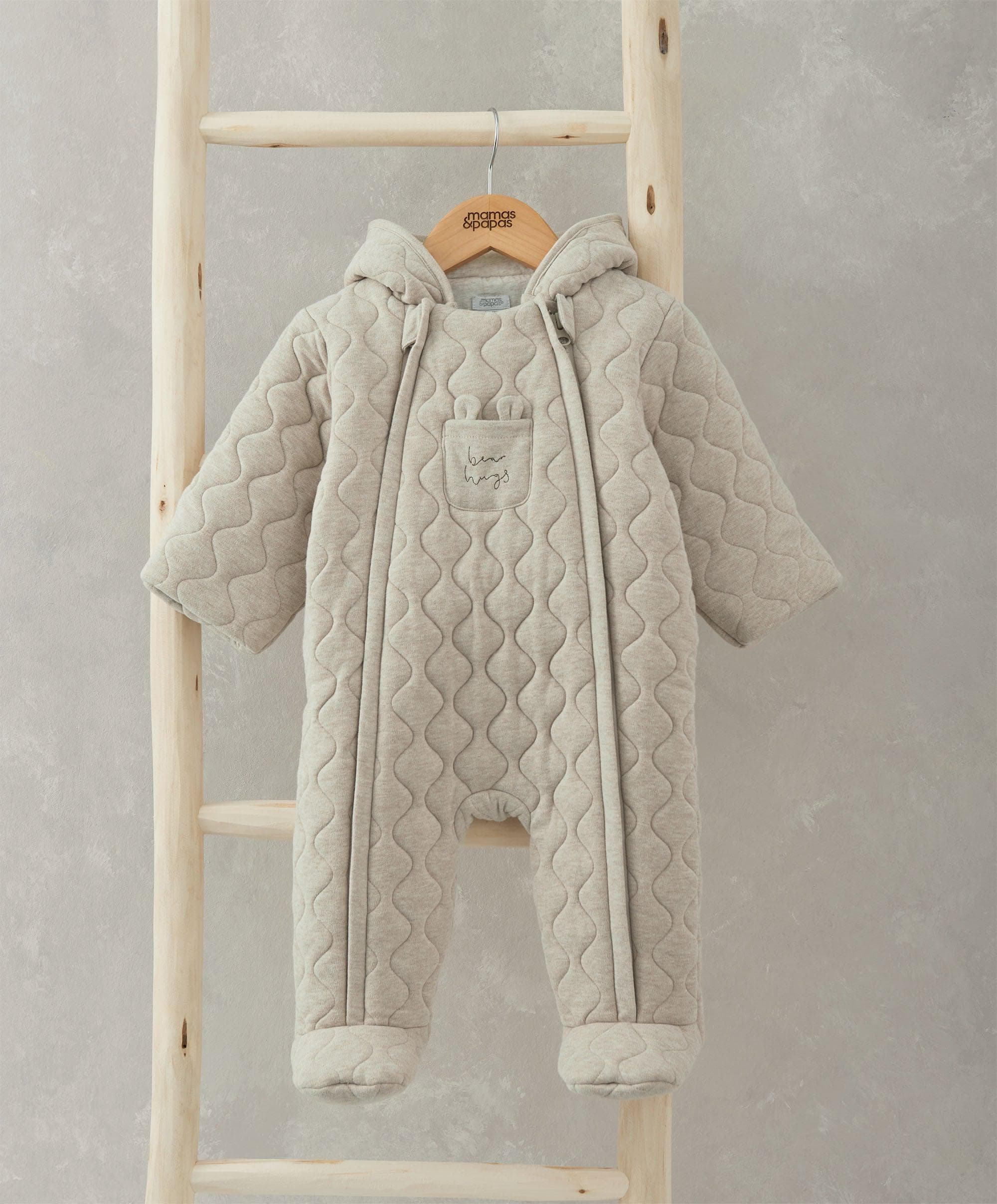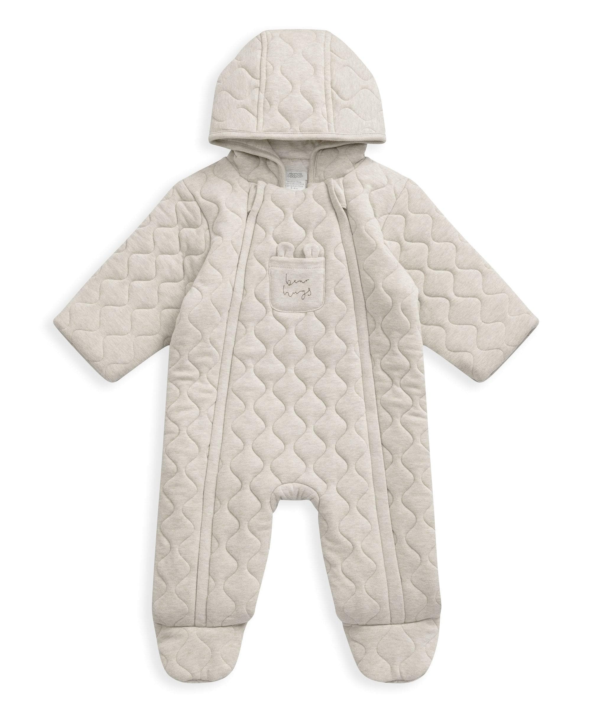 Keep them stylishly snug on outdoor walks in this beautiful oatmeal crafted quilted pramsuit. Ultra-soft and snuggly , with added features for extra warmth - integrated turn-back mitts and feet - with a zip for quick and easy dressing. Embroidered 'Bear Hugs' detail on the front pocket and 3D ear detail on the hood so your little one can look even cuter.