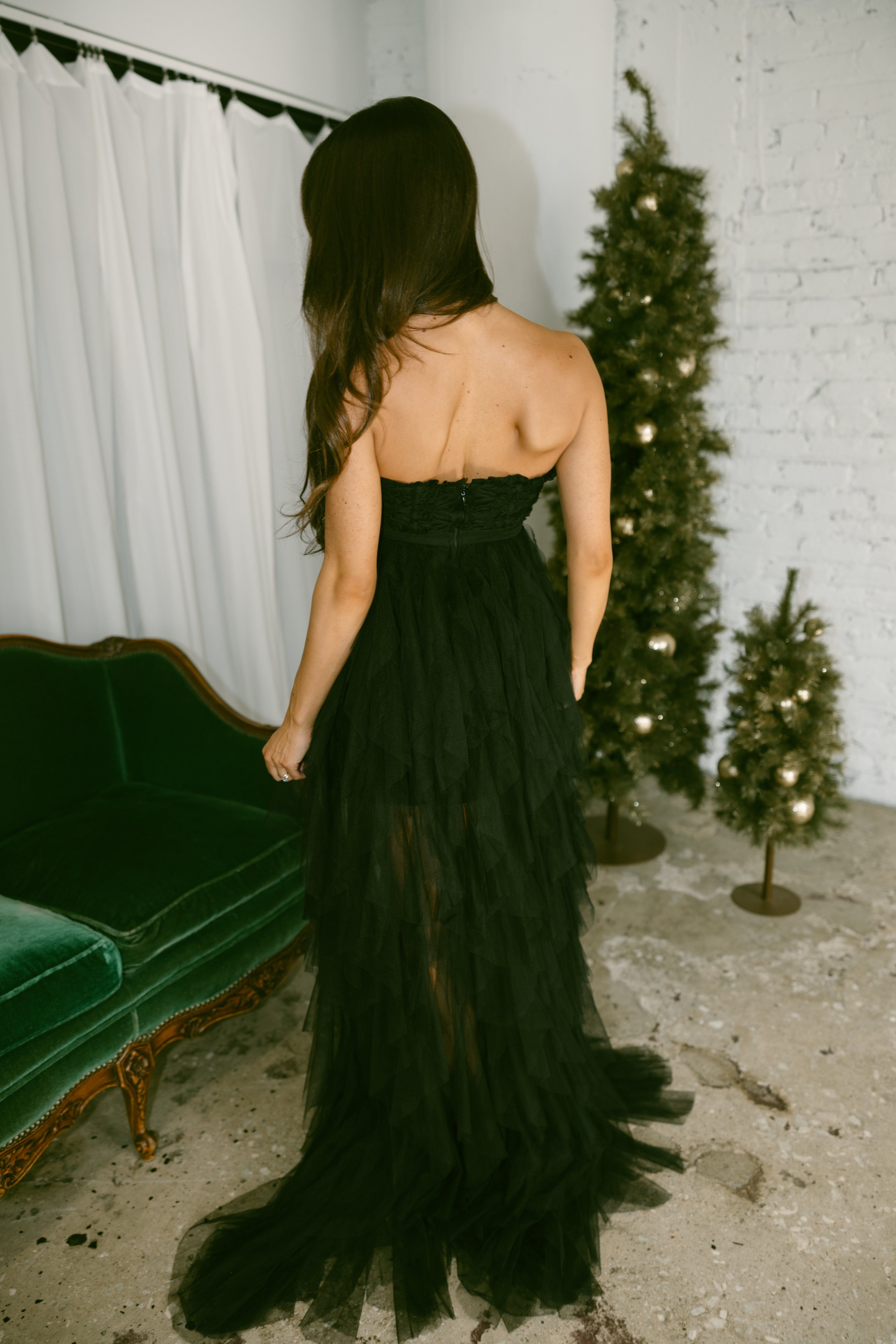 This strapless maxi dress features a stunning mesh train for added elegance. Perfect for formal occasions, this dress is sure to make a statement and turn heads. With its unique design and sophisticated style, the Regal Cascade Maxi Dress is a must-have for any fashion-forward individual.
