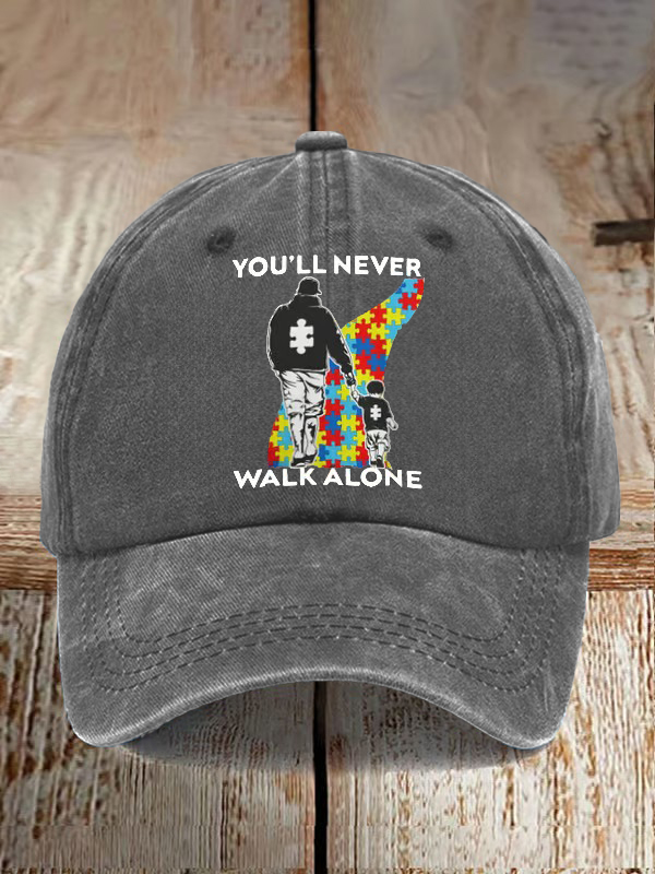 Retro Autism Awareness Dad And Son You'Ll Never Walk Alone Print Baseball Cap 9528662