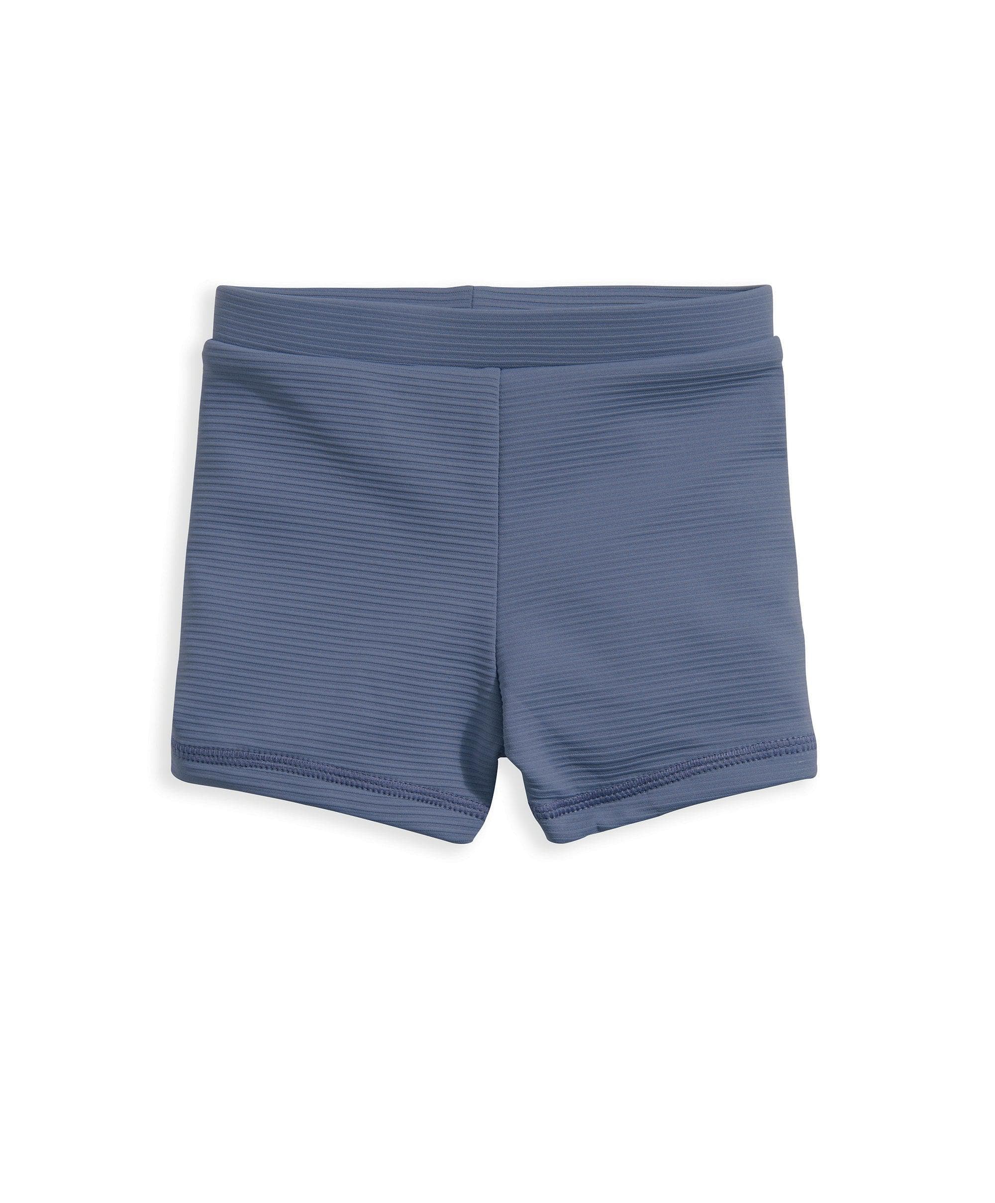 Boys' blue ribbed swim shorts. With elasticated waistband, for easy changing and comfy fit, featuring eyelets and drawcord detail. Matching rash-vest available.