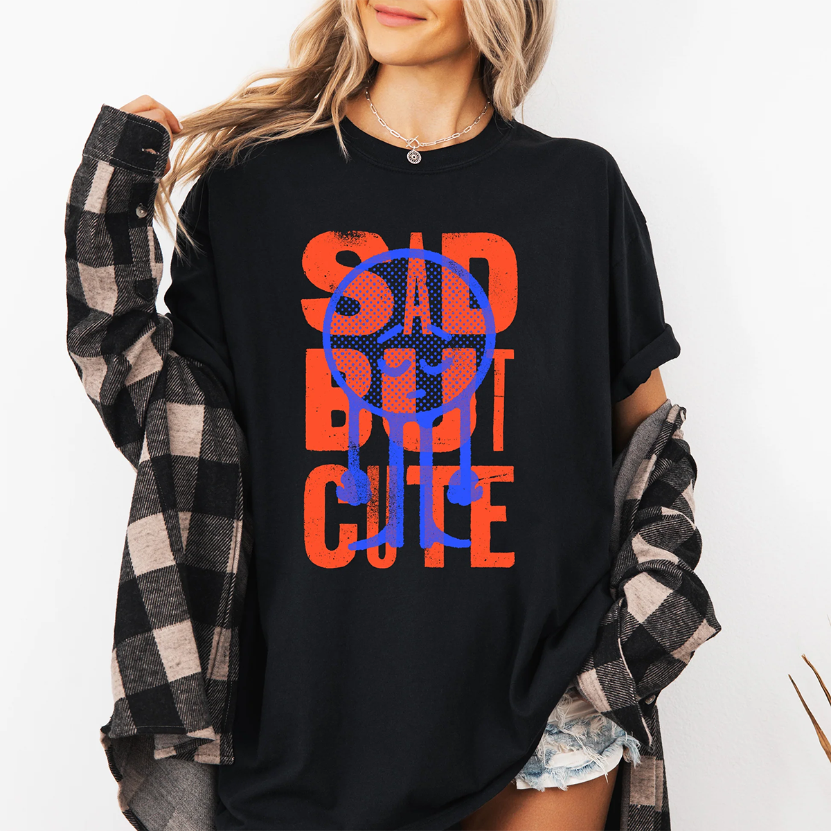 Sad But Cute Mental Health Smiley Positivity Funny Sarcastic Printed Round Neck Short Sleeve T-Shirt